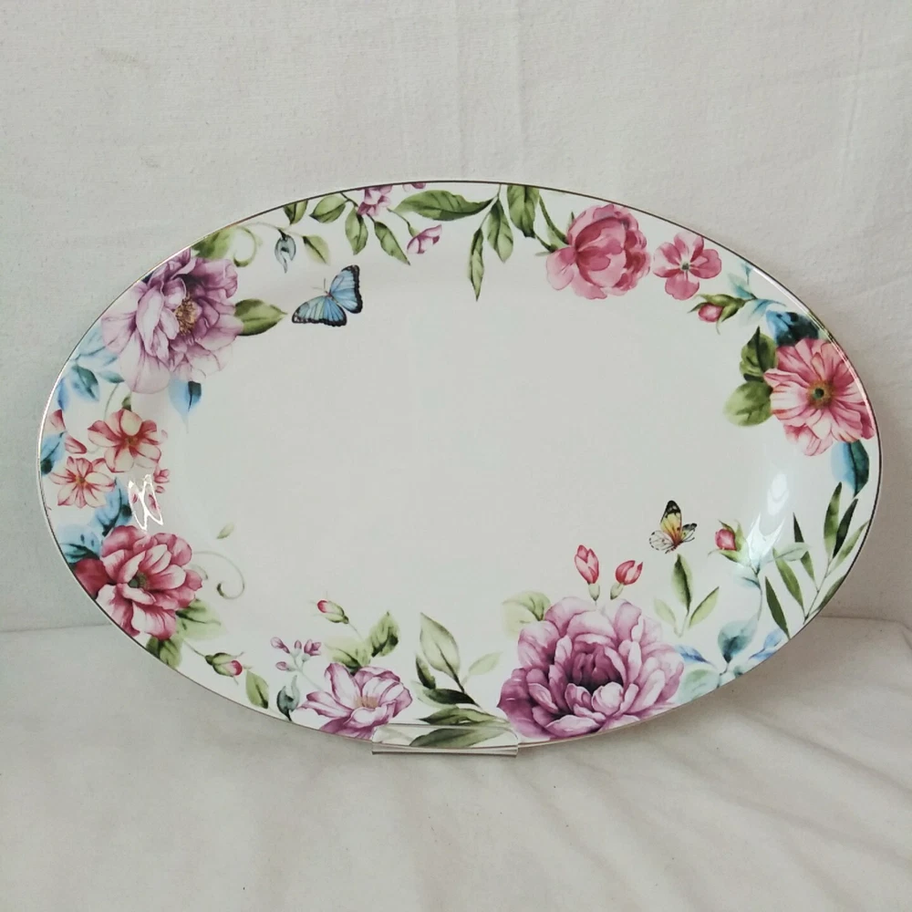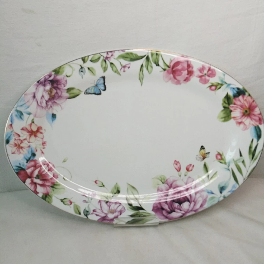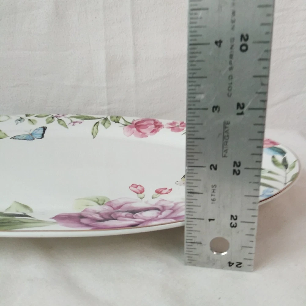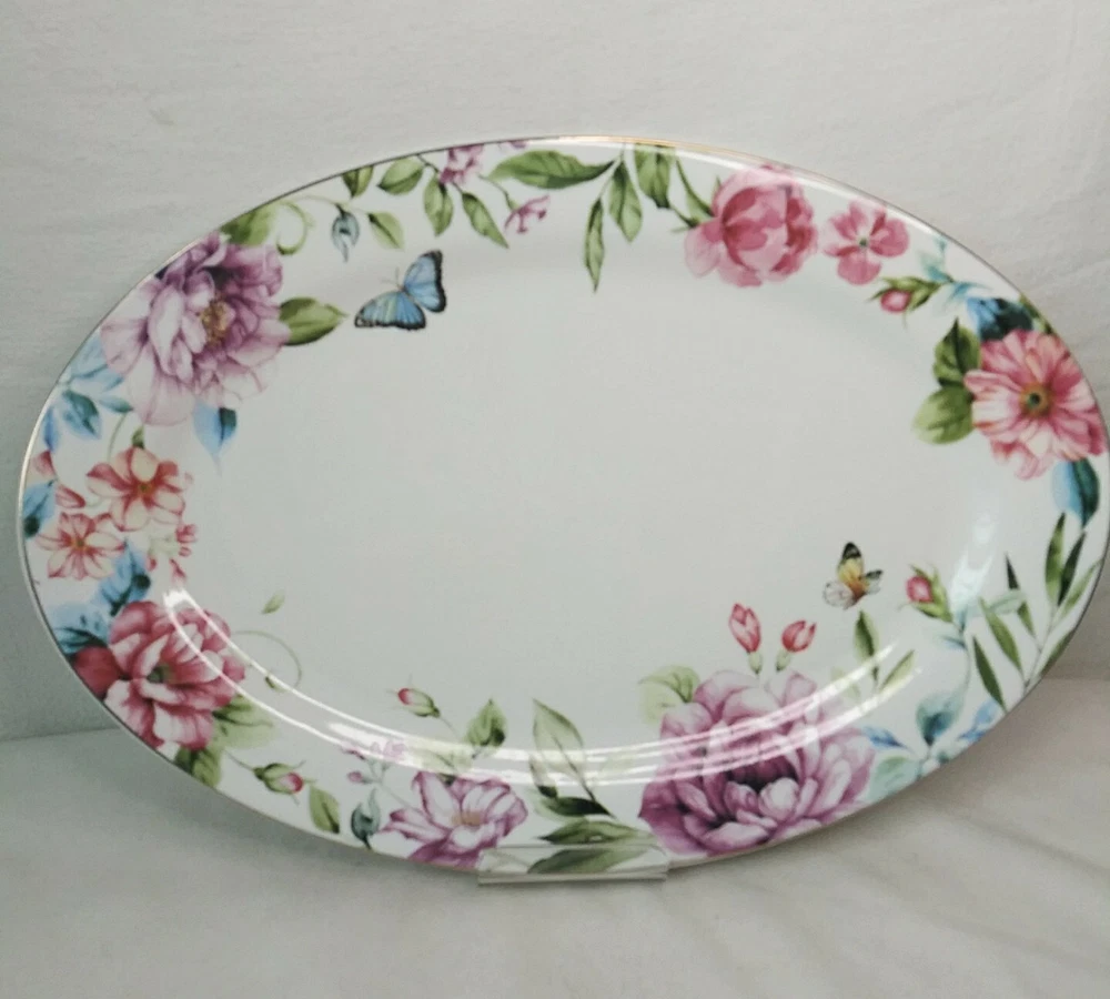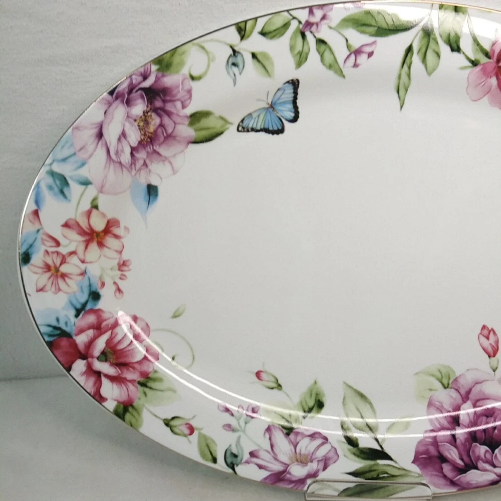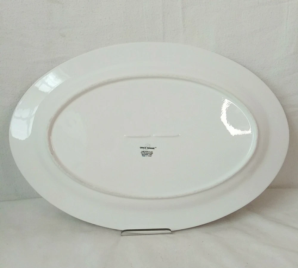 Grace Teaware Floral Oval Porcelain Serving Tray / Platter 14* 9.5"x 14" Really Good Condition Weighs 1 lb 12 oz Shipping USPS This beautiful Grace Teaware serving tray/platter is perfect for any tea party or gathering. The floral pattern in a variety of colors adds a touch of cottage style to any occasion. Measuring 14 inches in length and 9.5 inches in width, this small oval-shaped piece is made of glossy porcelain material. The tray is microwave and dishwasher safe, making it convenient for use and cleaning. Its multicolor design and wild rose theme make it a great addition to any collection. This piece is perfect for serving tea or other beverages and is sure to impress your guests.