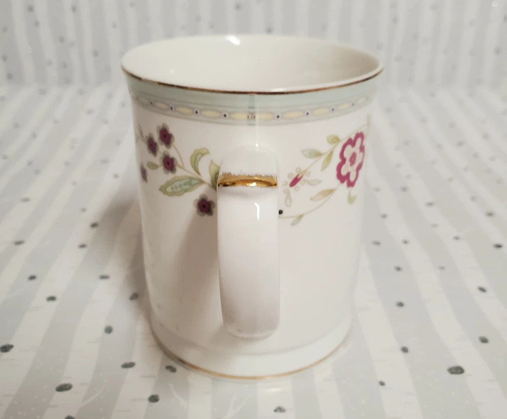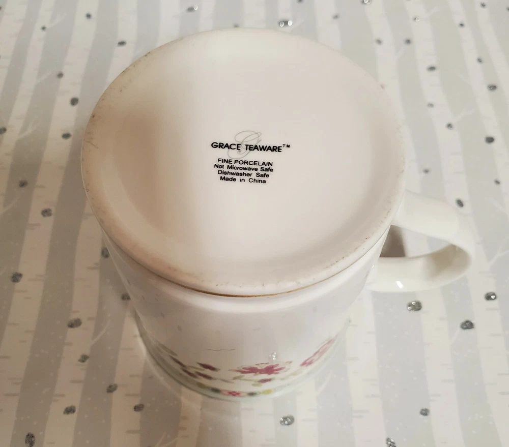 Grace Teaware Set of 2 Fine Porcelain Mugs White, Floral & Gold Rims 12 oz each . Rim of mug is gold. The handle also has a piece of gold color. Dishwasher safe. Not safe for microwave. Made in China. FREE SHIPPING