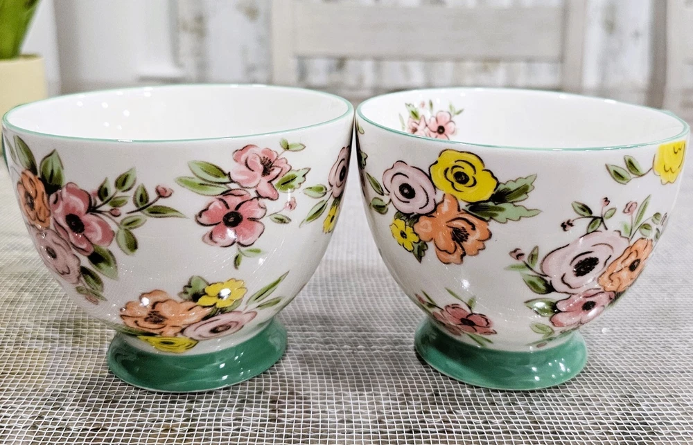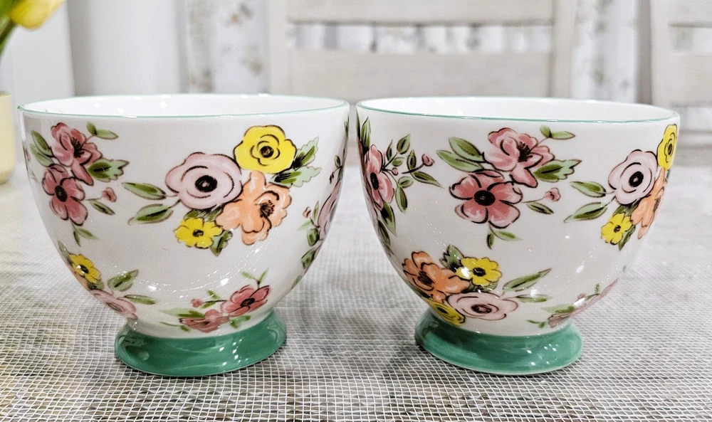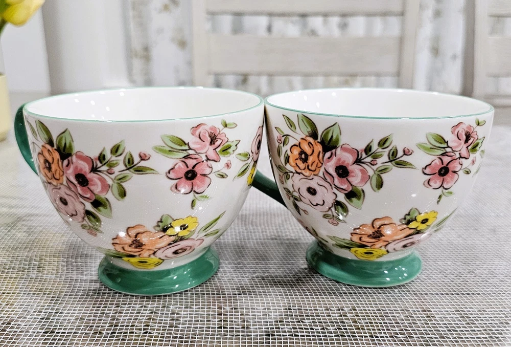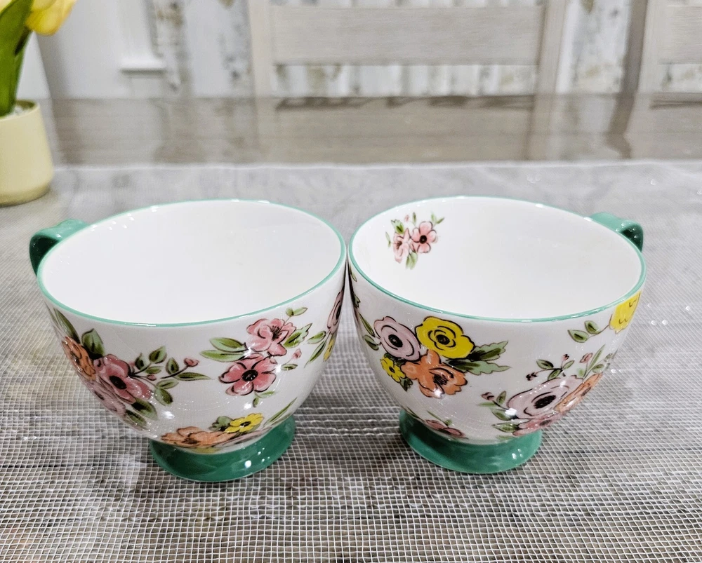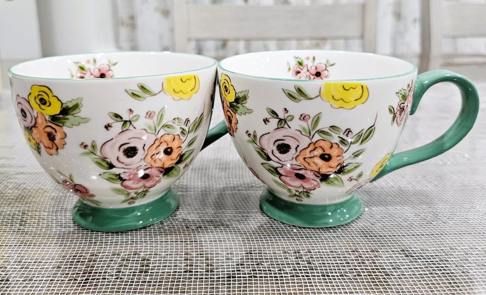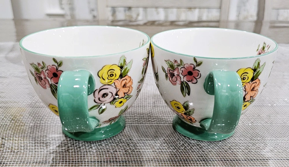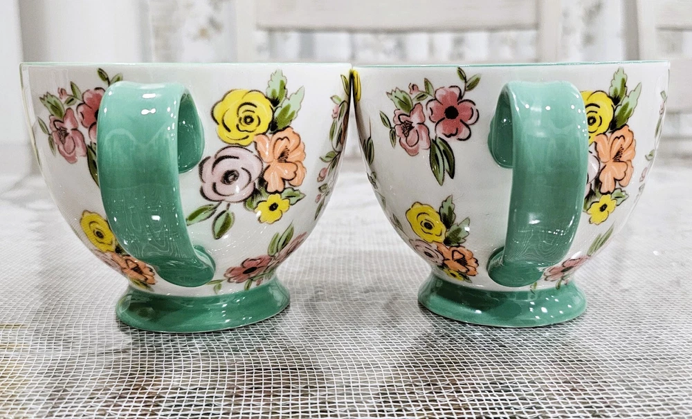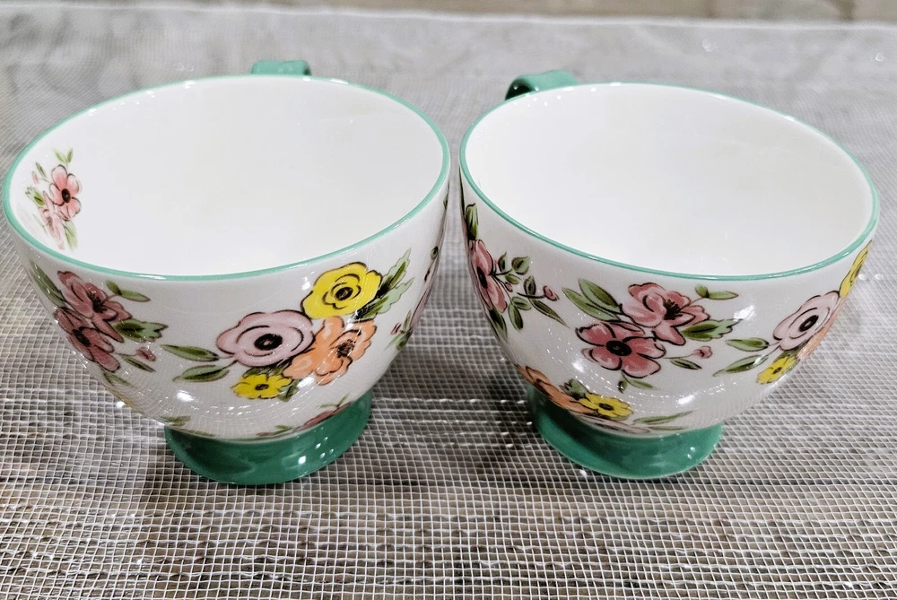 Grace Teaware Set of 2 Footed Mugs White Aqua Multicolor Floral 12 oz each. Features aqua color around the rim, foot and handle. Dishwasher and microwave safe. Made in China. FREE SHIPPING