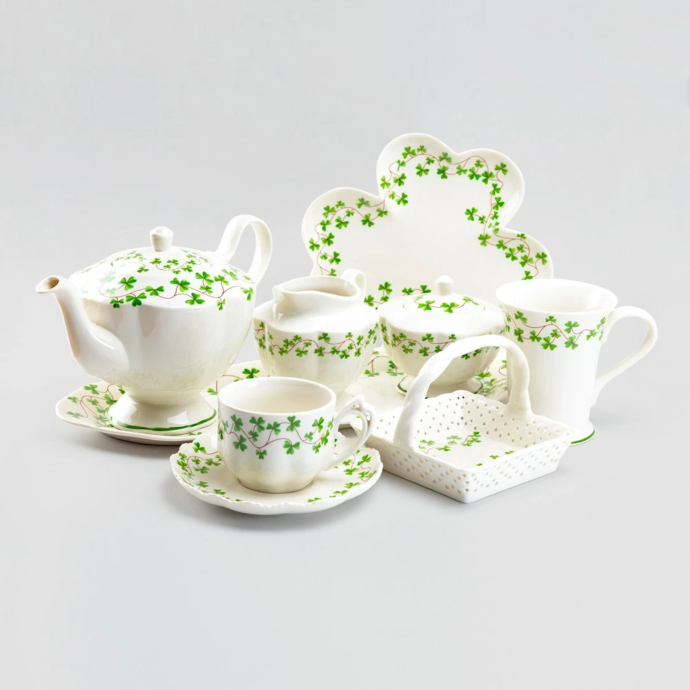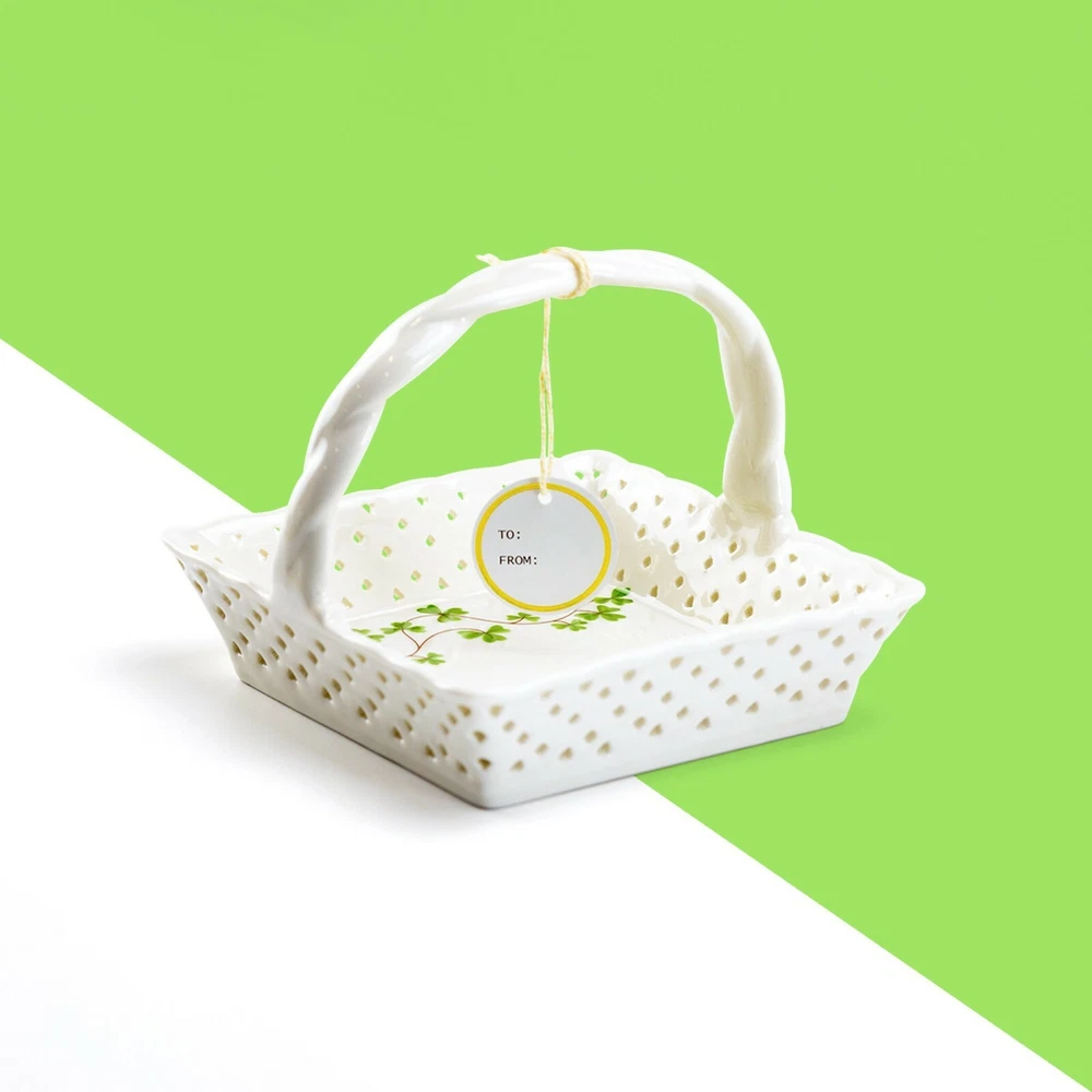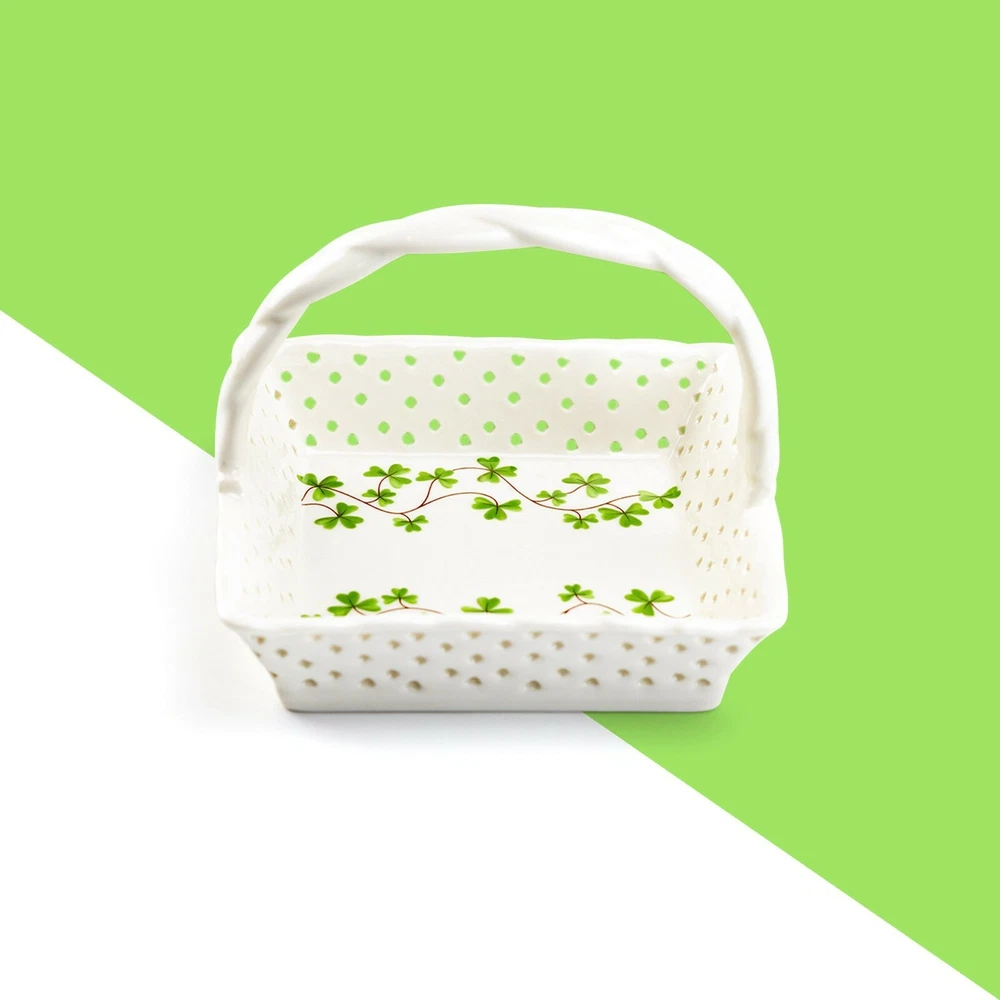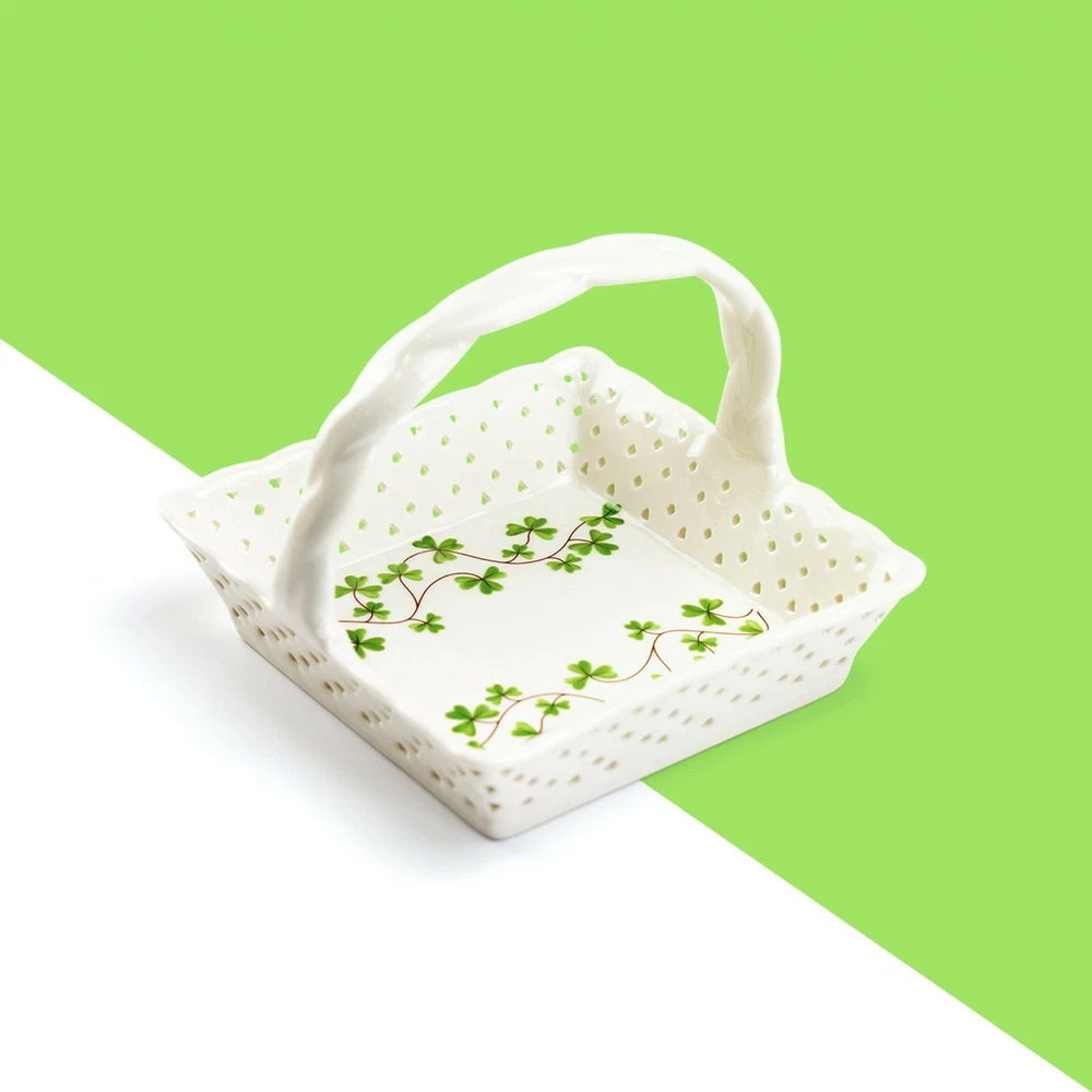 Hand Crafted Pierced Basket with Twist Handle Basket Dimension: 3.75” Height x 5” Width x 5” Depth Dishwasher Safe Hand wash recommended Shamrock tea set, teapot, cup and saucer, mug, serving plate and tray are also available in our shop! Make it a set! Hand wash recommended Founded in 2011, Gracie China Shop has delivered tens of thousands of beautiful, elegant and high quality tea sets, dinner ware, serve ware all around the world with passion and appreciation.