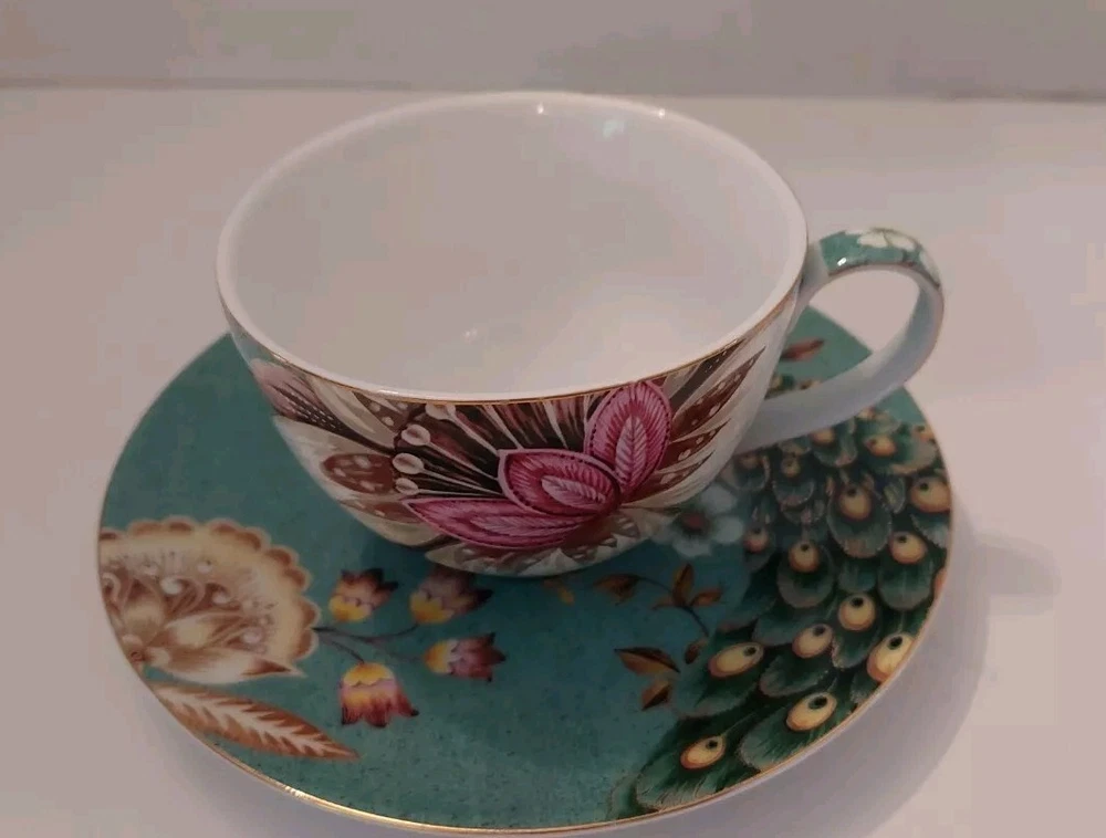 Very pretty teacup and saucer set with a Peacock and flower design. No chips or cracks. See photos for complete description, measurements, and condition