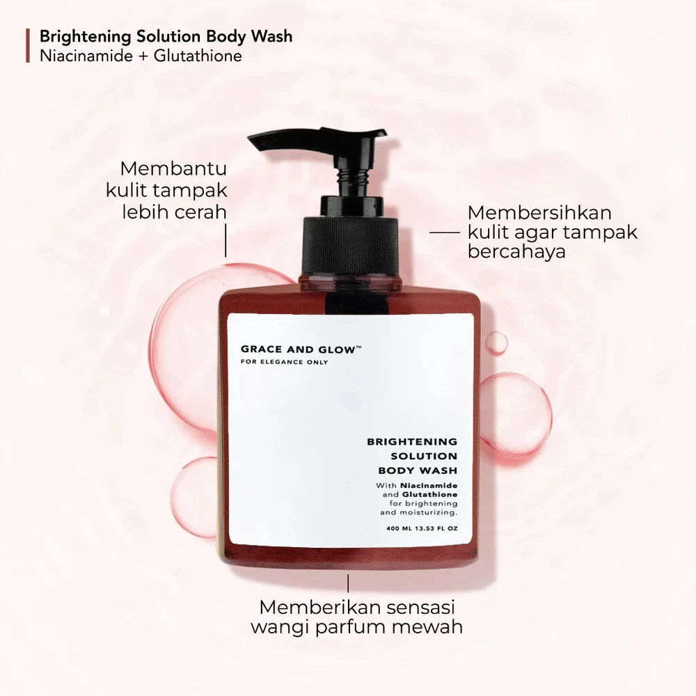 Grace and Glow Brightening Solution Body Wash Netto: 400 ML 1. BENEFITS Helps skin look brighter Provides a luxurious perfume sensation Cleanses skin to look radiant 2. MAIN COMPOSITION Niacinamide Glutathione 3. HOW TO USE Pour enough Body Wash on your hands or shower puff, gently rub slowly and clean all parts of the body, let stand for 30 seconds. Rinse with water. Use every day for maximum results