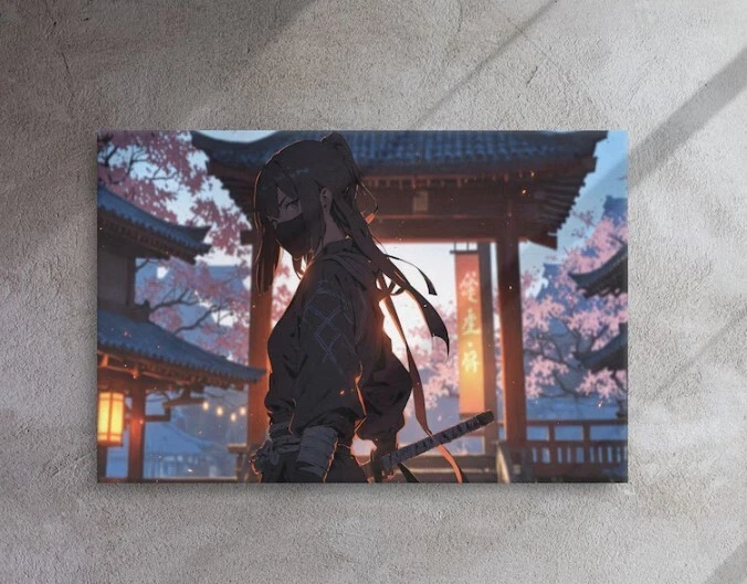 Graceful Ninja Assassin - Moonlit Rooftop in Japanese Village with Cherry