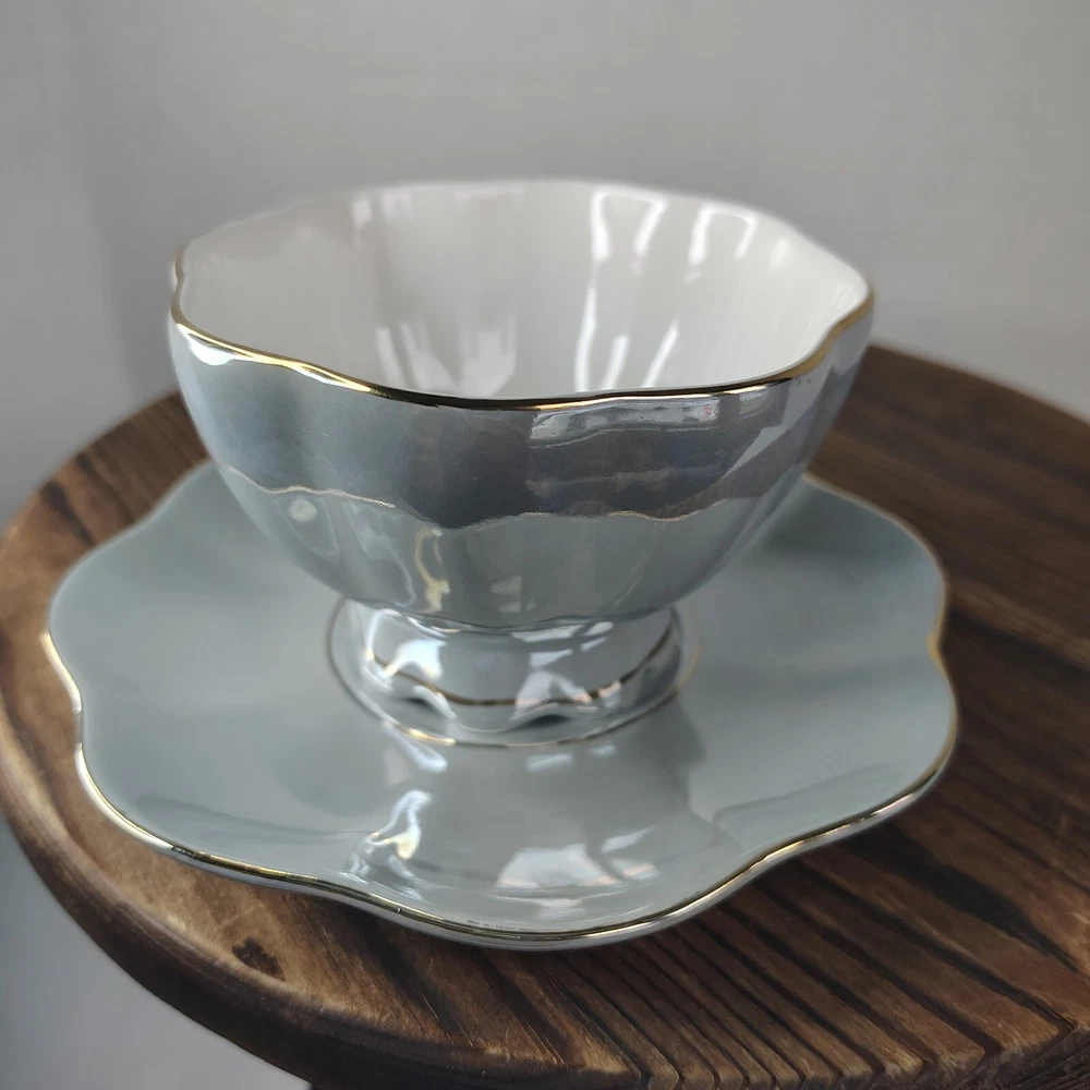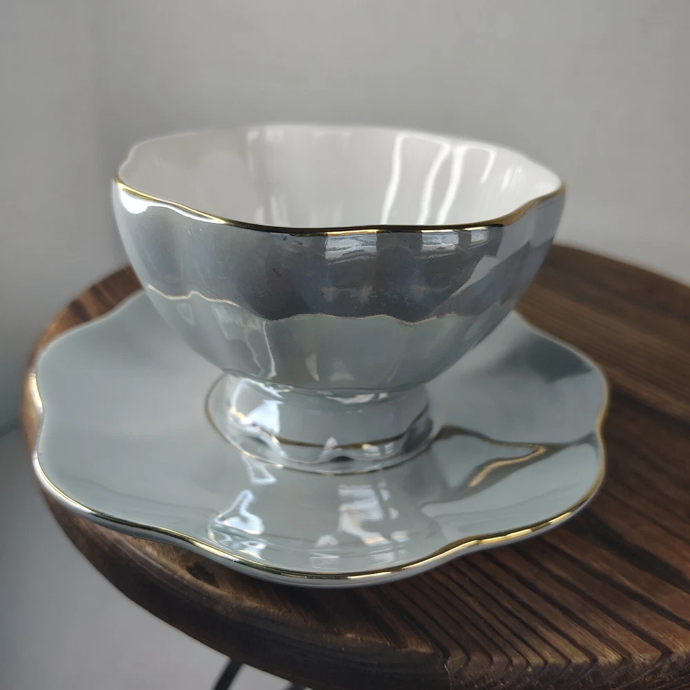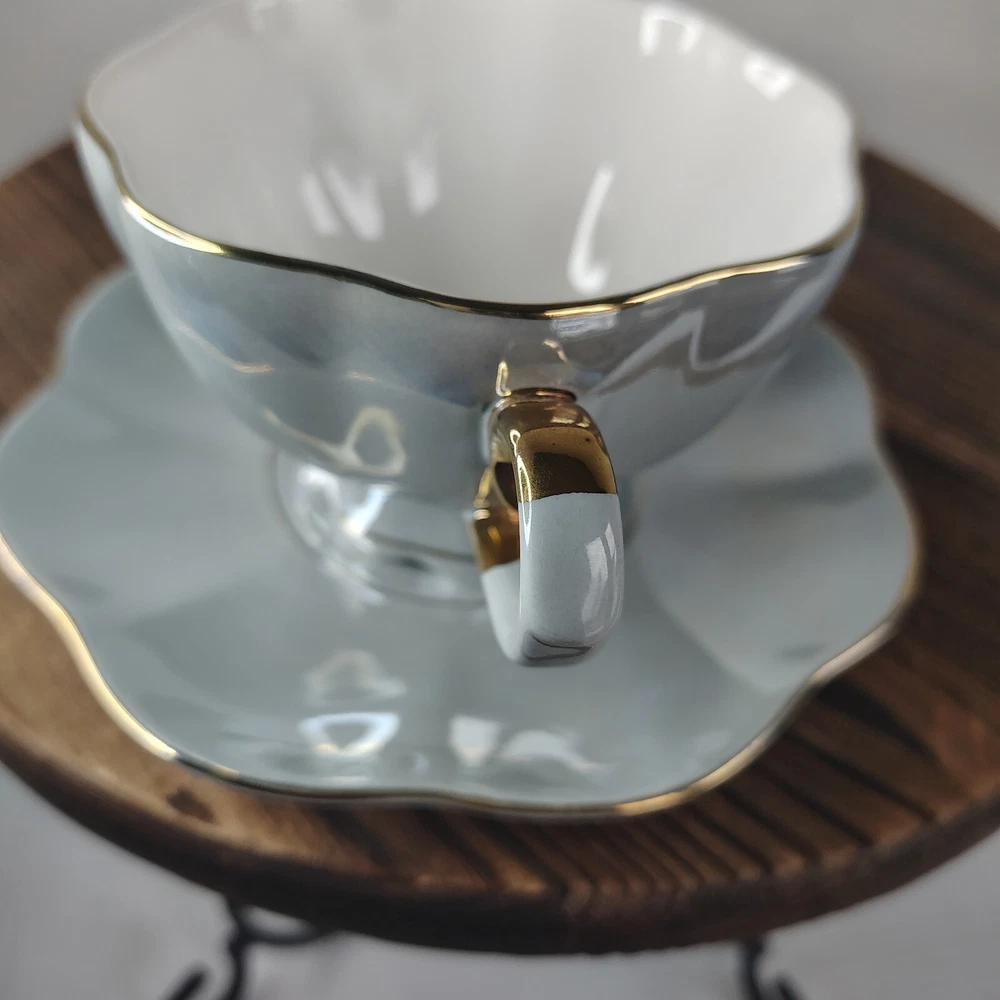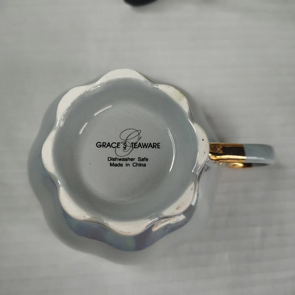 Grace’s Teaware Blue Iridescent Tea Cup and Saucer Scalloped Edge Gold Rim
