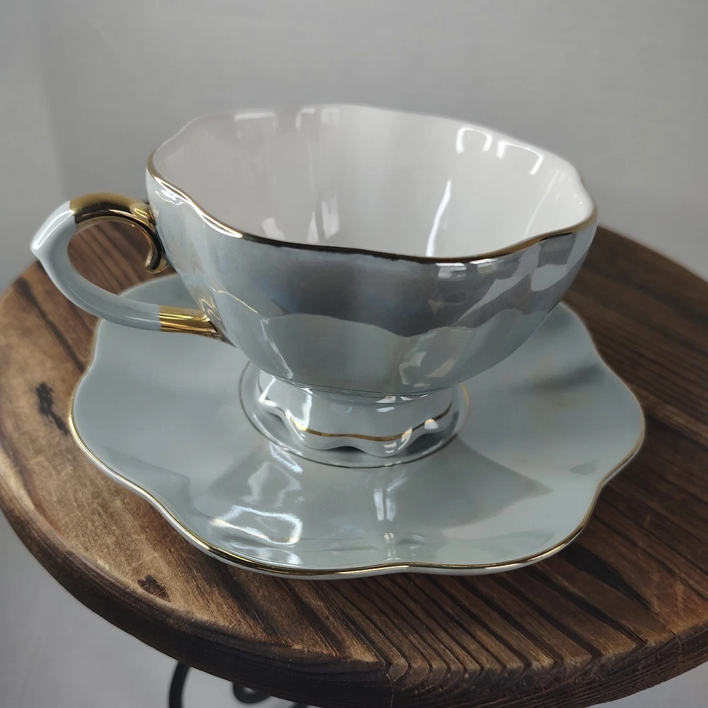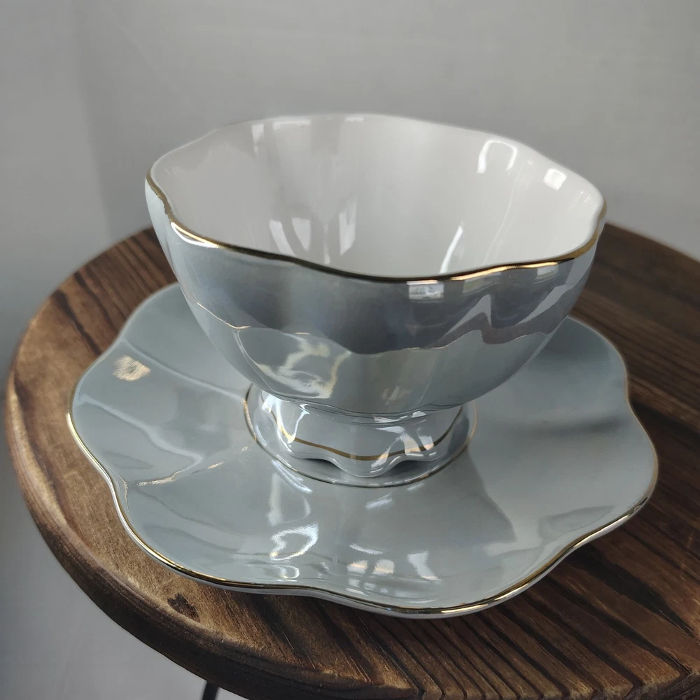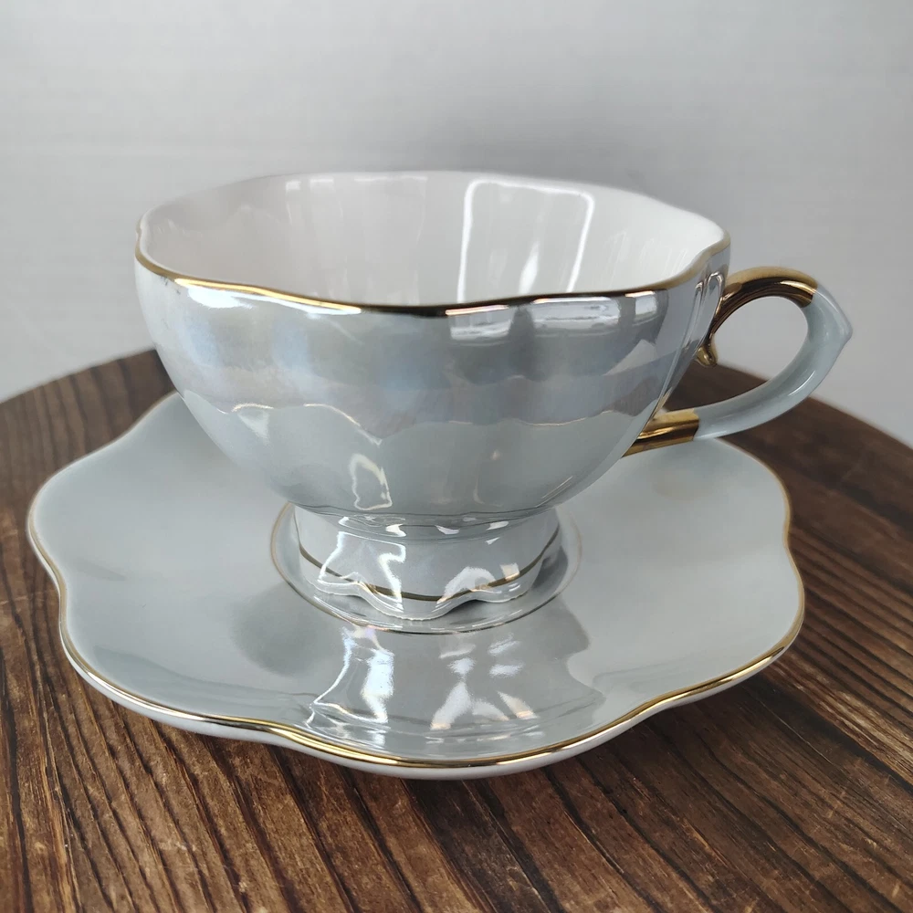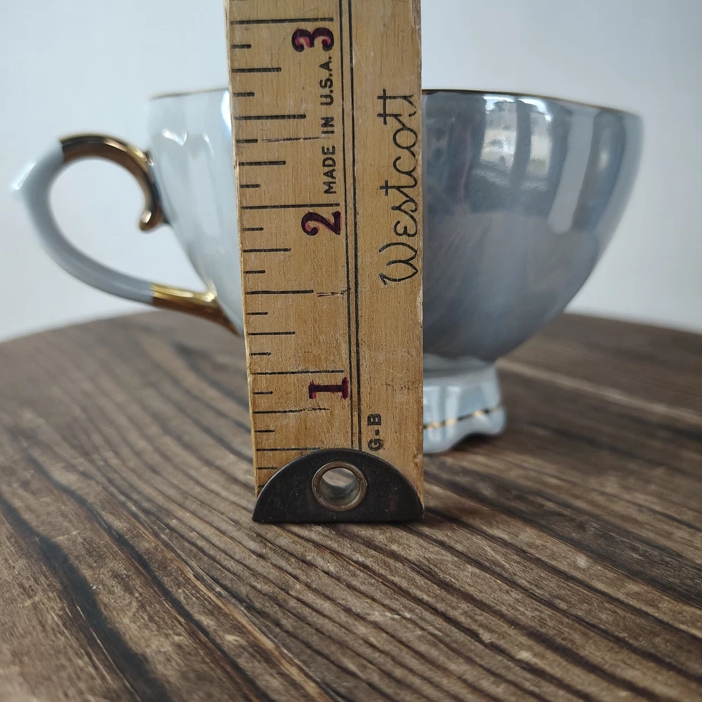 Grace’s Teaware Blue Iridescent Tea Cup and Saucer Scalloped Edge Gold Rim
