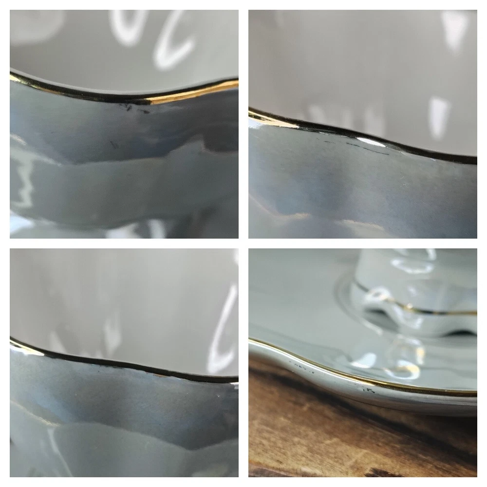 Scratches and marks on the teacup and saucer. Please see measurements and review all pictures provided which show condition and zoom in to get a closer look. Let me know if you have any questions! : )