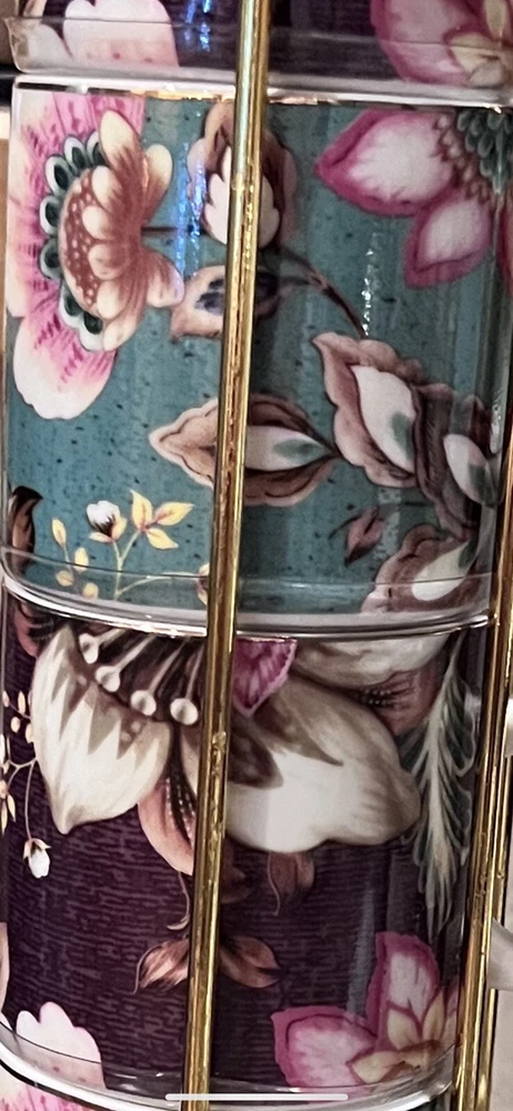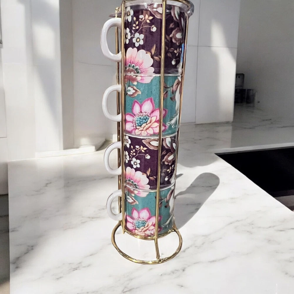 Enhance your tea, coffee, or espresso drinking experience with these stackable cups from Grace's Teaware. The floral pattern and multicolor design add a touch of elegance to your table setting. Made of high-quality porcelain, these cups are durable and perfect for daily use. The set includes four cups and a stand, making it ideal for serving tea, coffee, or espresso to your guests. These cups are stackable, making them easy to store and transport. Perfect for home or office use, these cups are a great addition to your kitchen, dining, or bar collection. Cups are smaller in size approx. 4 to 5 oz.
