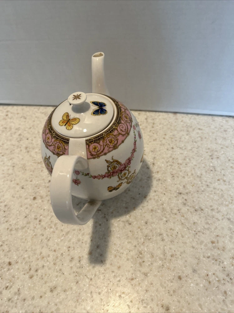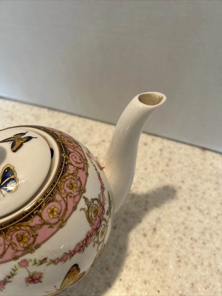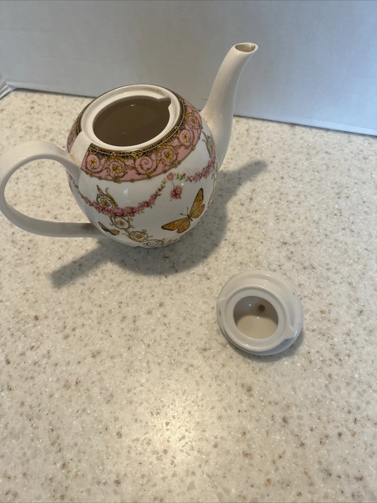 This beautiful teapot from Grace Teaware is perfect for any tea lover. With a charming pink butterfly design, this ceramic teapot stands at 5 inches tall and is ready to serve. The toleware style adds a touch of vintage charm to any tea time. Whether you're collecting or just enjoying a cup of tea, this Grace Teaware teapot is a must-have. The brand is known for their quality ceramics, and this teapot is no exception. Add a pop of color to your kitchen with this adorable pink teapot.