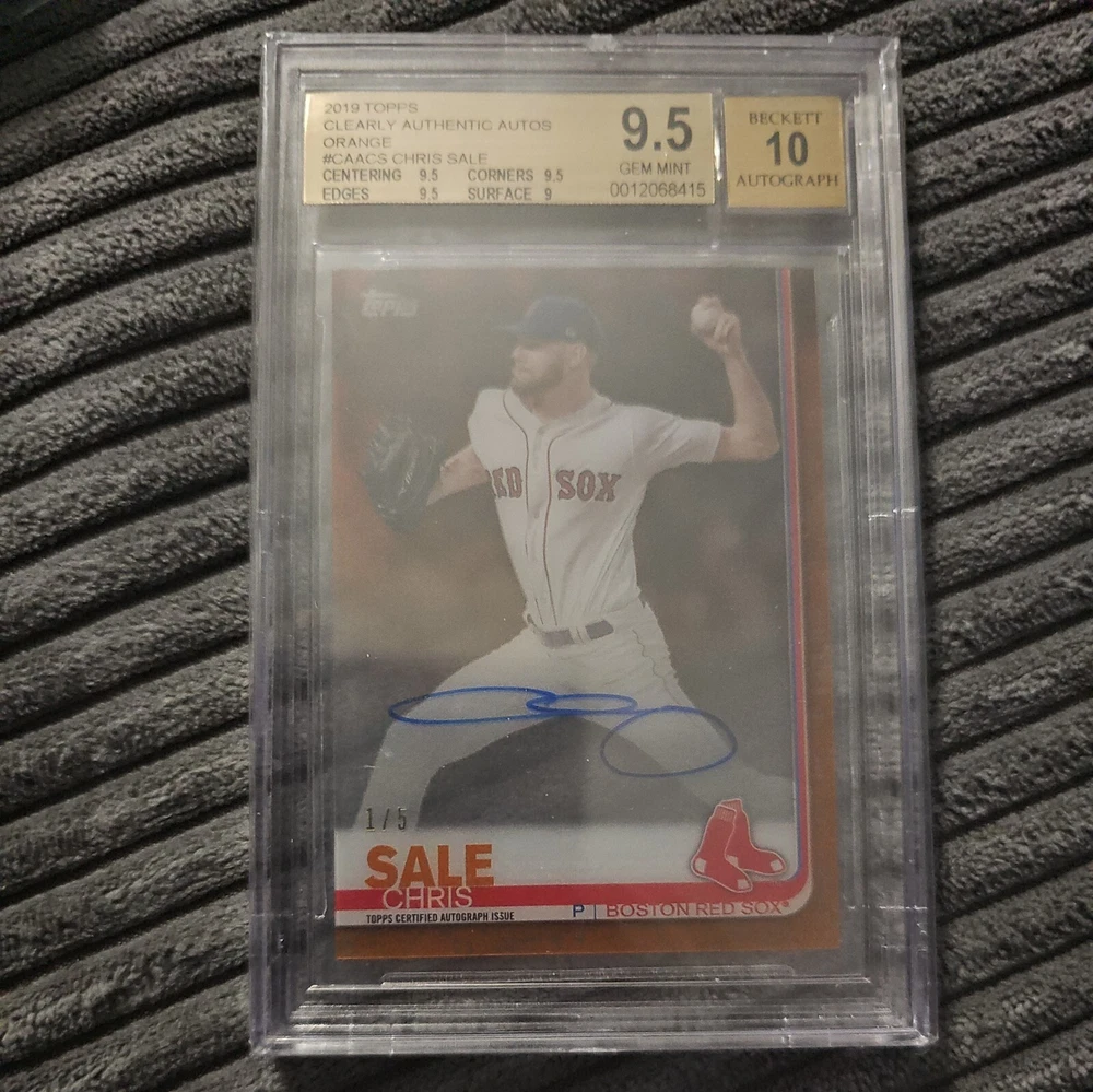 This 2019 Topps Clearly Authentic sports trading card features Chris Sale, a Boston Red Sox player. The card is autographed and has a print run of /5, making it a rare find for collectors. It is also graded 9.5 by Beckett Grading Services (BGS) and comes with an orange parallel/variety. The card is an original from the manufacturer, Topps, and has a serial number. It is part of the 2019 Topps Clearly Authentic set and is a must-have for any baseball card collector. Don't miss out on the opportunity to add this unique card to your collection! Gem Mint 9.5 Beckett Autograph 10 Rare/5