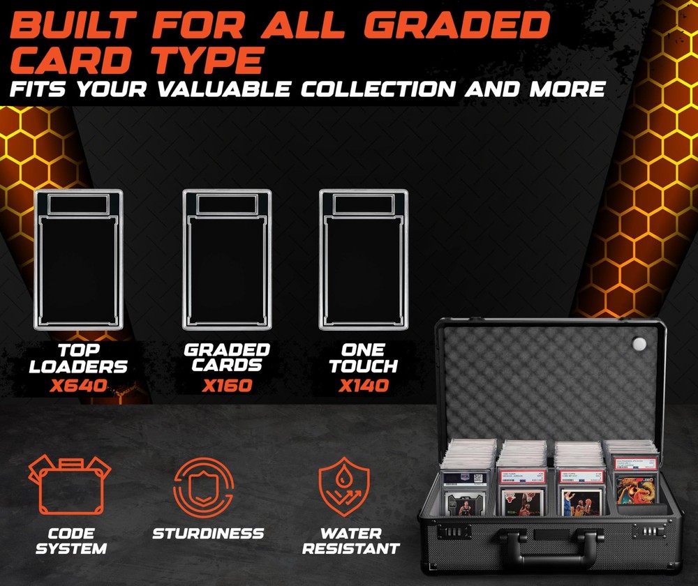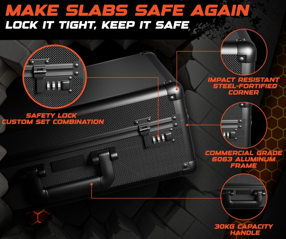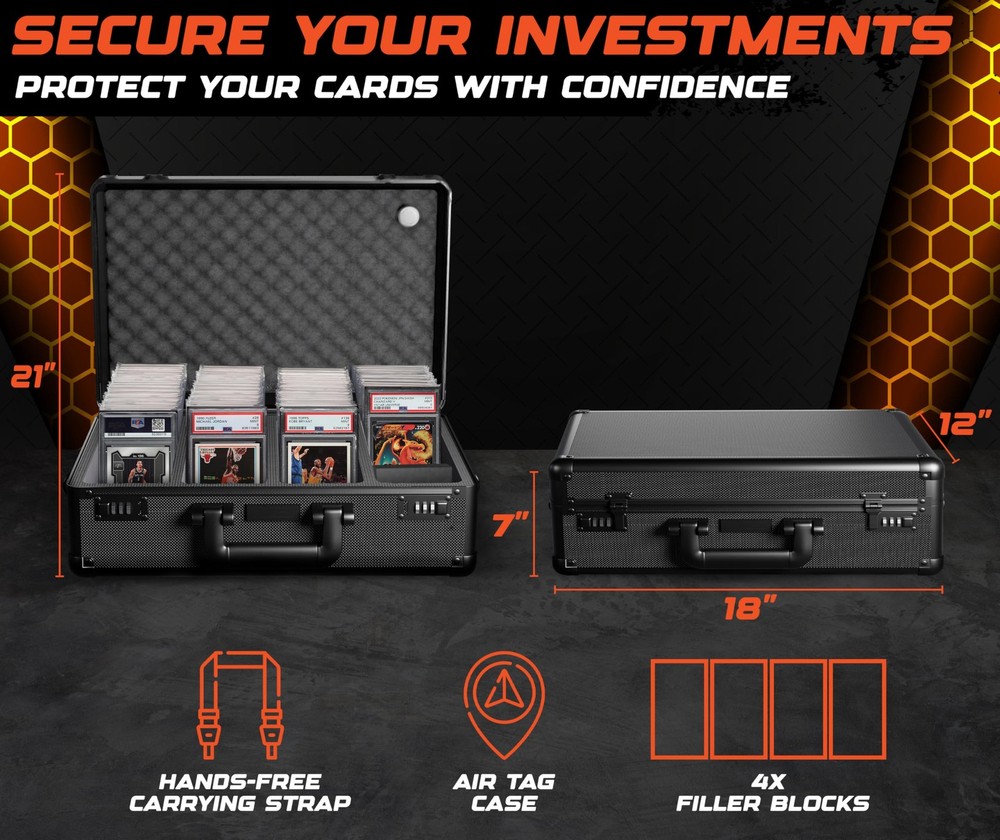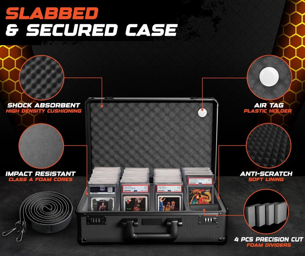 graded card storage box is built for serious collectors who need protection they can count on. card slab case, PSA slabs, trading cards, photocards. durable shell shock absorbent foam help protect your collection from dust, moisture impact. Whether used as a baseball card hard case or as a trading card case, keeps your valuables in great shape at home on the go. Designed for Convenience & Durability Crafted from commercial grade aluminum with reinforced steel corners, this card carrying case is made to last. outer shell resists damage while maintaining a lightweight feel. A detachable shoulder strap adds hands-free convenience, integrated AirTag holder helps card collection box wherever you travel. This model also features dual combination locks, delivering secure storage you'd expect from a premium slab case for graded cards. Custom Interior for Better Organization sports card case, you’ll find soft lining, shock-resistant foam filler blocks. These elements work together to hold cards in place minimize shifting during transit. interior adapts to fit a range of slab sizes, ideal card storage case for collectors with diverse card types evolving collections. 2, 3, 4 compartment layouts to match your trading card storage box. Reliable Storage for Collectors of All Levels building your collection managing hundreds of slabs, this hard sports card box offers peace of mind practical organization. trading card storage case, a sports card storage solution, growing collection. container protection performance. box holder organizer boxes hard display loader toploader collector sport briefcase playing supplies collectible small binder bulk accessories game holders deck collecting gifts carry albums sleeves thick organizers protector container best ideas sportscard row binders plastic waterproof empty cabinet rigid trade suitcase trading-card backpack long topload almacenamiento deportivas graduadas comerciales transporte tradong estuche para tarjetas Heavy-Duty Sports Card Case - and protect your valuable slabs with this reinforced aluminum trading card storage case, designed for sports card storage box use. Fits PSA, BGS, SGC, and more. Built for Sports Card Collectors - Whether you collect football, baseball, or need a slab case compatible with collectible card games, this sports card box keeps everything secure with soft foam and a durable, lockable design. Slab Case for Graded Cards On the Go - Features a comfortable handle, optional shoulder strap, and AirTag holder so your card carrying case is always easy to track and ready for travel. Secure and Adjustable Fit - Custom-cut foam keeps slabs snug to prevent movement or damage. This card slab case also works with top loaders and raw cards, making it a flexible card storage case. Display-Ready and Gift-Worthy - A sleek, pro-level card collection box with a combination lock, premium build, and black carbon-fiber style – ideal as a trading card case or sports card storage gift.