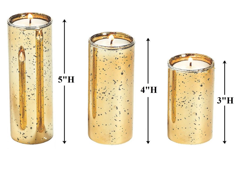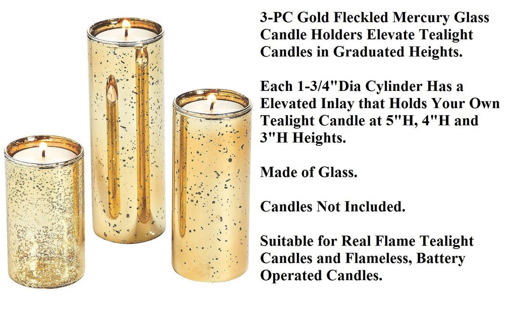 Graduated Cylinder Candle Holders Speckled Golden Finish Mercury Glass 3-PC NEW Graduated Cylinder Candle Holders Speckled Golden Finish Mercury Glass 3-PC NEW Click images to enlarge Description Graduated Cylinder Candle Holders Speckled Golden Finish Mercury Glass 3-PC. Elevate your tabletops wit these gold colored flecked mercury candle holders. Whether it's as part of your wedding reception decorations or any formal event, these will help make your centerpieces pop with these elegant accents. Each includes an inlay for a tea light. Details: Set of 3 Graduated Pieces Each Measures 1-3/4"Diameter Small Measures 3"High Medium Measures 4"High Large Measures 5"High Made of Glass Each Includes Inlay For Tea Light Candles Candles Are Not Included ~Buy more than one item at the same time from our eBay store and save in shipping costs!~ (If buying different items, just put them all in your cart before paying, to get the combined shipping discount!) WARNING TO CALIFORNIA RESIDENTS: The materials used as colored decorations on the exterior of this product contain lead and/or cadmium, chemicals known to the State of California to cause birth defects or other reproductive harm. For more information, go to www.P65Warnings.ca.gov/product Shipping We use UPS SurePost, UPS, USPS and FedEx SmartPost to deliver our products to your home, depending on which method is more efficient for your order. We use suppliers for some of our orders and our suppliers will choose the service that is used for these orders. PLEASE MAKE SURE YOUR ADDRESS CAN BE VERIFIED BY USPS. Please allow 7-10 days for the item to reach your home. We cannot be responsible for items shipped to incorrect or incomplete addresses, which may result in the cancellation of your order. YES, we do combine shipping! The highest shipping cost item ships at regular price, and each additional item ships at $2.00 more in additional shipping charges. If you are buying several different items from our store, put them all into your cart before paying to get the combined shipping discount. Terms of Sale Unless otherwise noted, we accept returns up to 30 Days after your purchase, through the eBay Returns System. Please use eBay to contact us if there is any problems or issues with your order. In some cases, we order the item purchased from one of our suppliers, and it is shipped directly from our supplier to the customer. There are times when an item unexpectedly becomes unavailable from our supplier. We do our best to check on all of the items availability several timea a day. If an item is unexpectedly unavailable, we will issue a refund immediately. Contact Us Please use the message center in eBay to contact us. We check our message box in eBay several times a day. If you have any questions or concerns with your order, please feel free to contact us. We care very much about our customers being 100% happy with their purchases. We would very much appreciate you letting us resolve any issues you may have with your order by contacting us first, before taking any other unnecessary actions. Get images that make Supersized seem small. Showcase your items with Auctiva's Listing Templates! THE simple solution for eBay sellers. Track Page Views With Auctiva's Counter