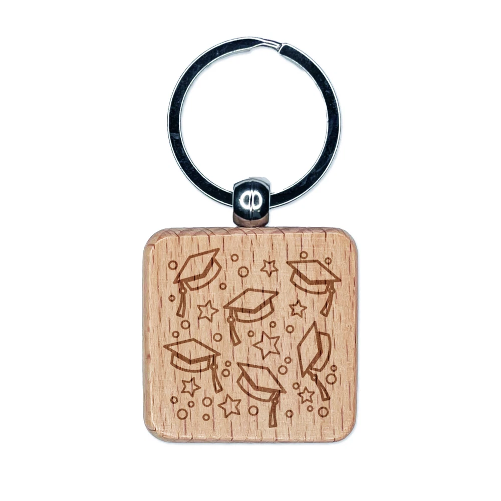 Graduation Caps Repeating Pattern Engraved Wood Square Keychain Tag Charm