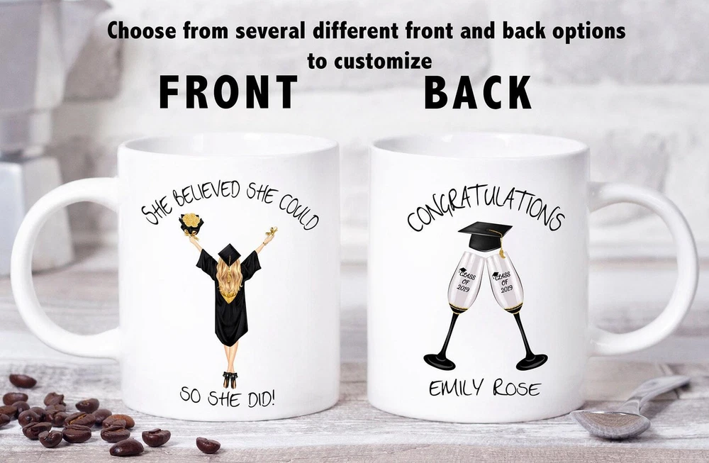 Graduation Mug Gift For Graduate Graduation Gift Personalized Graduation Gift Product Details.. This high quality 11oz. ceramic white mug has a premium hard coat that provides crisp and vibrant color reproduction sure to last for years. Perfect for all hot & cold beverages. The highest quality printing possible is used. It will never fade no matter how many times you wash it. Material: 100% Ceramic. Print both sides. Dishwasher and Microwave Safe. High Gloss + Premium White Finish. Printed in the U.S.A. Personalized & Custom. We support personalized and custom mug to add custom, when placing an order, you can add notes to the "order note" in shipping address section. Also you can contact us directly via message. Shipping Info. Ready to ship in 1 to 2 business days, All products are made-to-order and proudly printed in the United States. Shipped by USPS and DHL, You will receive your order in 5-7 days. Replace & Refund. All products are defective during shipping broken, chipped will be replaced free of charge. You are not satisfied with the product, we will refund 100% money to you. If any other issues arise, please do not hesitate to message, we would be more than happy to assist you.
