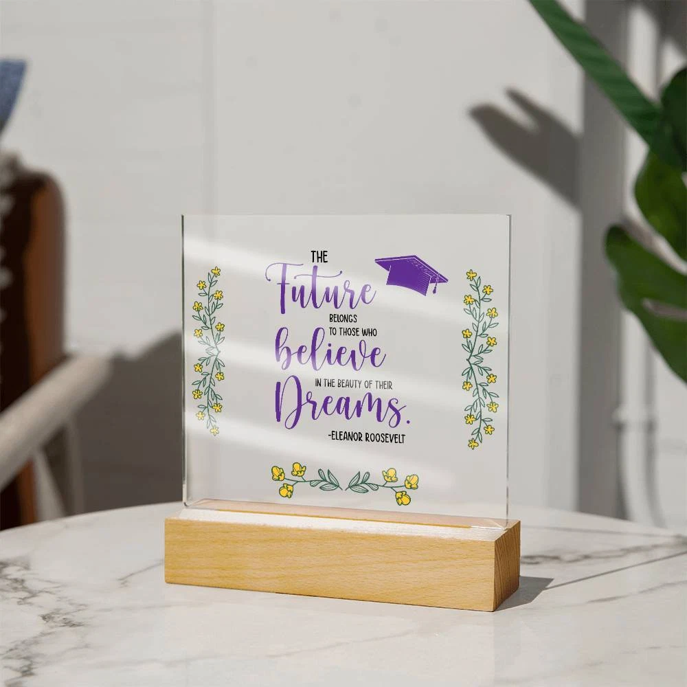 Celebrate your graduate's achievement with our unique Graduation Quote Plaque Gift. Perfect for graduation parties, this gift combines modern technology with a heartfelt message that will surely touch their hearts. Our Square Acrylic Plaque is made of premium crystal-clear acrylic, making it an eye-catching centerpiece for any room. With its sleek wooden base, this plaque is elevated to truly stand out and become a conversation starter. Upgrade to the LED wooden base for an even more memorable presentation. Made from high-quality acrylic, our plaque features a professionally printed design that will last for years to come. It's a truly unique and sentimental gift that your graduate will cherish. Product specifications: - Premium acrylic construction - Size with wooden base: 6.5" (165mm) height x 5.9" (150mm) width - Acrylic Depth: 0.1" (5mm) - Wooden base: 1.2" (30mm) height x 5.9" (150mm) width x 1.8" (45mm) depth - Optional wooden base with colorful built-in LED lights - Sharp, detailed printed design Each order is carefully packaged and ready to be treasured for a lifetime. Let your loved one know how much they mean to you by purchasing this meaningful gift today. Celebrate their hard work and dedication with our Graduation Quote Plaque Gift.