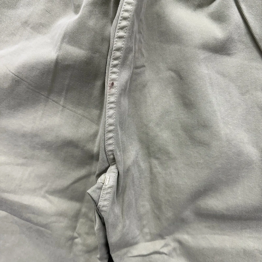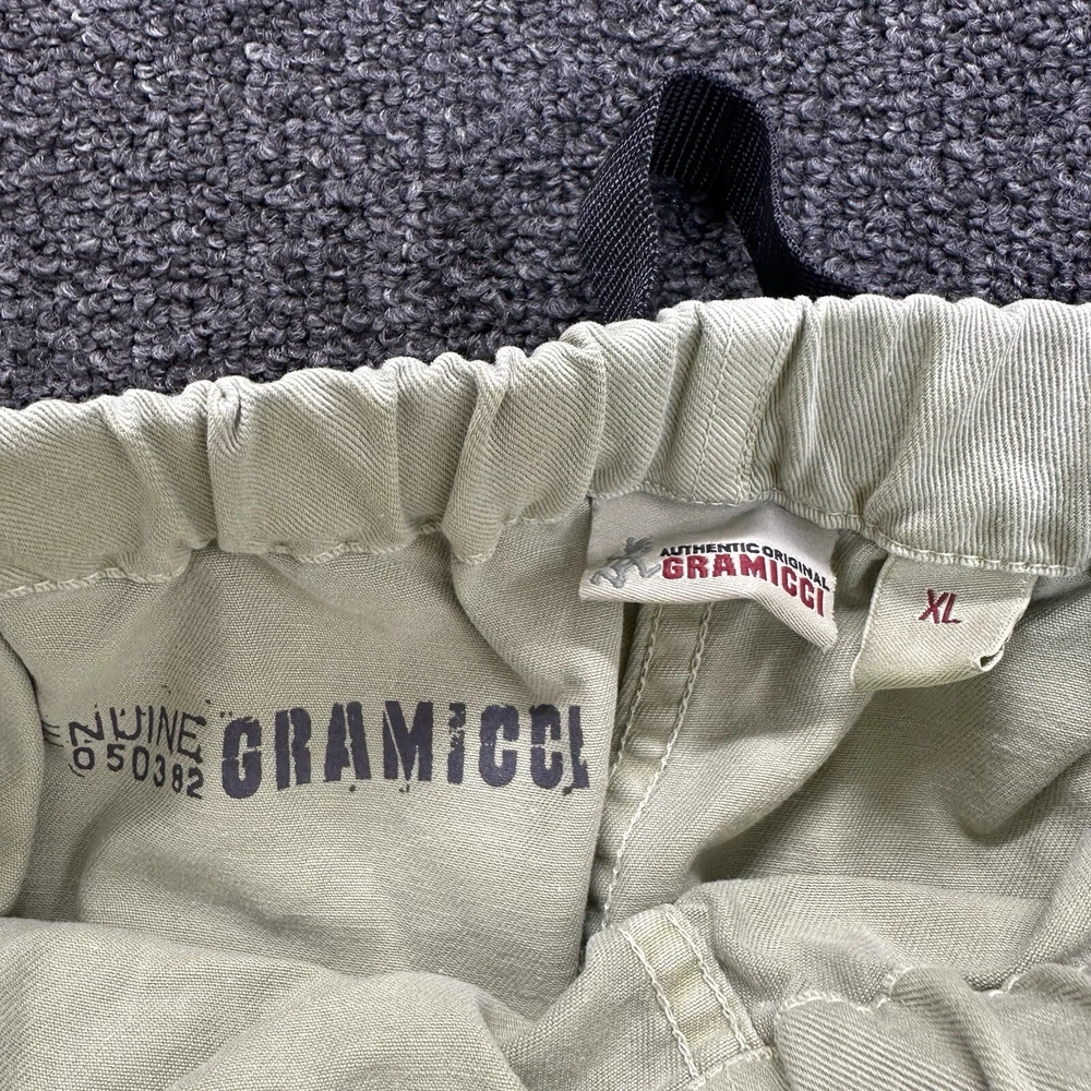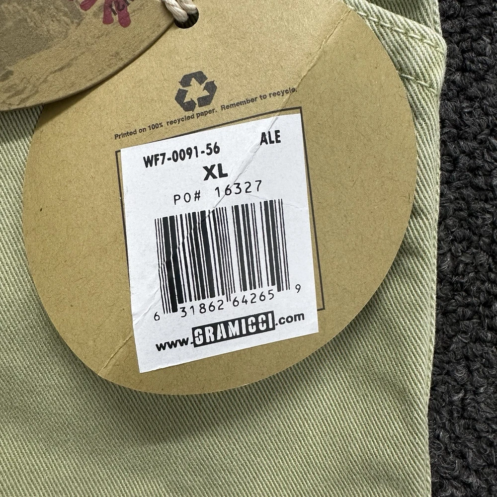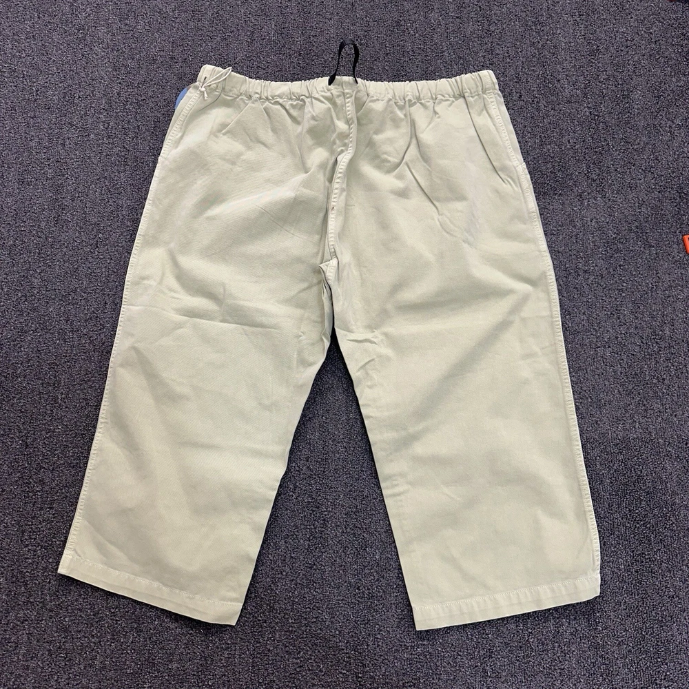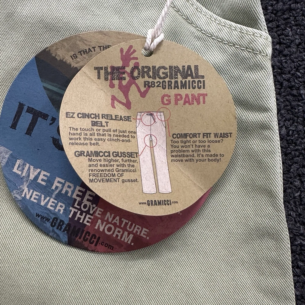 This is a pair of women's XL Gramicci pants in a solid green color, featuring a buckle closure and a 21" inseam. The pants are made of cotton canvas fabric, designed for outdoor activities like walking, climbing, fishing, hiking, and running. They have a regular fit with a straight leg style and a belted waist for a comfortable and secure fit. Additionally, the pants have pockets, are breathable, and are easy to care for, making them ideal for travel and activewear use. Gramicci Pants Women's XL Original G1 Belted Capri Green 21" Inseam Outdoors NWT has small spot on back as pictured just needs a wash no stains