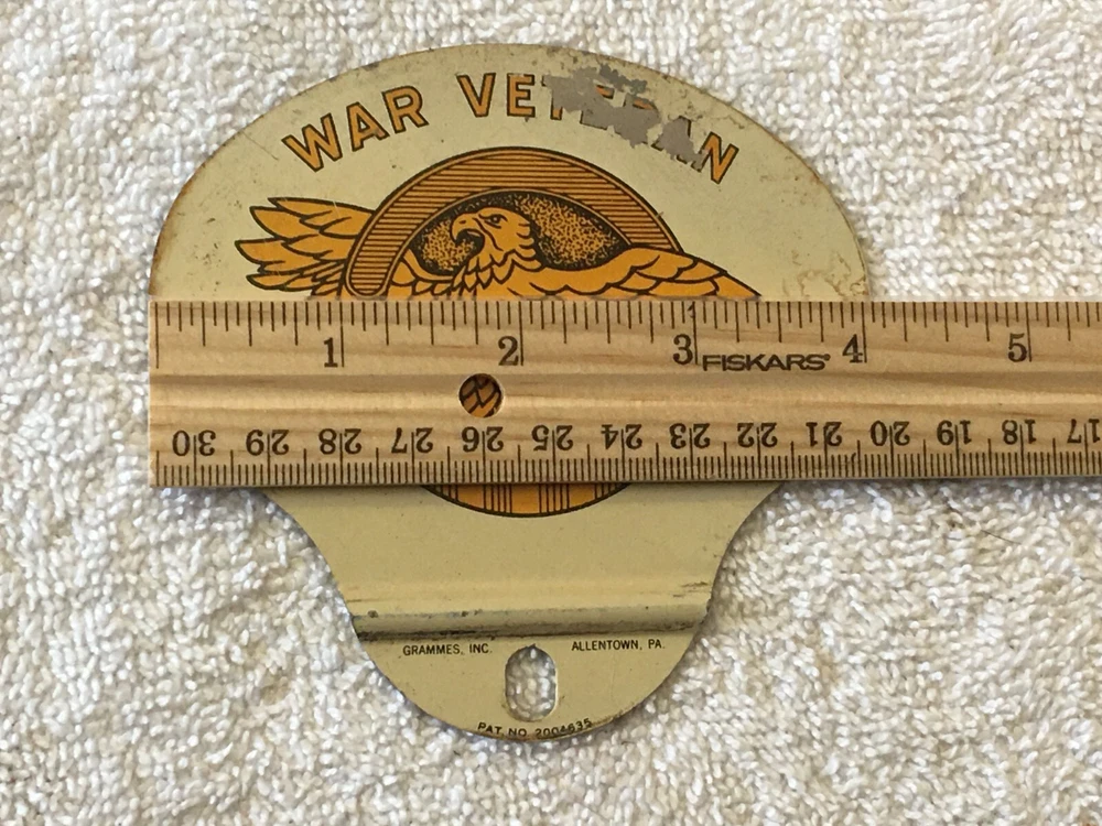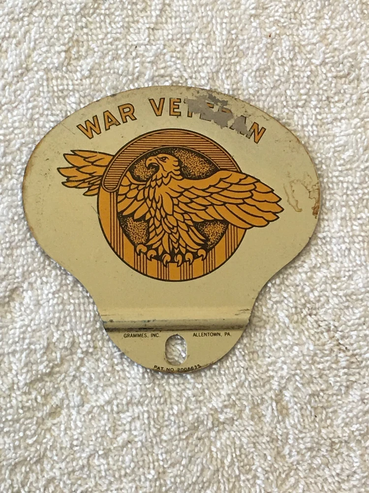 Vintage Grammes Inc War Veteran License Plate Topper and will have some paint loss plus some stains mainly on the backside. Measures 4 inches wide and 3 3/4 inches tall.