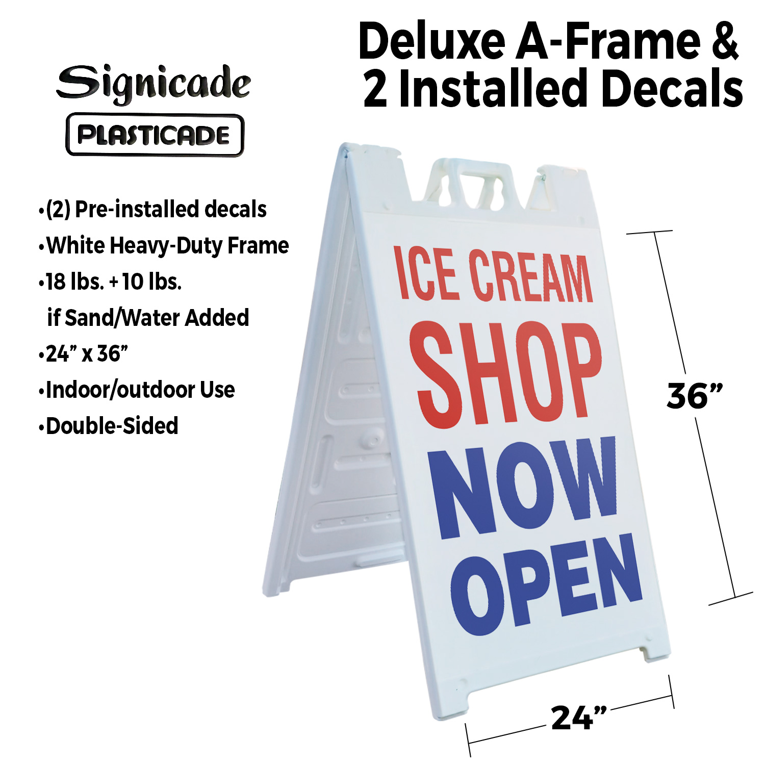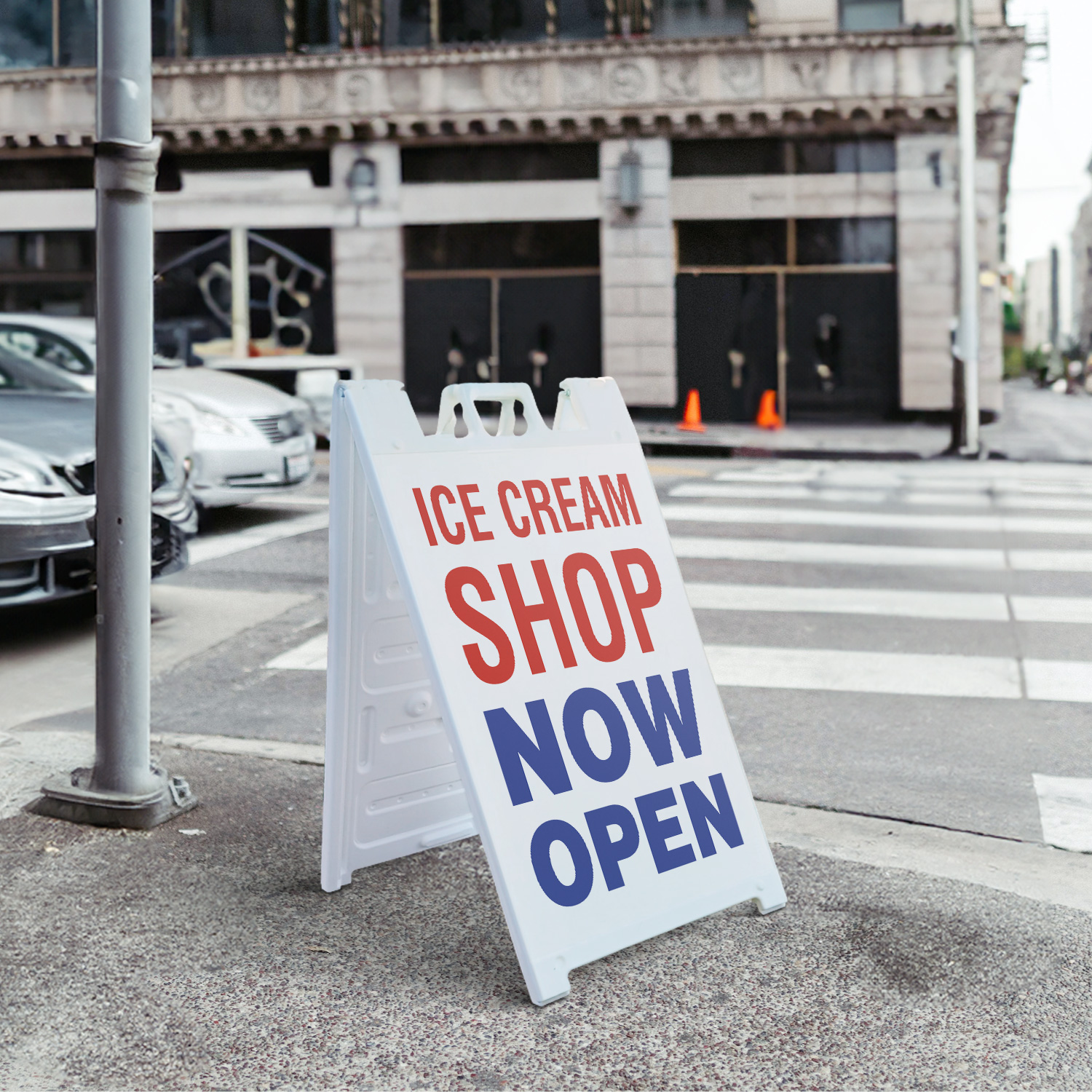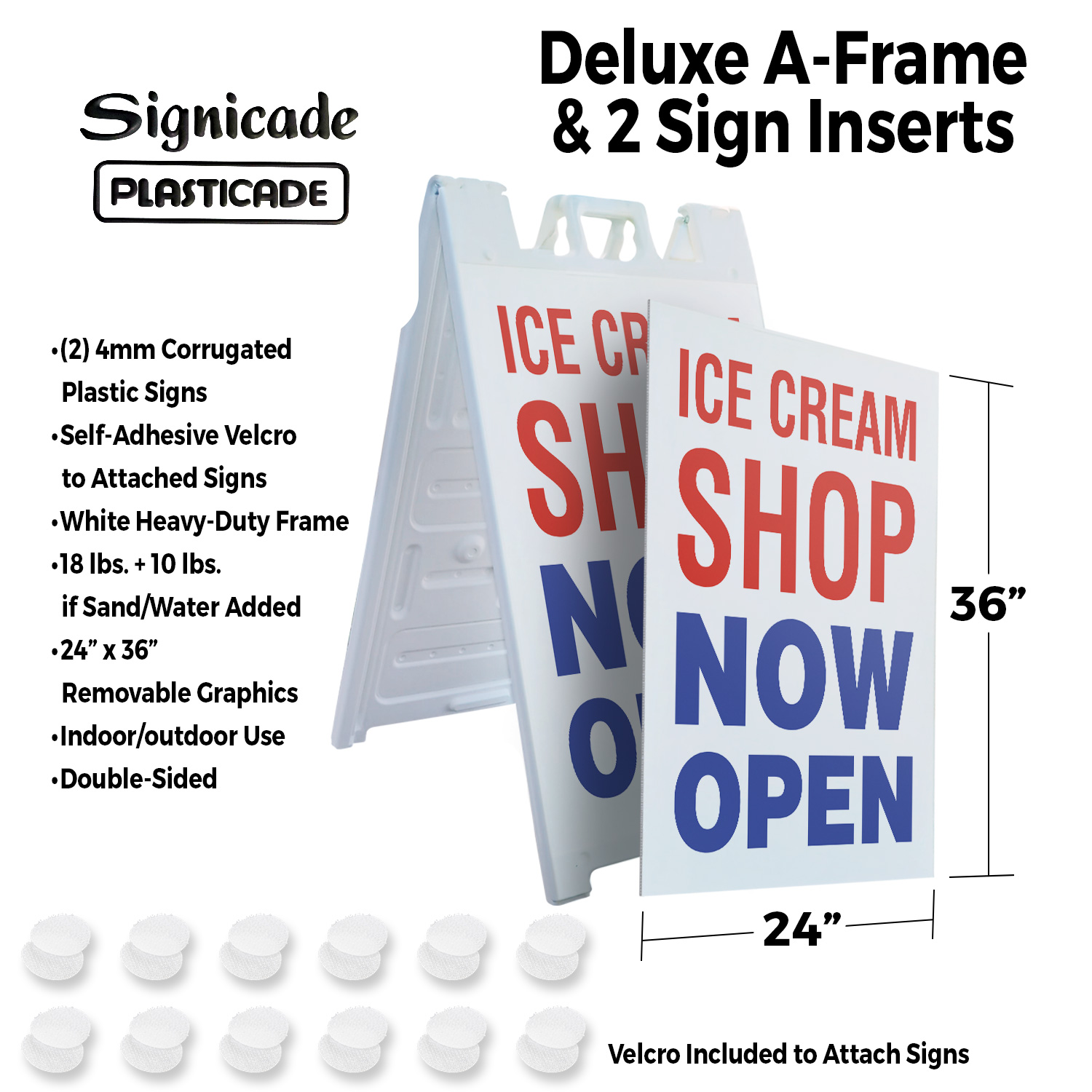 Ice Cream Shop Now Open (2-Pack) 24 Inch x 36 Inch Plastic Signs | Sign Insert 4mm Corrugated Plastic Signs Storefront Window Poster | Grand Opening, Refreshing Desserts, Local Favorites | Made in USA Universal 2 eBay Template by Finest Design Vinyl Banners Aluminum Signs Safety Signs Yard Signs Designer Aluminum Signs Novelty Signs Vinyl Banners Aluminum Signs Safety Signs Yard Signs Designer Aluminum Signs Novelty Signs Description Ice Cream Shop Now Open Heavy Duty A-Frame Sidewalk Sign Grand Opening Fresh SignMission Deluxe A-Frame Signs Heavy-Duty - Portable - Reusable - Weather Resistant A-Frames, also known as sandwich board signs, are an easy and affordable way to advertise your business or event. The durable thick plastic frame allows them to be placed both indoors and outdoors in any conditions except extreme weather. They are also extremely easy to set up, take down, and move from one location to another as needed. Our Signicade Deluxe A-Frame is available with two installation options: Decals Installed – The sign graphics are printed on high-quality vinyl decals that come pre-installed on the frame. Corrugated Plastic Signs Installed – Includes two 4mm corrugated plastic sign inserts that are attached using self-adhesive Velcro (included). Need to switch up your messaging? Extra sets of inserts are available in both decal and corrugated plastic options. Order multiple sets and change your message in just a few minutes! Simply search for SignMission 24” x 36” sign inserts to get additional replacements. Product Features & Specs (2) 4mm Corrugated Plastic Signs OR Pre-Installed Decals Self-Adhesive Velcro (For corrugated plastic option) White Heavy-Duty Frame 18 lbs. + 10 lbs. if Sand/Water Added 24” x 36” Removable Sign Graphics Indoor / Outdoor Use Double-Sided A-Frame Features Weatherproof: The combination of high-quality plastic and added weight from sand/water makes these signs perfect for outdoor use. Rain or shine, your A-Frame sign can endure it all. Maximum Visibility: Because every A-Frame is double-sided, you can make sure everyone sees your message. Portable: The collapsible A-Frame and convenient handle make it easy to move your sign from one location to another. Reusable: Store your signs and use them as you always have, swap inserts to change your messaging, and use your A-frame signs for years to come. Weight: 18 lbs. (Weight does not reflect when the frame is filled with water or sand, which can add 10 additional lbs. when full.) Details: Durable heavy-duty plastic frame with a regressed double-sided sign area (24”x36”). Foldable with a molded handle for easy grip and carrying. Fillable frame for greater stability. Swappable corrugated plastic graphics or pre-installed decals. Portable. Uses: Indoor/Outdoor. Trade shows. Sidewalk advertising. Daily specials and menus for restaurants. Point-of-purchase displays. Event and foot traffic. Directional signage. Estimated Lifespan: 5+ years with proper placement and care. Size: 45"H x 25"W x 3"D - Frame; 24" x 36" Graphic Area.
