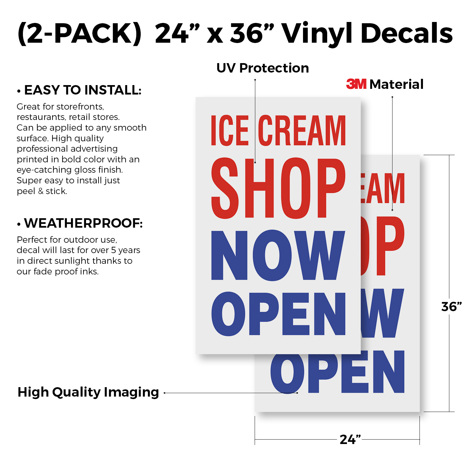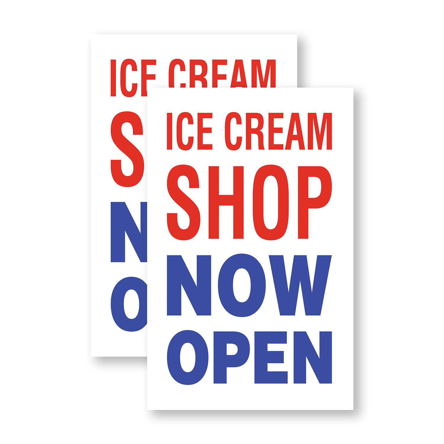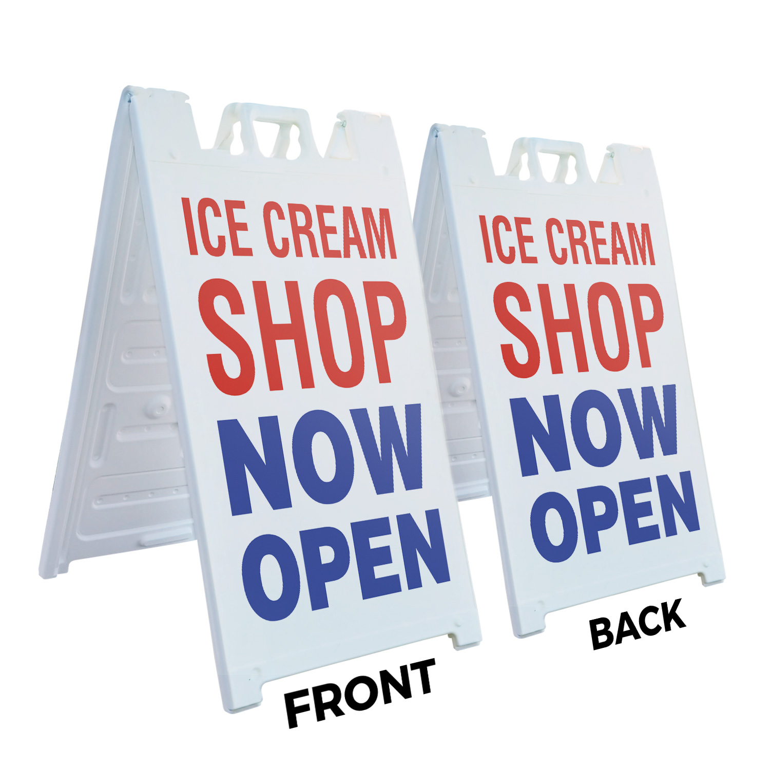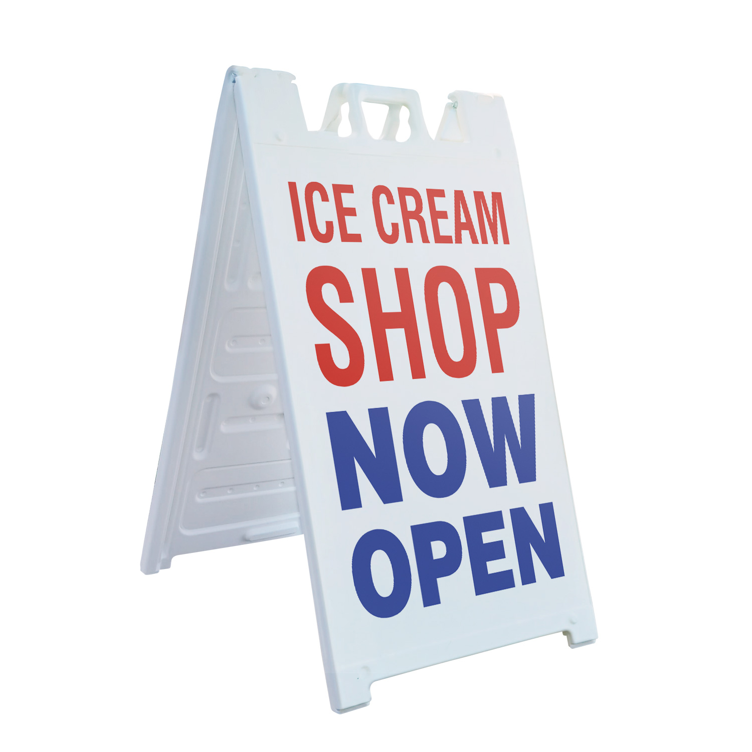Ice Cream Shop Now Open (2-Pack) 24 Inch x 36 Inch Plastic Signs | Sign Insert 4mm Corrugated Plastic Signs Storefront Window Poster | Grand Opening, Refreshing Desserts, Local Favorites | Made in USA Universal 2 eBay Template by Finest Design Vinyl Banners Aluminum Signs Safety Signs Yard Signs Designer Aluminum Signs Novelty Signs Vinyl Banners Aluminum Signs Safety Signs Yard Signs Designer Aluminum Signs Novelty Signs Description Ice Cream Shop Now Open Heavy Duty A-Frame Sidewalk Sign Grand Opening Fresh SignMission Deluxe A-Frame Signs Heavy-Duty - Portable - Reusable - Weather Resistant A-Frames, also known as sandwich board signs, are an easy and affordable way to advertise your business or event. The durable thick plastic frame allows them to be placed both indoors and outdoors in any conditions except extreme weather. They are also extremely easy to set up, take down, and move from one location to another as needed. Our Signicade Deluxe A-Frame is available with two installation options: Decals Installed – The sign graphics are printed on high-quality vinyl decals that come pre-installed on the frame. Corrugated Plastic Signs Installed – Includes two 4mm corrugated plastic sign inserts that are attached using self-adhesive Velcro (included). Need to switch up your messaging? Extra sets of inserts are available in both decal and corrugated plastic options. Order multiple sets and change your message in just a few minutes! Simply search for SignMission 24” x 36” sign inserts to get additional replacements. Product Features & Specs (2) 4mm Corrugated Plastic Signs OR Pre-Installed Decals Self-Adhesive Velcro (For corrugated plastic option) White Heavy-Duty Frame 18 lbs. + 10 lbs. if Sand/Water Added 24” x 36” Removable Sign Graphics Indoor / Outdoor Use Double-Sided A-Frame Features Weatherproof: The combination of high-quality plastic and added weight from sand/water makes these signs perfect for outdoor use. Rain or shine, your A-Frame sign can endure it all. Maximum Visibility: Because every A-Frame is double-sided, you can make sure everyone sees your message. Portable: The collapsible A-Frame and convenient handle make it easy to move your sign from one location to another. Reusable: Store your signs and use them as you always have, swap inserts to change your messaging, and use your A-frame signs for years to come. Weight: 18 lbs. (Weight does not reflect when the frame is filled with water or sand, which can add 10 additional lbs. when full.) Details: Durable heavy-duty plastic frame with a regressed double-sided sign area (24”x36”). Foldable with a molded handle for easy grip and carrying. Fillable frame for greater stability. Swappable corrugated plastic graphics or pre-installed decals. Portable. Uses: Indoor/Outdoor. Trade shows. Sidewalk advertising. Daily specials and menus for restaurants. Point-of-purchase displays. Event and foot traffic. Directional signage. Estimated Lifespan: 5+ years with proper placement and care. Size: 45"H x 25"W x 3"D - Frame; 24" x 36" Graphic Area.