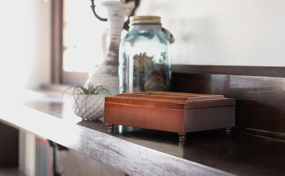 Recommended Uses For Product: Ring Number of Drawers: 3 Style: Traditional Product Dimensions: 6"D x 8"W x 2.5"H Item model number: MB2152 Color: Woodgrain Item Package Quantity: 1 Shape: Heart Inner Material: velvet Finish: Lacquered Batteries Required?: No Type: Does not apply Mounting Type: Table Top Size: 8x6 Jewelry Storage Type: Jewelry Box Special Features: Musical Finish Type: Lacquered Part Number: MB2152 Batteries Included?: No Material: Polycast Item Weight: 14.4 ounces Brand: Does not apply Special Feature: Musical Number of Compartments: 1