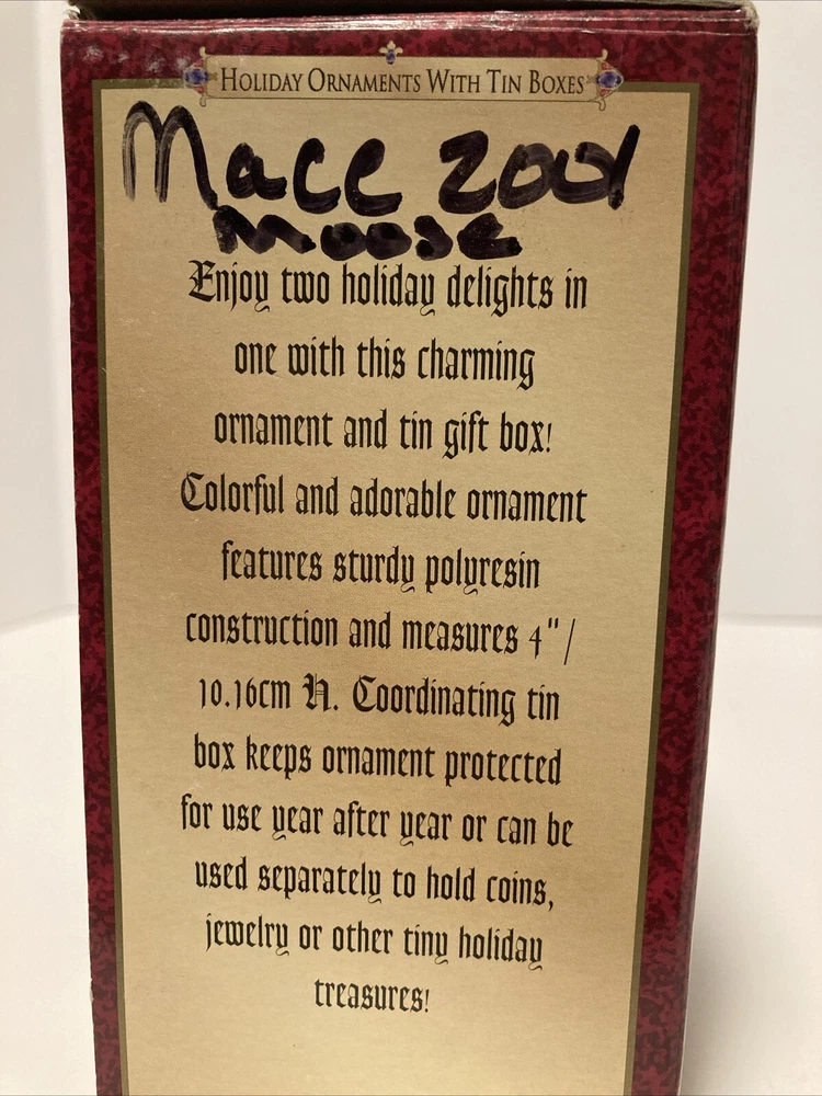 Add a unique touch to your Christmas decorations with this vintage Grandeur Noel Moose Ornament. The moose is beautifully crafted, comes with a box and tin to keep it safe. This Hallmark Keepsake Ornament features a cute moose shape, perfect for any Christmas occasion. The ornament is part of the Ornaments collection and comes with personalization instructions. It is a perfect addition to any collector's set. Purchase this Moose Ornament today and enjoy its charm for years to come.