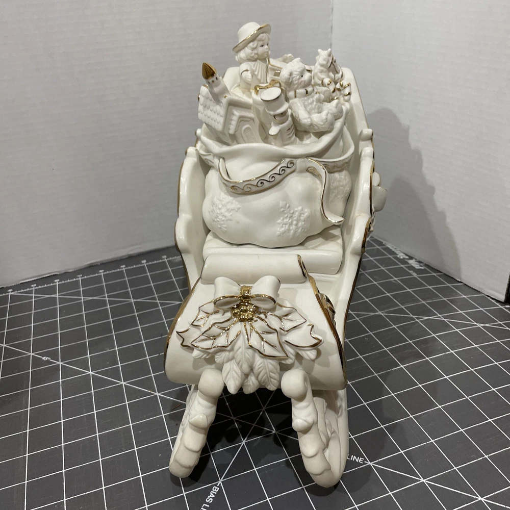 Add a touch of holiday magic to your home with this beautiful Grandeur Noel porcelain sleigh. This 2001 collectors edition set features a stunning white sleigh with gold accents and is perfect for any room in your home. Whether you're looking to decorate your living room or add a special touch to your children's bedroom, this set is sure to This traditional style is an original piece from the 21st century and is manufactured in China. Bring the joy of the holiday season into your home with this gorgeous Grandeur Noel porcelain sleigh.