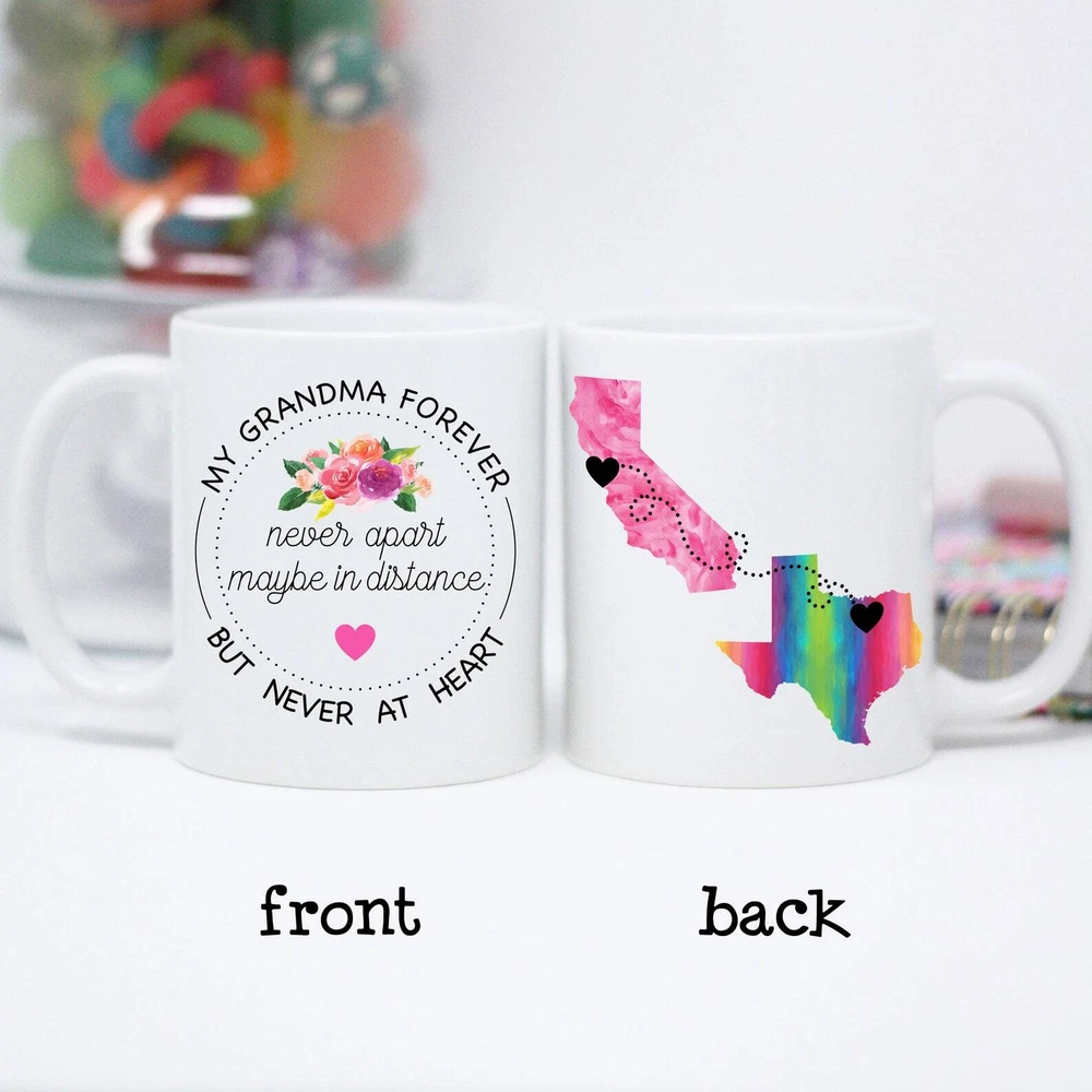 Grandma Personalized Long Distance State Mug Gift For Grandma Mothers Day Gift Product Details.. This high quality 11oz. ceramic white mug has a premium hard coat that provides crisp and vibrant color reproduction sure to last for years. Perfect for all hot & cold beverages. The highest quality printing possible is used. It will never fade no matter how many times you wash it. Material: 100% Ceramic. Print both sides. Dishwasher and Microwave Safe. High Gloss + Premium White Finish. Printed in the U.S.A. Personalized & Custom. We support personalized and custom mug to add custom, when placing an order, you can add notes to the "order note" in shipping address section. Also you can contact us directly via message. Shipping Info. Ready to ship in 1 to 2 business days, All products are made-to-order and proudly printed in the United States. Shipped by USPS and DHL, You will receive your order in 5-7 days. Replace & Refund. All products are defective during shipping broken, chipped will be replaced free of charge. You are not satisfied with the product, we will refund 100% money to you. If any other issues arise, please do not hesitate to message, we would be more than happy to assist you.