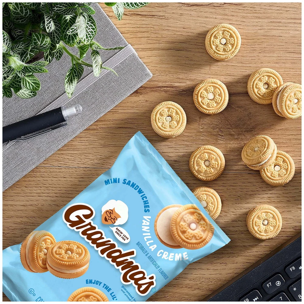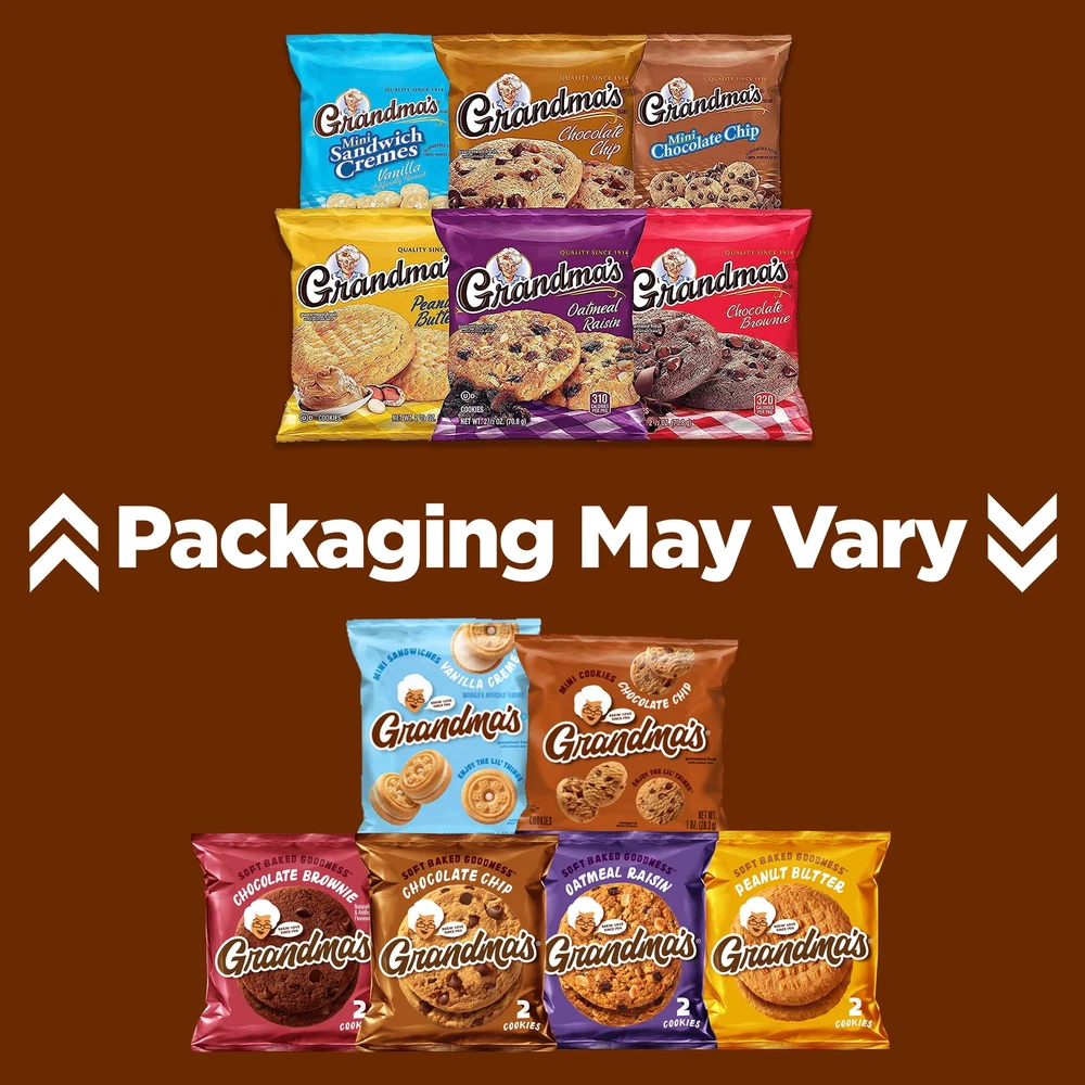 Grandma’s Big Cookie packs include maximum freshness. Enjoy a big, soft, and delicious cookie perfect for lunches, picnics, after school snacks, company gatherings, and more. Grandma’s Cookies are made with a great tasting cookie recipe, baked with love for happiness in every bite. Every Grandma's treat is baked with love to transport you to your happy place and experience a delicious variety of homemade memories with every bite. Includes 30 cookies. Grandma’s Cookies, Oatmeal Raisin, Peanut Butter, Chocolate Chip cookies, Chocolate Brownie, Vanilla Creme Flavor Mini Cookies (30 Pack) Includes 30 packs of Grandma’s Cookies, Oatmeal Raisin (2 count), Peanut Butter (4 count), Chocolate Chip mini cookies (4 count), Chocolate Brownie (6 count), Chocolate chip (6 count) and Vanilla Creme (8 Count) Flavor Cookies Grandma’s Big Cookie packs include 2 cookies per pack for maximum freshness Enjoy a big, soft, and delicious cookie perfect for lunches, picnics, after school snacks, company gatherings, and more Grandma’s Cookies are made with a great tasting cookie recipe, baked with love for happiness in every bite Flavor Descriptions: Grandma’s Peanut Butter Cookies: enjoy the sweet taste of creamy peanuts baked into every delicious cookie. Grandma’s Chocolate Chip Cookies: loaded with chocolate chips and chewy, gooey goodness in every cookie. Grandma’s Oatmeal Raisin Cookies: sweet raisins and chewy oatmeal baked into every delicious cookie. Grandma’s Brownie Cookies: brownie flavored cookie loaded with chocolate chips, chocolatey goodness in every bite For a limited time, packaging may vary. Shelf-stable