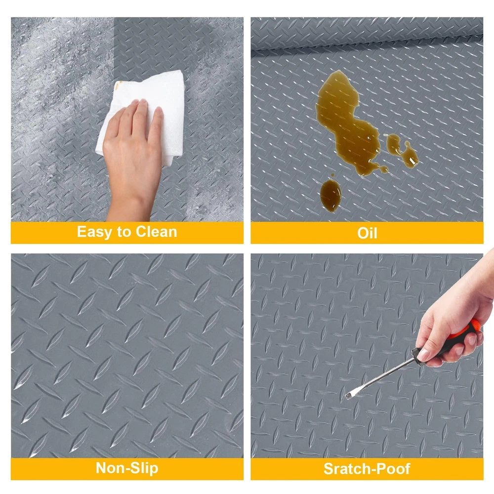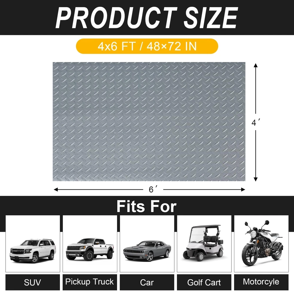 Premium PVC Rubber Material: Our Garage Floor Mat crafted from high-quality PVC rubber, ensuring durability and resistance to wear. The material is not only non-slip but also provides excellent protection against daily wear and tear.Low temperature will affect the paving of the floor mat, recommended for indoor use.Tips:If there is a slight bulge, it is recommended to place at room temperature for a few days. Anti-Slip Design: The under car mat engineered with a diamond plate texture for superior slip resistance, ensuring safety for both foot traffic and parked vehicles even in damp conditions.In order to make the mat does not slip, you can use double-sided tape on all sides(not included in the package) Generous Dimensions: Boasting a spacious 4x6ft coverage, totaling 24 square feet, this floor mat is designed to accommodate a variety of garage spaces. The ample size eliminates concerns about mismatched dimensions during installation. Thickness for Heavy-Duty Use: The floor mat is thickened to 2.8mm, providing robust stability and durability. Ideal for heavy-duty applications, it safeguards your floors and offers a comfortable walking surface. Versatile Application: Perfect for a range of spaces, including garages, gyms, warehouses, basements, and trailers. Its heavy-duty construction makes it suitable for diverse environments.