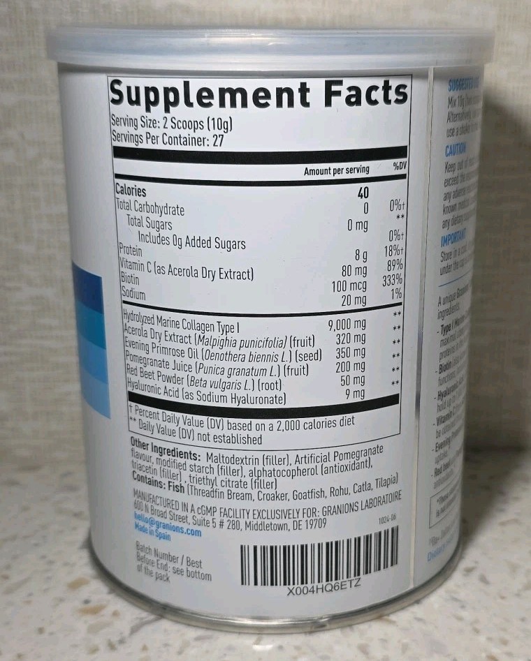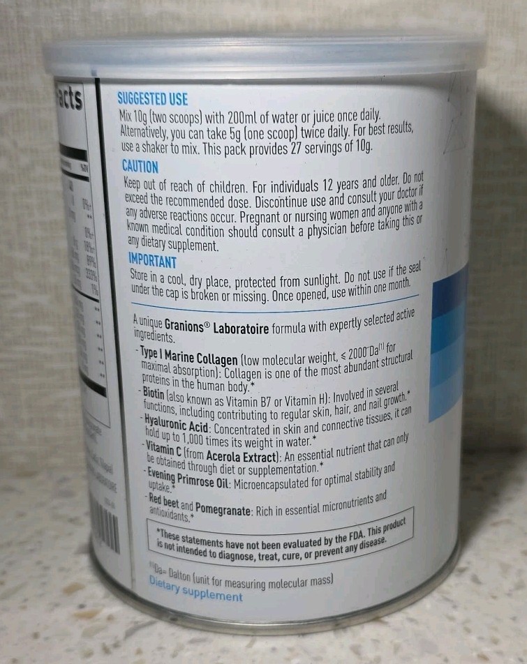 Granions Collagen+ Complex Marine Collagen Hyaluronic Acid Evening Primrose Oil Biotin Collagen Peptides 9,000mg Dietary supplement Net wt 9.7 oz / 275 g Exp. Date: 02/2028 NEW & sealed