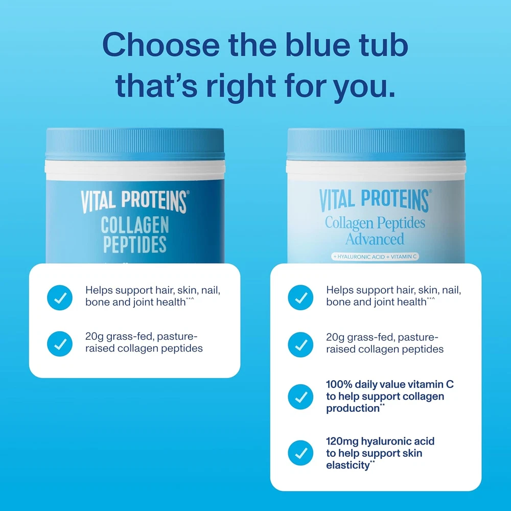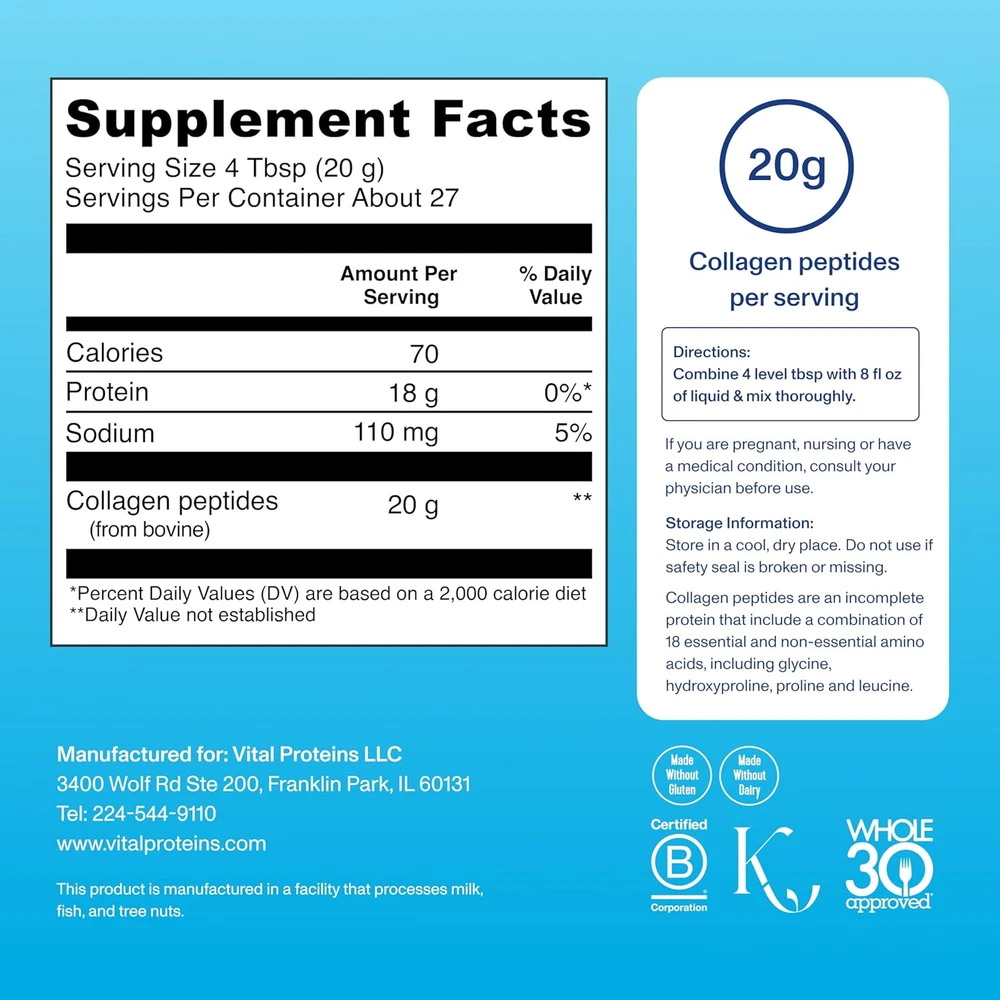 Menu Other Items Feedbacks About Us Contact Us Add To Favorites Grass Fed Collagen Peptides Powder, Supports Hair, Skin, Nails, Bones, and Joint 1 Simple Ingredient: Collagen Peptides is a premium powdered supplement that features hydrolyzed collagen peptides — sourced from the hides of grass-fed, pasture-raised cows — to support hair, skin, nail, bone and joint health.**^ Easy To Use: Vital Proteins Collagen Peptides is easily digested and dissolves in cold or hot liquids, like coffee, tea and smoothies. High quality: Sourced from the hides of grass-fed, pasture-raised bovine to ensure a high quality and sustainable source of this powerful ingredient. Made With You In Mind: Whole30 Approved, Paleo Friendly, Kosher, Grass Fed + Pasture Raised, Made Without Gluten & Dairy, 0g Sugar* 20g Collagen Powder Per Serving: While we are going scoopless, the recommended dosages will stay the same. We encourage consumers to follow the measurement guidance on our updated label, which provides servings measured in tablespoons. Product Description The video showcases the product in use. The video guides you through product setup. The video compares multiple products. The video shows the product being unpacked. 1 What is collagen? 2 Why is it important? 3 How does it work? 4 How do I get results? 1 Collagen Soup 2 Berry Revitalizer 3 Smoothie Bowl 4 Greek Yogurt Pops Explore More from Vital Proteins Add to Cart Add to Cart Add to Cart Add to Cart Add to Cart Add to Cart Customer Reviews 4.5 out of 5 stars 67,618 4.5 out of 5 stars 204,615 3.6 out of 5 stars 12,110 4.7 out of 5 stars 20 4.4 out of 5 stars 7,871 4.3 out of 5 stars 2,013 Price $18.65 $ 18 . 65 $24.00 $ 24 . 00 $19.99 $ 19 . 99 $45.00 $ 45 . 00 $34.19 $ 34 . 19 $30.00 $ 30 . 00 What is it? Unflavored Collagen Supplement Collagen Peptides w/ HA & VC Made Without Dairy Creamer Colostrum Capsule Pescatarian-friendly Collagen Matcha with Collagen Peptides Recommended Amount Per Day 4 Tbsp 3 Tbsp 4 Tbsp 3 Capsules 3 Tbsp 2 Tbsp Servings Per Container 13 13 12 30 18 21 Form Powder Powder Powder Capsule Powder Powder Recommended Timing Any time of day Any time of day Any time of day Any time of day Any time of day Morning or Afternoon Available Flavors Unflavored Unflavored Mocha, Coconut, Vanilla Unflavored Unflavored Original Matcha Item Specification Unit Count 19.3 Ounce Flavor Name Unflavored Number of Items 1 Product Benefits Bone & Joint Support Item Weight 547 Grams Age Range (Description) Adult Diet Type Gluten Free Package Information Canister Flavor Unflavored Size 27 Servings (Pack of 1) Item Form Powder Package Dimensions 6.46 x 4.96 x 4.92 inches; 1.21 Pounds Dimensions Shipping Returns Additional Info Product Dimensions: 4.96 inches x 6.46 inches x 4.92 inches. Weight: 547.0 grams Fast shipping is very important for us. Our standard shipping service is FREE. Your order will be shipped within 1-3 business days upon full payment received. Most items are delivered within 3-5 business days, however, please allow 3-10 business days. We are shipping only to USA. We only ship to the confirmed Paypal address. We reserve the right to cancel any order for any reason at any time. We are not responsible for undeliverable addresses. We offer a 30 day return policy from checkout winning date. Your satisfaction is guaranteed! If for any reason you are unhappy with your item, just return it within 30 days for a full refund, minus shipping cost. Please contact us prior to initiating a return so that we can issue you a refund authorization. Items defective upon receipt must be packaged in their retail packaging as if new and returned with a detailed description of the problem. Return shipping fees are not refundable. We reserve the right to decline any returns if the above guidelines are not followed. All of our items, unless otherwise stated, will only run on 120 volts. Please check to make sure your country complies with these specifications. If you have a problem or question regarding your transaction please contact us before leaving any type of feedback. We will work with you to resolve any problem you may have.