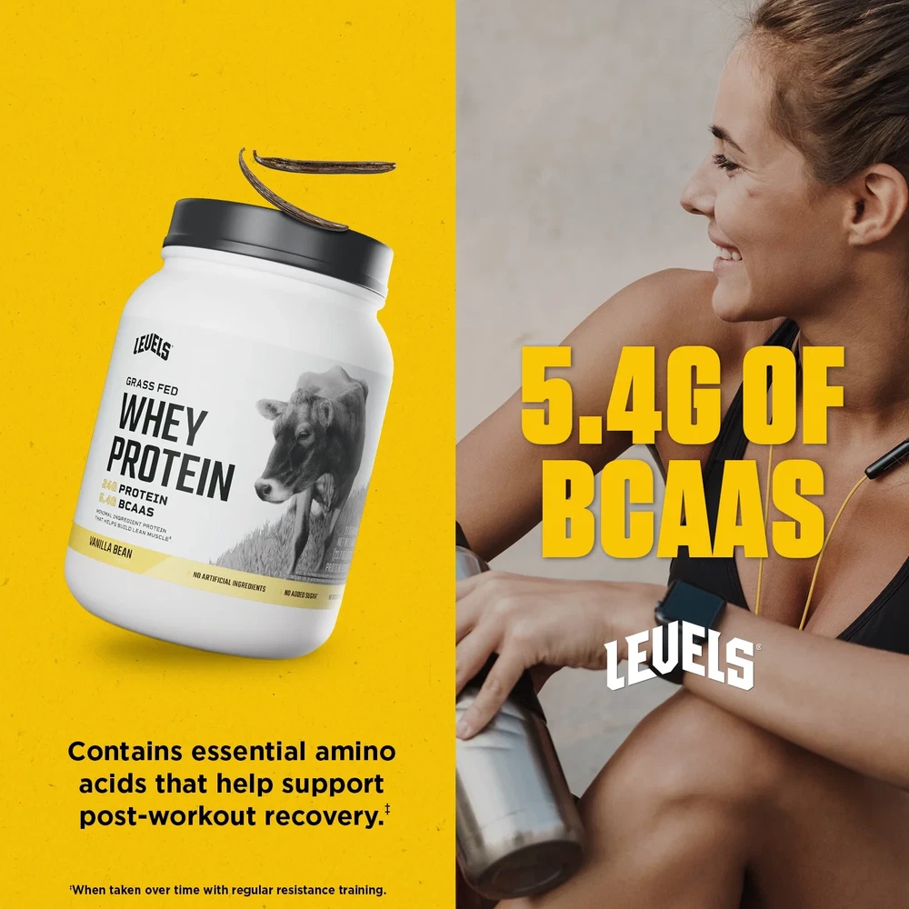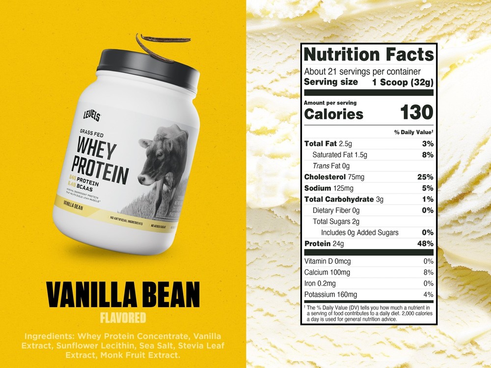 Real ingredients just taste better. That’s why we only use a blend of vanilla extract, natural sweeteners and hormone-free* whey. You’ll find no deception here either. That means no added sugars, no soy, no gluten, no artificial ingredients, and no bogus fillers. Made with minimal ingredients that don’t sacrifice on flavor. Whey concentrate is the least processed form of whey, which means it’s loaded with high-quality complete protein and essential amino acids. The branched-chain amino acids (BCAAs) found in whey protein can help build lean muscle and support post-workout recovery.‡ LEVELS WHEY PROTEIN: Each scoop of Levels Vanilla Bean Whey contains 24g Protein, 5.4g BCAAs (branched-chain amino acids), and no added sugars. Trusted by athletes, fitness enthusiasts and daily grinders everywhere, our whey is crafted for everyone’s lifestyle. NOTHING FAKE: Levels Whey is naturally delicious. That means no hormones, no GMOs, no added sugars, no soy, no gluten, no bleach, no fillers, and no artificial flavors or sweeteners. SIMPLE & CLEAN: No fake vanilla flavor here. Levels Vanilla Bean Whey is made with delicious Madagascar Vanilla Extract and lightly sweetened with monk fruit extract. QUALITY FIRST: Quality milk tastes better, way better. That’s why grass-fed hormone-free dairy is the only dairy we use to make our whey protein concentrate. Whey concentrate is the least processed form of whey, which means it’s loaded with high-quality complete protein and essential amino acids. Levels Whey Protein is undenatured to protect bioactivity and naturally occurring growth factors. Each batch is cold-process microfiltered and blended with non-gmo sunflower lecithin for that insanely easy mixing you expect. Ingredients Whey Protein Concentrate, Vanilla Extract, Sunflower Lecithin, Sea Salt, Stevia Leaf Extract, Monk Fruit Extract./div>