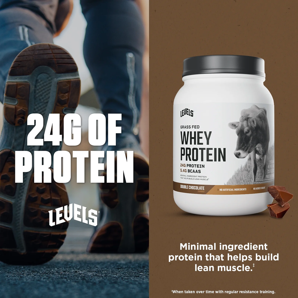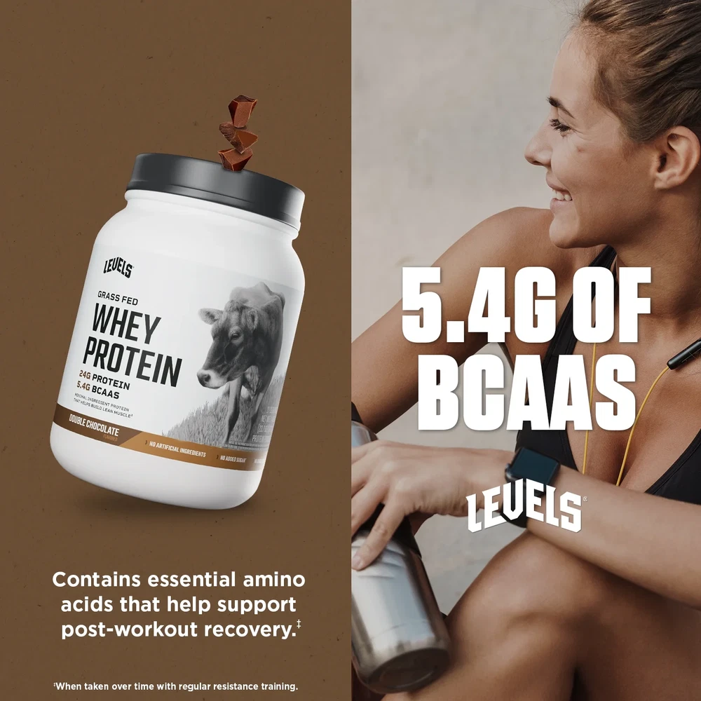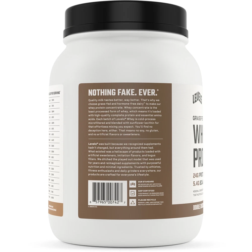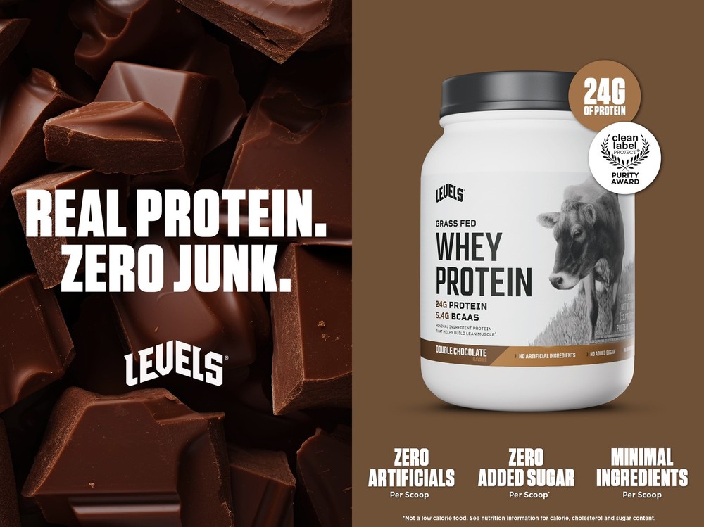 Real ingredients just taste better. That’s why we only use a blend of rich cocoa, natural sweeteners and hormone-free* whey. You’ll find no deception here either. That means no added sugars, no soy, no gluten, no artificial ingredients, and no bogus fillers. Made with minimal ingredients that don’t sacrifice on flavor. Whey concentrate is the least processed form of whey, which means it’s loaded with high-quality complete protein and essential amino acids. The branched-chain amino acids (BCAAs) found in whey protein can help build lean muscle and support post-workout recovery.‡ LEVELS WHEY PROTEIN: Each scoop of Levels Double Chocolate Whey contains 24g Protein, 5.4g BCAAs (branched-chain amino acids), and no added sugars. Trusted by athletes, fitness enthusiasts and daily grinders everywhere, our whey is crafted for everyone’s lifestyle. NOTHING FAKE: Levels Whey is naturally delicious. That means no hormones, no GMOs, no added sugars, no soy, no gluten, no fillers, and no artificial flavors or sweeteners. SIMPLE & CLEAN: No fake chocolate flavor here. Levels Double Chocolate Whey is made with deliciously rich cocoa and lightly sweetened with monk fruit extract. QUALITY FIRST: Quality milk tastes better, way better. That’s why we choose grass-fed and hormone-free dairy to make our whey protein concentrate. Whey concentrate is the least processed form of whey, which means it’s loaded with high-quality complete protein and essential amino acids. Each batch is cold-process microfiltered and blended with non-GMO sunflower lecithin for that insanely easy mixing you expect. Ingredients Whey Protein Concentrate, Cocoa Powder, Sunflower Lecithin, Sea Salt, Stevia Leaf Extract, Monk Fruit Extract./div>