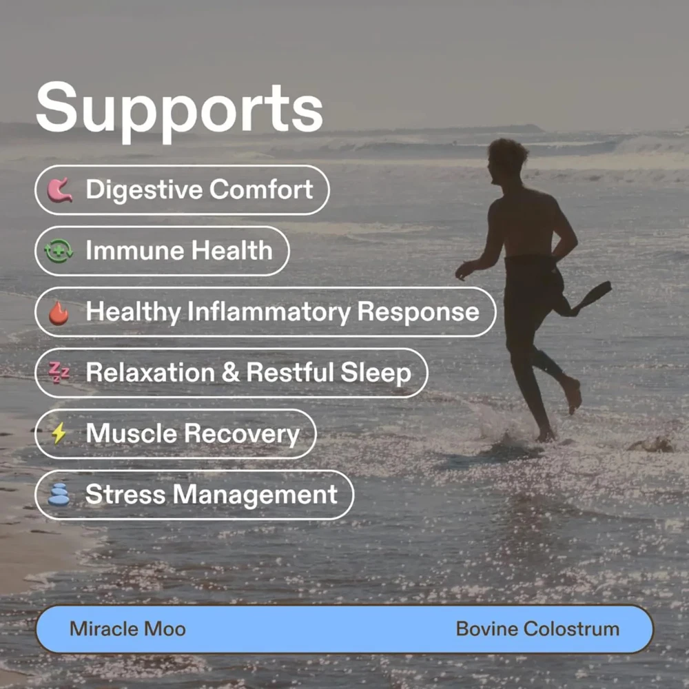 3 Packs Of Miracle Moo Bovine Colostrum, Bovine Colostrum grassfed+ immunolin Supplement, 90 Colostrum Capsules, 30 SV our natural Ingredients IMMUNOLIN : Discover the unique benefits of the only colostrum containing ImmunoLin. Enhance your gut health, promote overall wellness, and support your immune system effectively. COLOSTRUM : Experience our superior colostrum powder with an impressive 30% IgG content and ImmunoLin IgGs. These essential immunoglobulins help support a healthy immune system, strengthen gut health, and promote holistic well-being. Embrace the highest quality and scientific validation with our premium colostrum, ensuring reliable and effective results. How to use Simply mix a scoop of Miracle Moo into water, smoothies, or your favorite recipes. Seamlessly incorporate the power of colostrum, a superfood, into your daily routine and elevate your wellness journey.