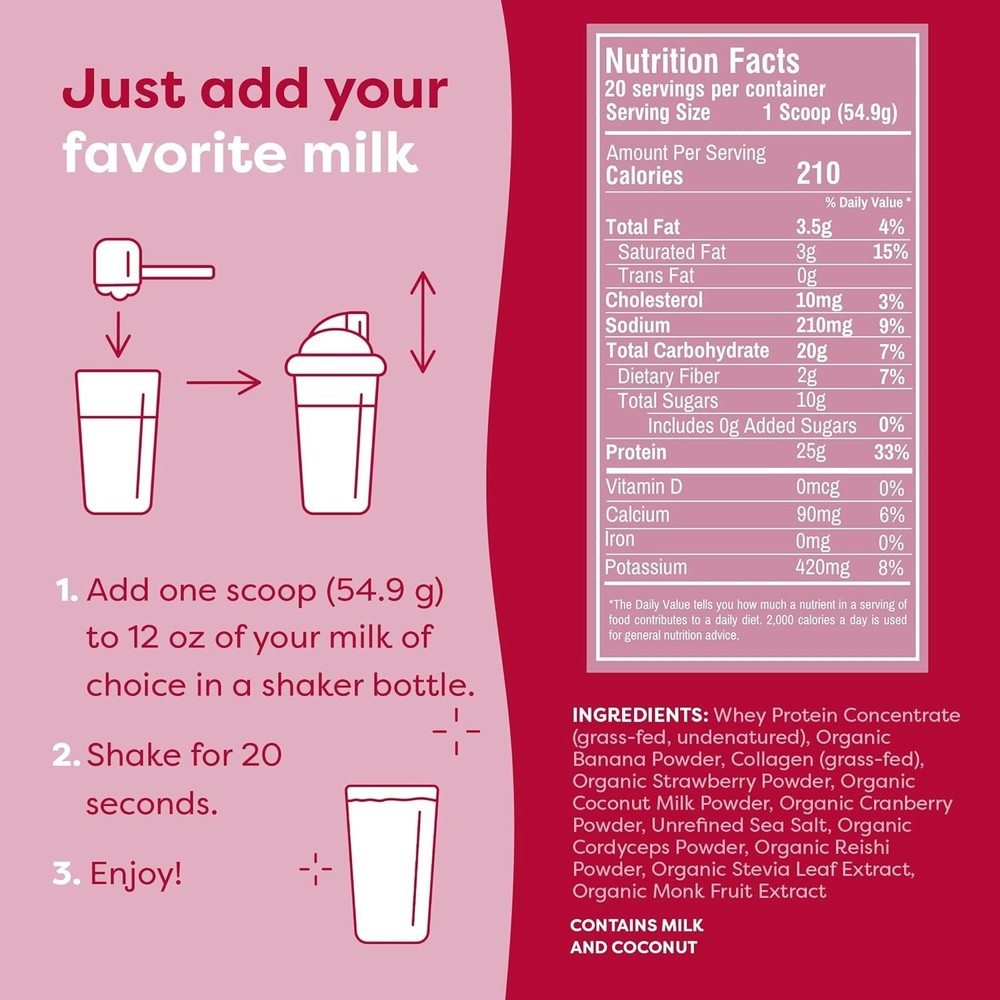 FlavCity Protein Powder Smoothie, Berries & Cream - 100% Grass-Fed Whey with Collagen (25g of Protein) - Gluten Free & No Added Sugars (38.73 oz) Flavor Berries and Cream Item Weight 38.73 Ounces Protein Source Whey Unit Count 38.73 Ounce About this item Ditch the Blender - FlavCity's creamy protein powder simplifies the smoothie-making process. Each scoop combines high-quality ingredients with a nutrient-dense powder blend of organic strawberries and cranberries, so you can simply scoop, shake and sip — no blending or extra add-ins required. 25g Protein & 10g Collagen - This grass fed whey protein powder combines non-GMO, minimally processed collagen, amino acids and undenatured whey protein. Meanwhile, organic Reishi and Cordyceps mushrooms help promote healthy focus and cognition. Functional Nutrition for Busy Lifestyles - We designed this whey protein powder for men and women who want to streamline post-workout recovery, meal prep and on-the-go fueling. This all-in-one formula is ideal for athletes, professionals and those who want to support their nutritional goals with whole-food ingredients. Just One Scoop - Add one scoop of this grass fed protein powder to 12 oz of your preferred milk, shake for 20 seconds and enjoy. Our formulas undergo stringent quality control and include thoroughly researched ingredients, so if it's "Bobby Approved" you know you're in good hands. I'd Scoop That - Since 2012, Bobby Parrish has helped people understand exactly what they're putting in their bodies so they can thrive. Now, with a following of more than 12 million community members, he's dedicated to creating protein smoothies derived from delicious whole foods and designed to help enhance your health journey. Product details Product Dimensions : 3 x 9.5 x 12.5 inches; 2.42 Pounds Date First Available : May 10, 2023 Manufacturer : FlavCity Country of Origin : USA Important information Ingredients Whey Protein Concentrate, Organic Banana Powder, Collagen, Organic Strawberry Powder, Organic Coconut Milk Powder, Unrefined Sea Salt, Organic Cordyceps Powder, Organic Reishi Powder, Organic Stevia Leaf Extract, Organic Monk Fruit Extract Legal Disclaimer Statements regarding dietary supplements have not been evaluated by the FDA and are not intended to diagnose, treat, cure, or prevent any disease or health condition. Product Description