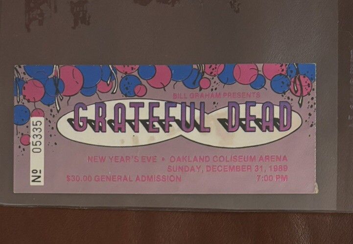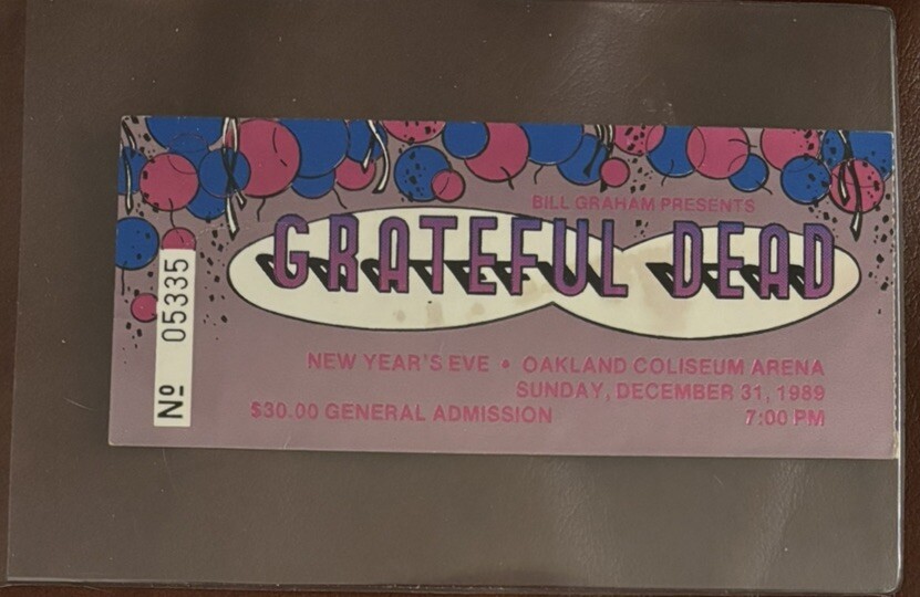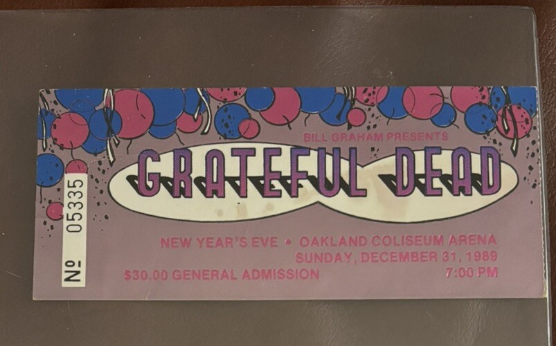 This is an original Grateful Dead concert ticket stub for their New Year's Eve shows on December 31, 1989 and 1990. The ticket was produced by BGP GDTS and is a piece of music memorabilia from the rock & pop genre. The ticket was manufactured in the United States and is a collectible item for fans of the Grateful Dead. It represents a piece of entertainment history from the iconic band's performances on New Year's Eve in the late 1980s and early 1990s. This gorgeous colorful New Years Eve ticket is in very good condition with surface wear and handling no tears rips or writing Really nice example Priced to sell