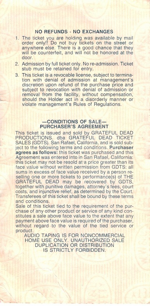 The ticket is from the 1991 Grateful Dead show at the Oakland Coliseum Arena in Oakland, CA. The ticket is in very good condition with minor creasing. I think this was the last New Eve Show they ever did.