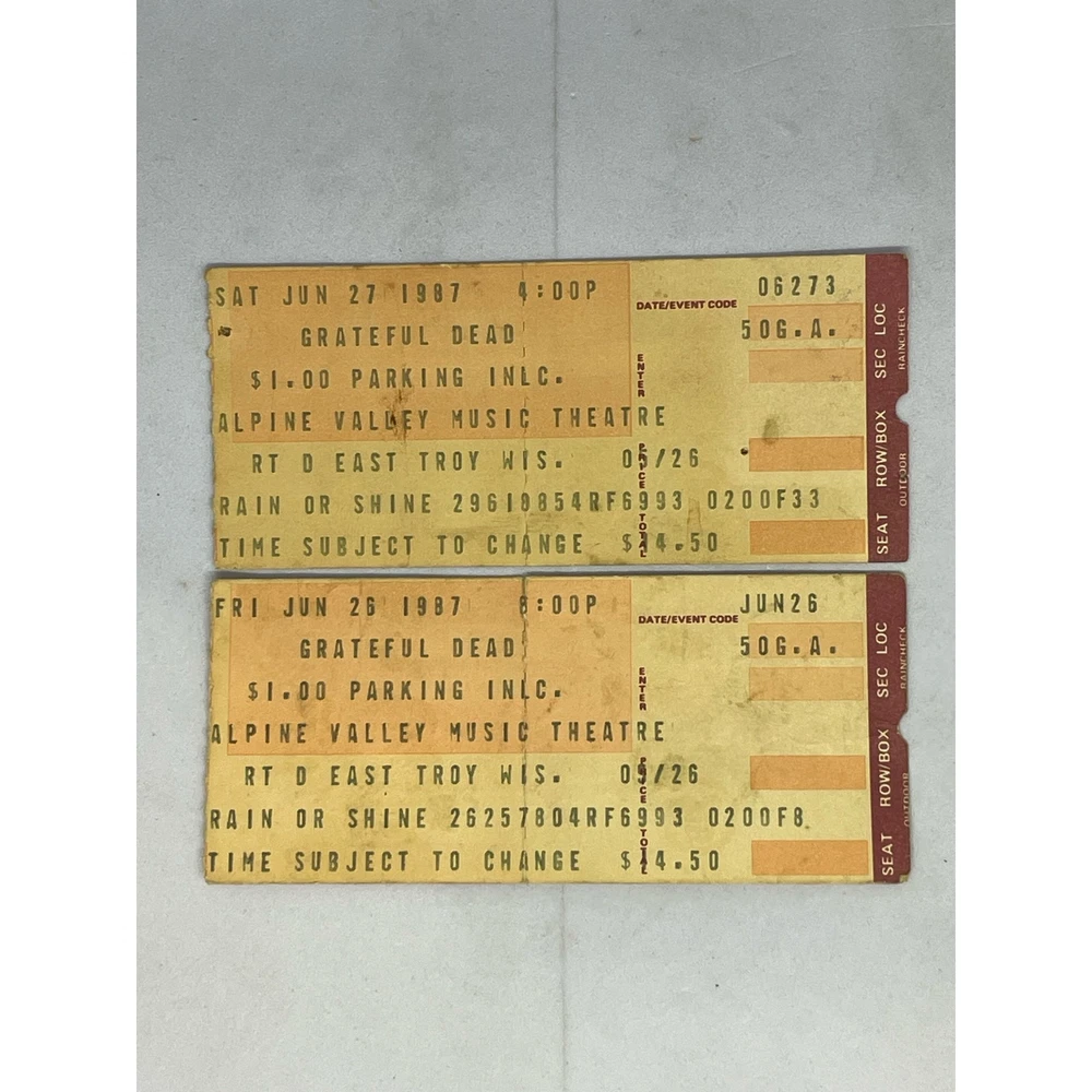 For sale is this lot of 2 Grateful Dead concert tickets. Vintage, dated June 26, 1987. Location was the Alpine Valley Music Theater, East Troy, Wisconsin. Ticketron. Good condition, minor wear consistent with age and use. See photos.