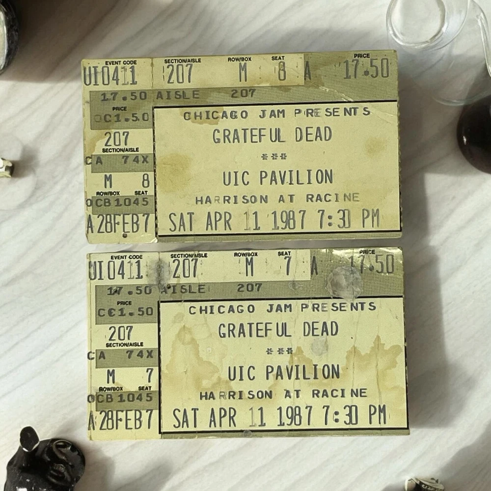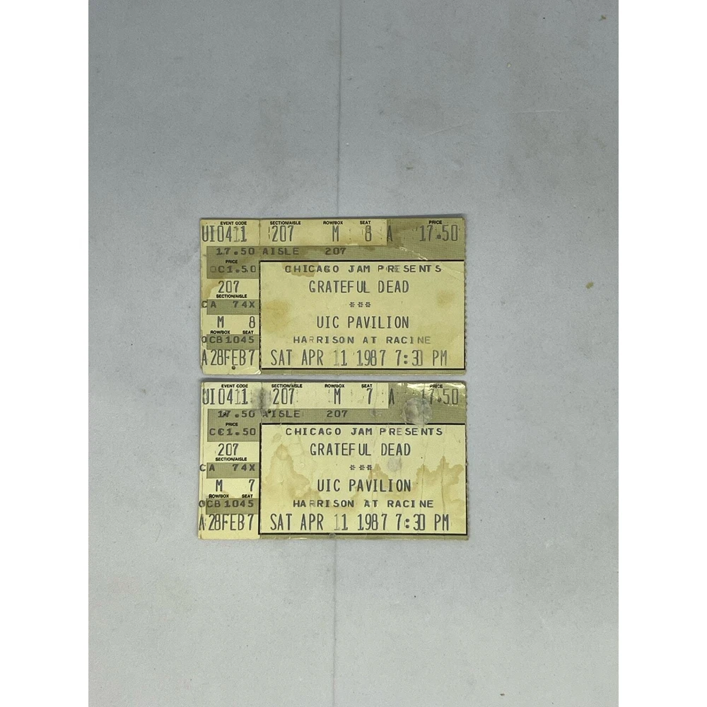 For sale is this lot of 2 Grateful Dead concert tickets. Vintage, dated April 11, 1987. UIC Pavilion (now the Credit Union 1 Arena), Chicago, Illinois. Budweiser advertising on reverse. Good condition, minor wear consistent with age and use. See photos.