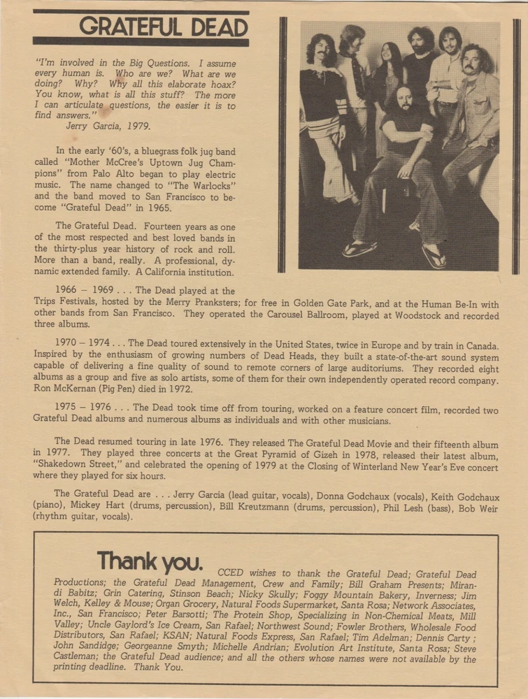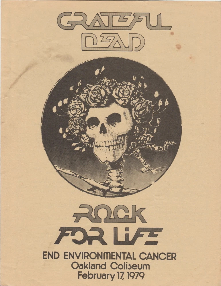 Original 1st printing 8&1/2 x 11" four-page concert program/information flyer for the Grateful Dead appearing in "Rock For Life", a benefit for the Campaign for Economic Democracy (a California-based housing/energy/environmental organization) at the Oakland Coliseum on 2/17/1979 (*Keith and Donna Godchaux last shows with the band) Design (cover) by Stanley Mouse and Alton Kelley, medium-thin flat stock program is in good (B) condition; there are a few thin bends/light creases here and there, plus a large vertical crease just to the right of the middle of the image area, a couple of soft stains and a decent-sized scuff mark on the cover, otherwise OK... pretty cool late-'70's Grtaeful Dead concert artifact . Please be sure to check our other listings for more original posters, handbills, and assorted music memorabilia. We are always getting new inventory so feel free to send us your want lists. Thanks for looking!