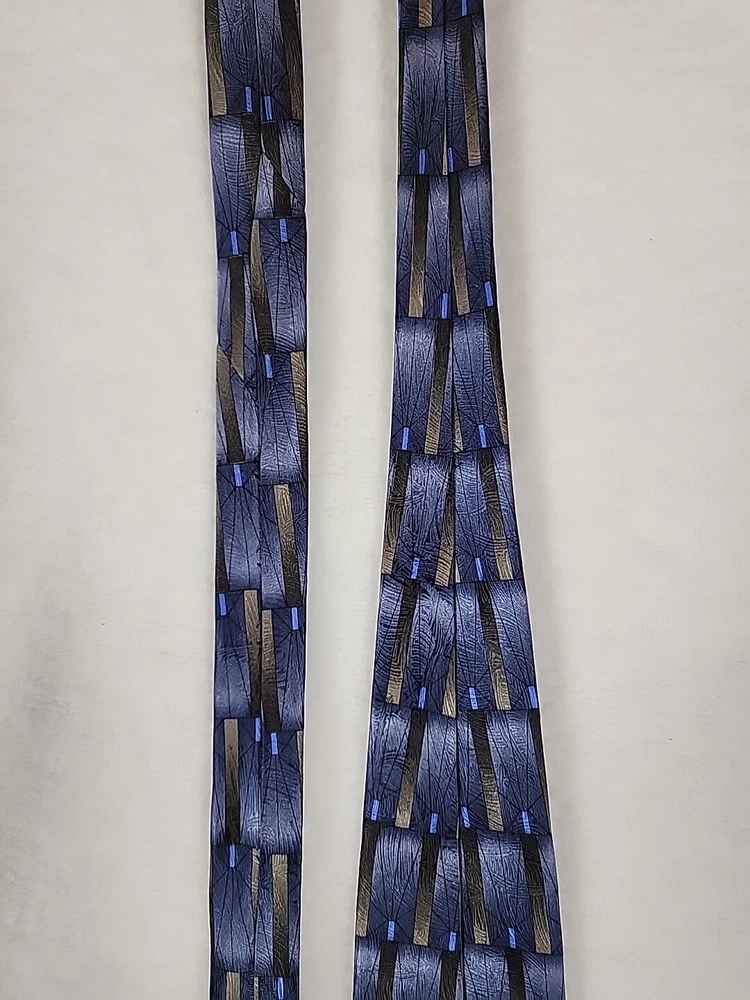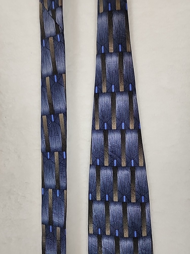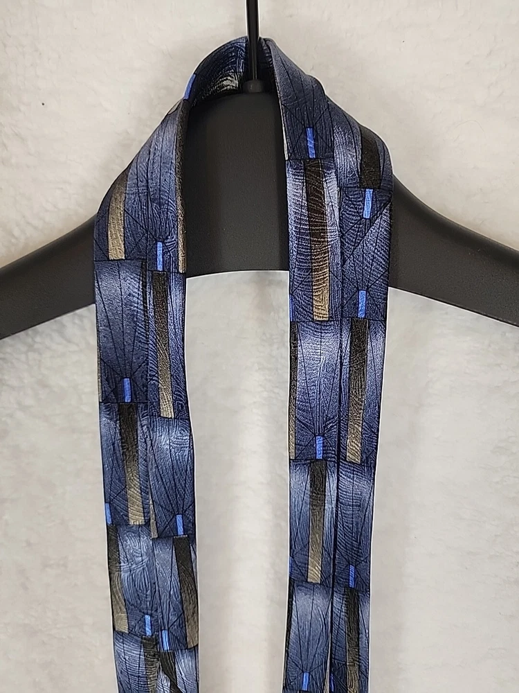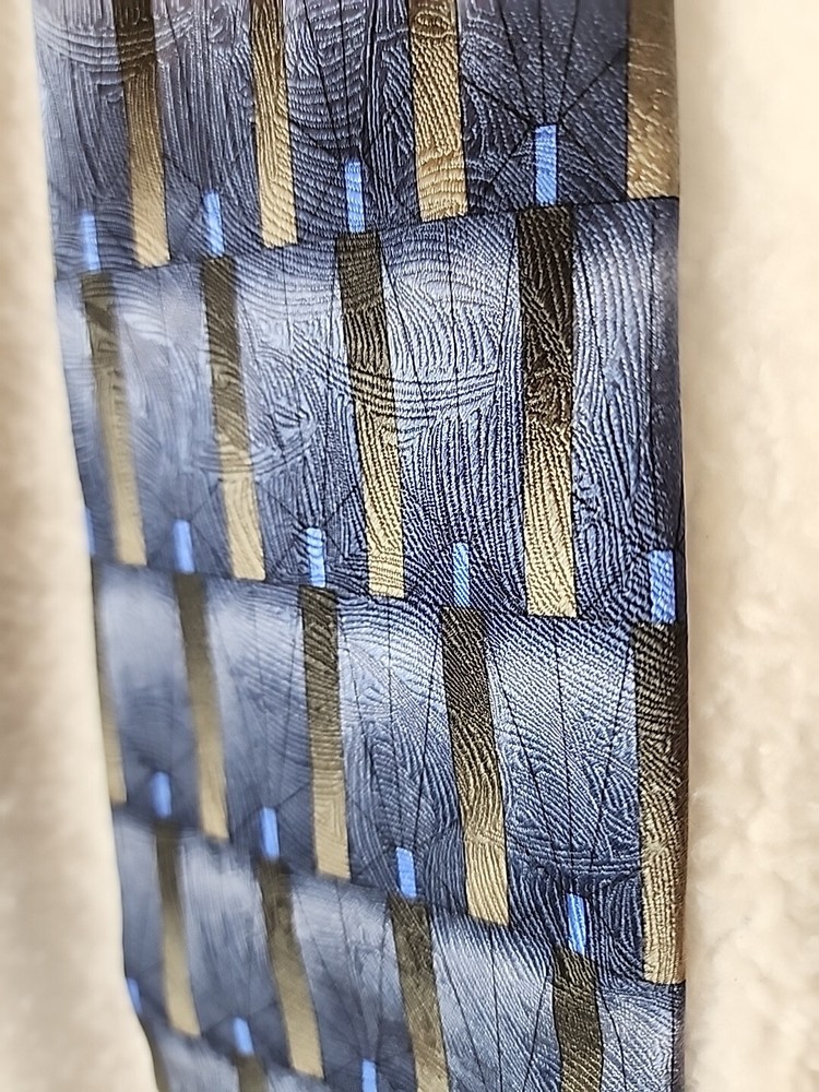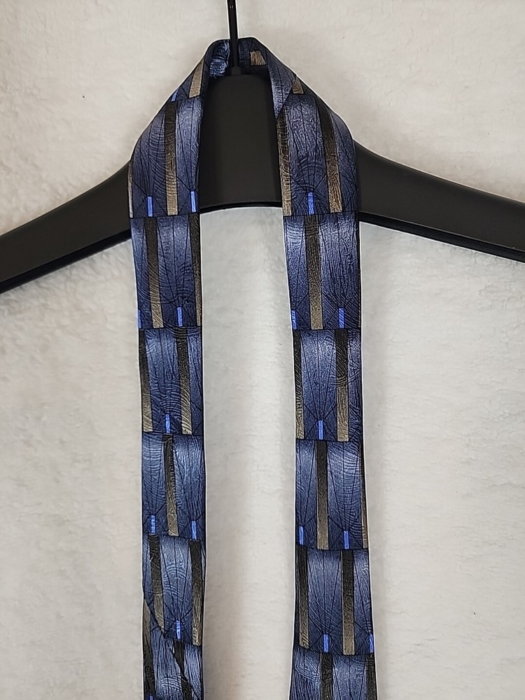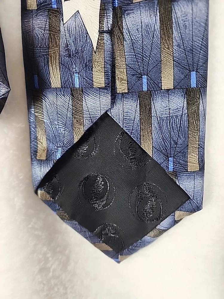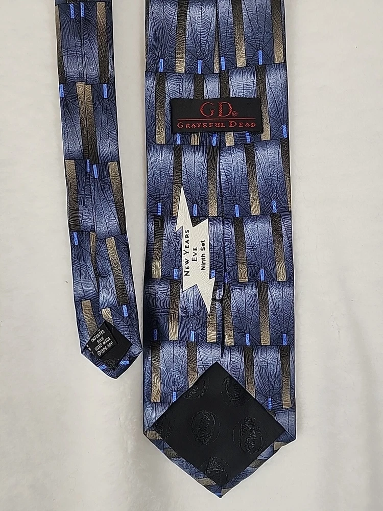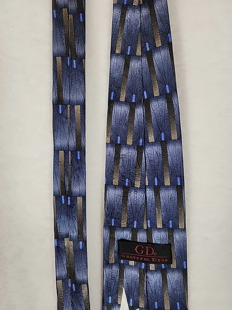 This unique Grateful Dead neck tie is a must-have for any hippie or collector enthusiast. Made of 100% silk and featuring a geometric pattern in gray, gold, and blue, this tie is a classic addition to any wardrobe. The tie's logo accents and vintage design add a touch of American music history to any outfit. Measuring 57-60 inches in length and 4 inches wide, this tie is perfect for any occasion. Imported from the United States, this designer piece is sure to turn heads. Don't miss your chance to add this Grateful Dead neck tie to your collection. Item is in Pre-owned condition and may show signs of wear. See pics for details. Email with any questions. Thanks for looking!