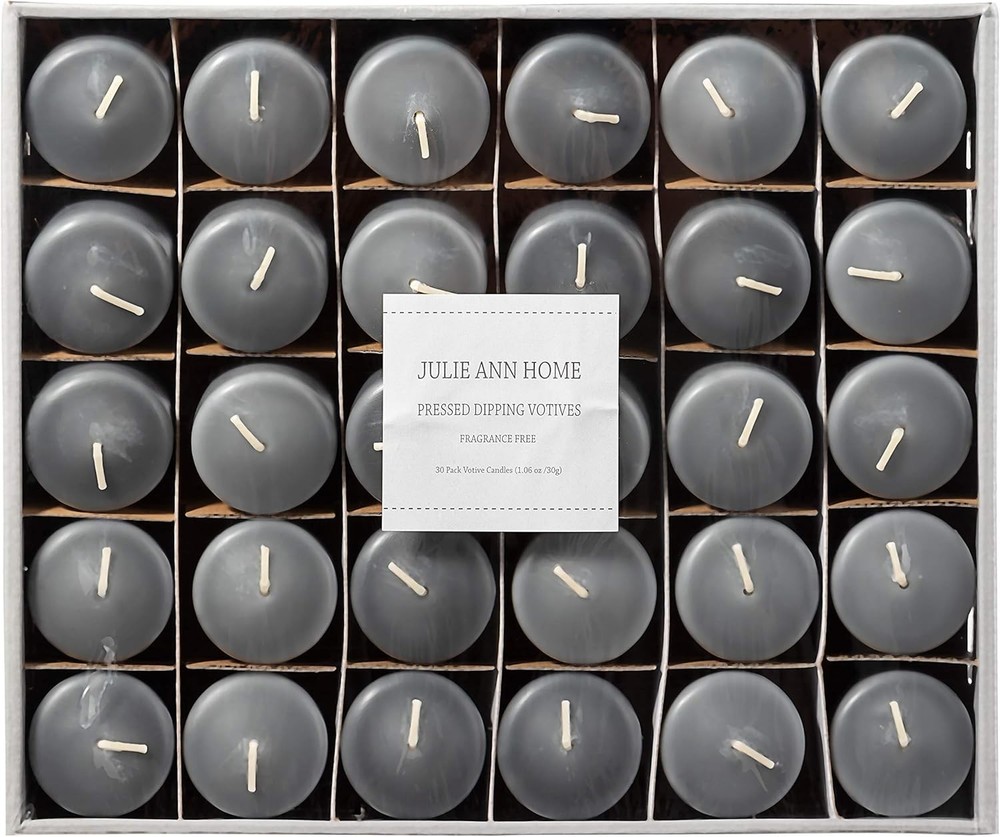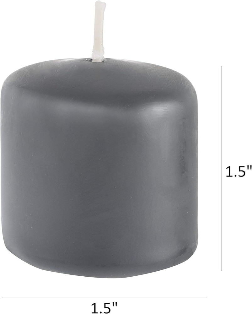 Grey Unscented Votive Candle - Set of 30 | Bulk Pack for Weddings, 30, Gray Product Details Brand: JULIE ANN HOME Color: Gray Product Dimensions: 1.5"W x 1.5"H Number of Items: 30 Scent: Unscented Are Batteries Included: No Indoor/Outdoor Usage: Indoor Specific Uses For Product: Decoration Shape: Round Material: synthetic, Glass Cotton Wax Container Material: Glass Occasion: Weddings,Bridal,Birthdays Seasons: All Season Special Feature: Unscented Style: Classic Wick Quantity: 1 Theme: Holiday Package Information: Can Unit Count: 30 Count Material Feature: hand-poured Size: 30 Manufacturer: C.G.G. INC. UPC: 850008975400 Item Weight: 2.29 pounds Special Features: Unscented Batteries Included?: No Batteries Required?: No Product Dimensions : 1.5 x 1.5 x 1.5 inches; 2.29 Pounds Manufacturer : C.G.G. INC. Brand: JULIE ANN HOME Color: Gray Product Dimensions: 1.5"W x 1.5"H Number of Items: 30 Scent: Unscented Are Batteries Included: No Indoor/Outdoor Usage: Indoor Specific Uses For Product: Decoration Shape: Round Material: synthetic, Glass Cotton Wax 30 PACK FRAGRANCE FREE VOTIVE CANDLE SET – Our classic and timeless unscented 30 pack of votive candles are fragrance free, hand poured wax and crafted to provide an elegant and beautiful look. MULTIPLE EVERYDAY USES – These versatile votive candles can be used in many different ways from weddings, home décor, outdoor party decorations, restaurants, romantic ambiance, DIY decorating, birthdays, centerpieces and much more. The perfect touch to create a relaxing and soothing atmosphere. HIGHEST QUALITY FOR CLEAN BURN – Julie Ann Home Votive candles are made with lead-free 100% cotton wicks for a clean and smoke free burn. Our votive candles packs are hand poured, and feature cotton core wicks which causes the candles to burn clean, evenly, and environmentally responsibly. PERFECT SIZE - Each votive candles are the perfect size for small, medium, or large candle lanterns, glass hurricanes, centerpieces, mantel decorations, table décor. Decorate and create the perfect look however you want using these pressed votives. BULK SUPPLY – Make your shopping easy with our huge 30 pack supply. Perfect amount for decorating an event or party.
