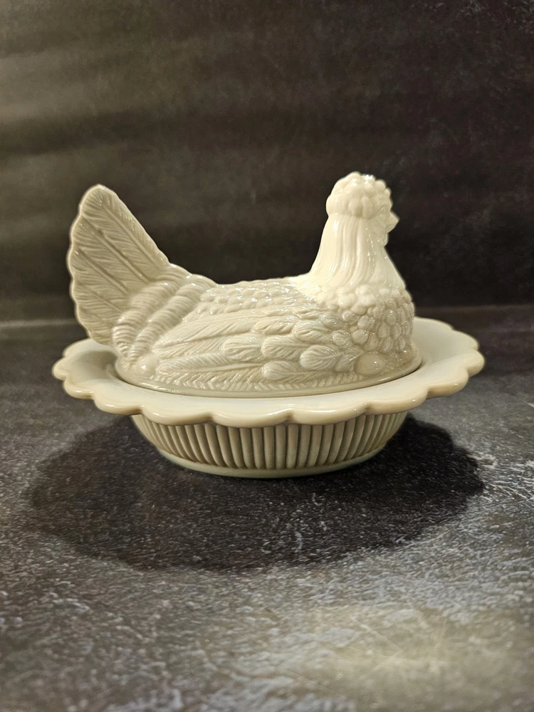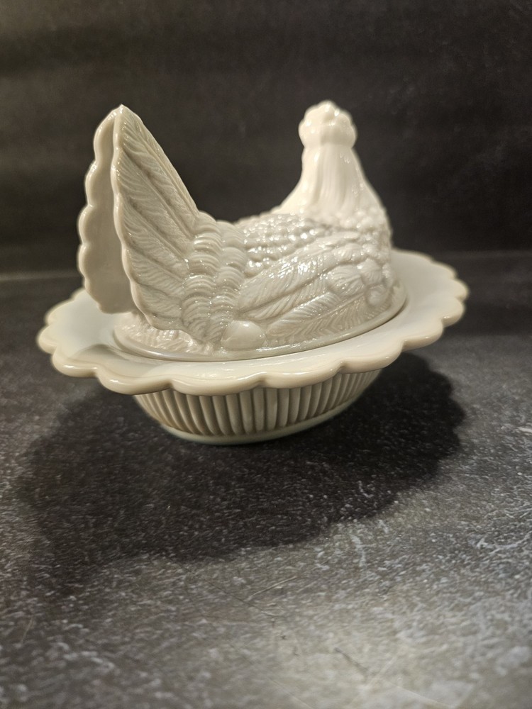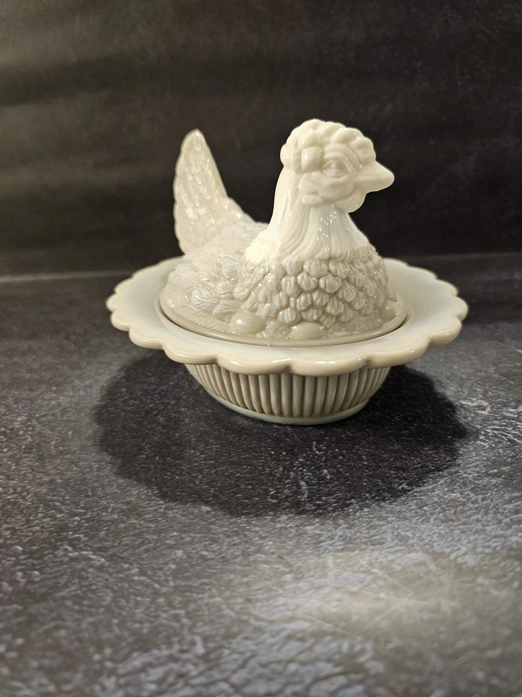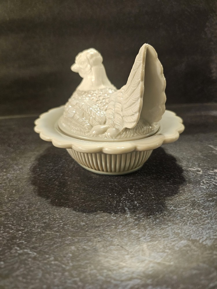 No chips or cracks excellent condition This rare vintage slag glass hen on a nest candy/trinket dish features a swirl pattern in a gray color. The decorative figurine is a unique piece with a glossy finish, depicting a hen and roaster design typical of roosters and chickens. Made in the United States with pressed glass technique, this original and collectible item adds a touch of charm to any decor. Perfect for those who appreciate vintage and handmade pieces, this stylish and textured piece is sure to be a conversation starter in any home.