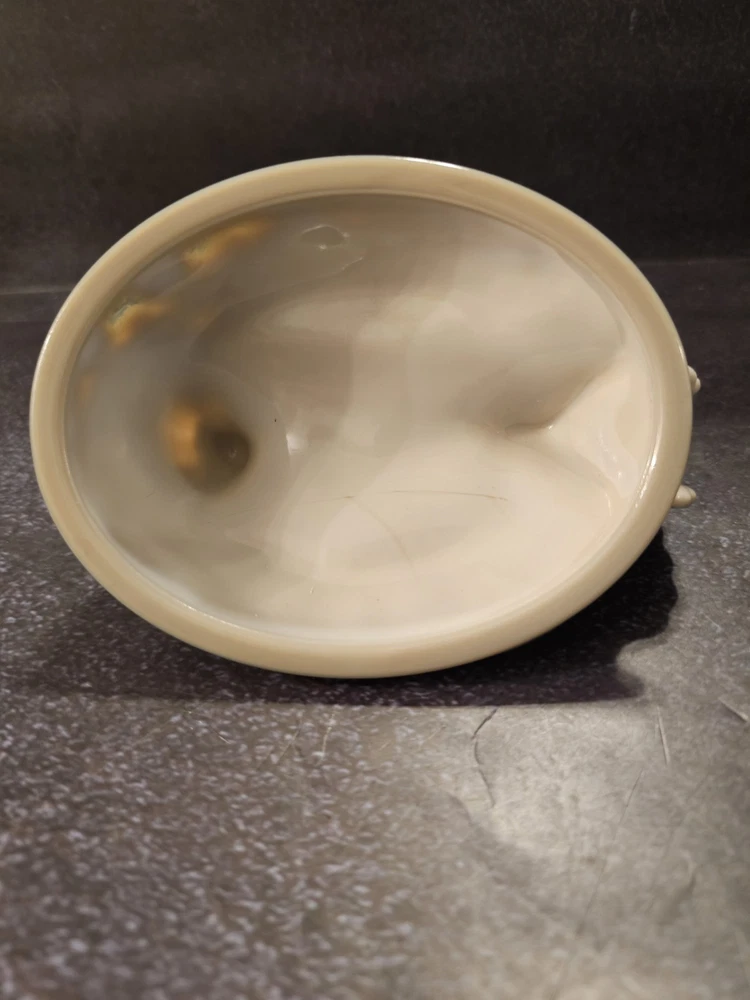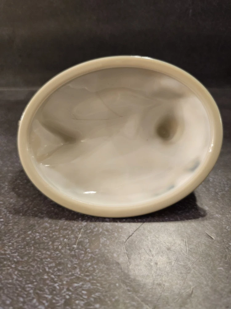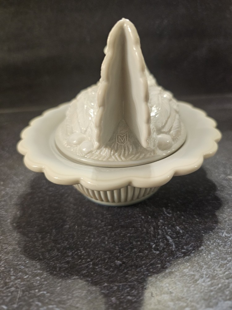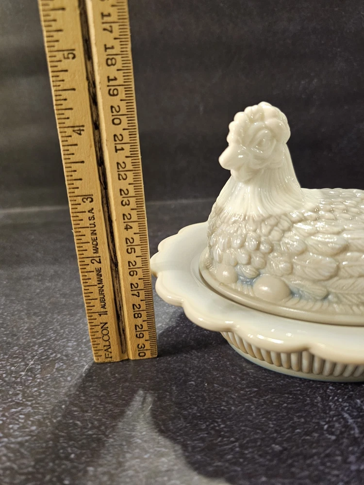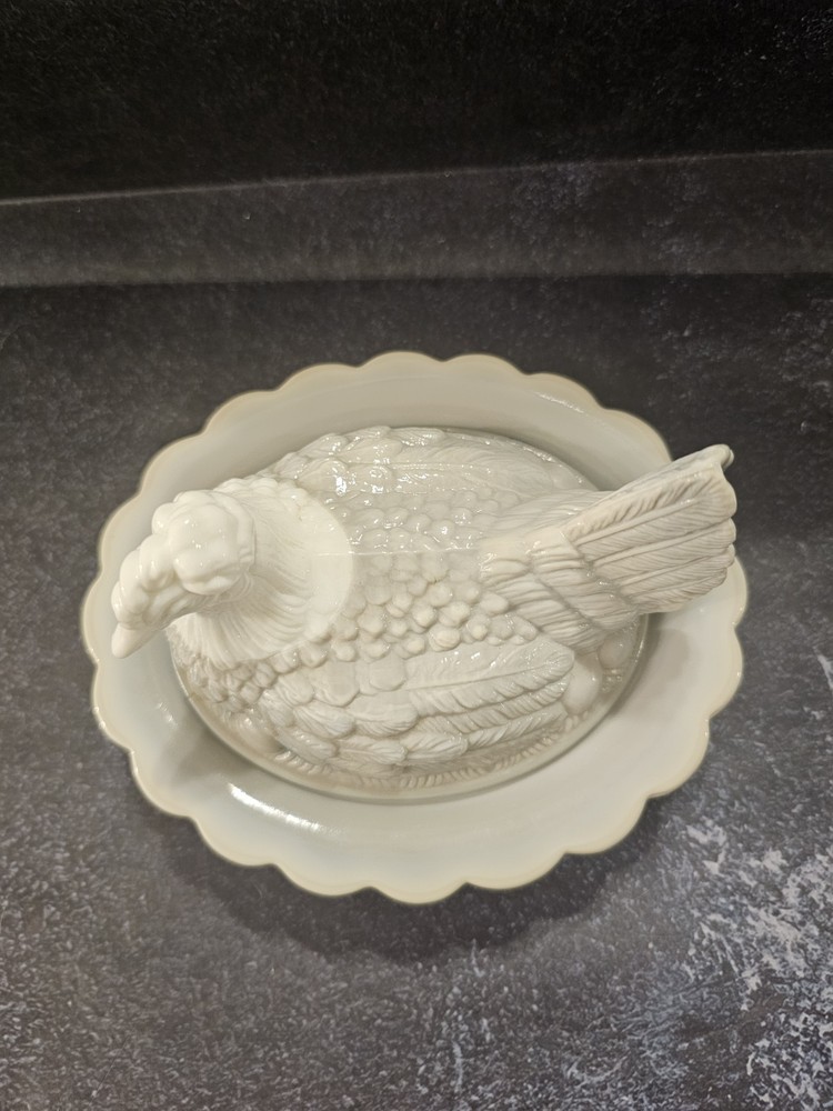No chips or cracks excellent condition This rare vintage slag glass hen on a nest candy/trinket dish features a swirl pattern in a gray color. The decorative figurine is a unique piece with a glossy finish, depicting a hen and roaster design typical of roosters and chickens. Made in the United States with pressed glass technique, this original and collectible item adds a touch of charm to any decor. Perfect for those who appreciate vintage and handmade pieces, this stylish and textured piece is sure to be a conversation starter in any home.