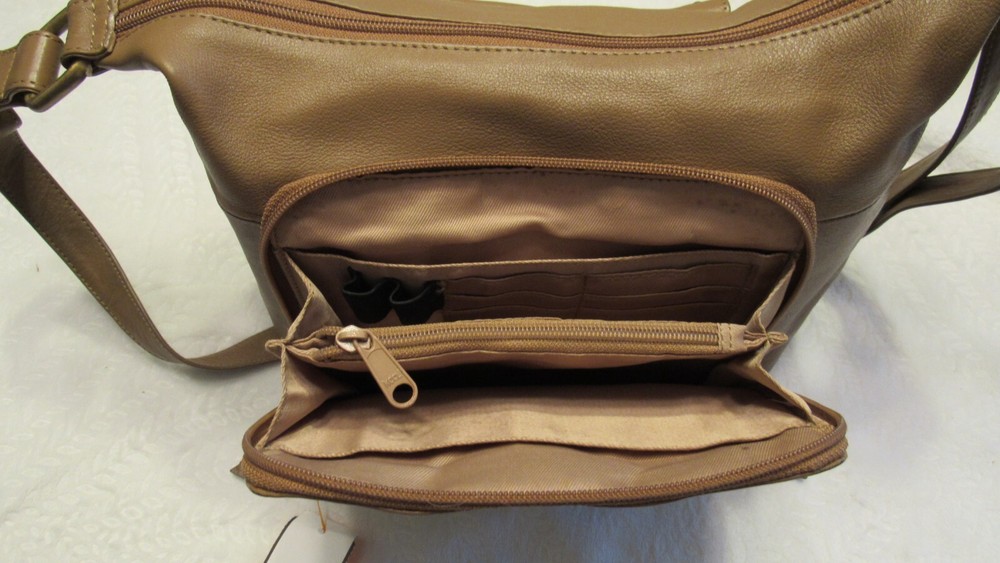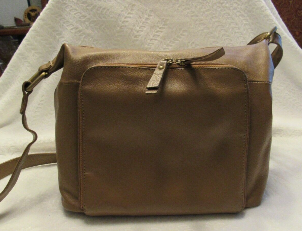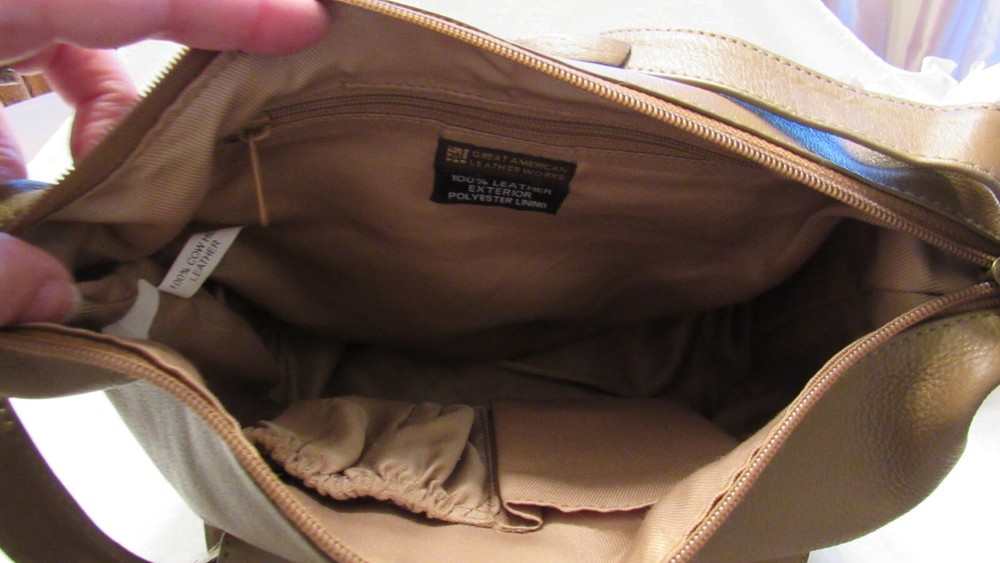 Pre-owned in good condition with minor wear - see photos This Great American Leather Works crossbody organizer bag in tan brown is a stylish and functional accessory for any occasion. With a solid pattern and pebbled finish, this medium-sized bag features a zip closure and adjustable leather strap for a comfortable fit. The bag has a gold hardware color and a zippered accent. The interior is lined with tan fabric and includes inner pockets for easy organization.