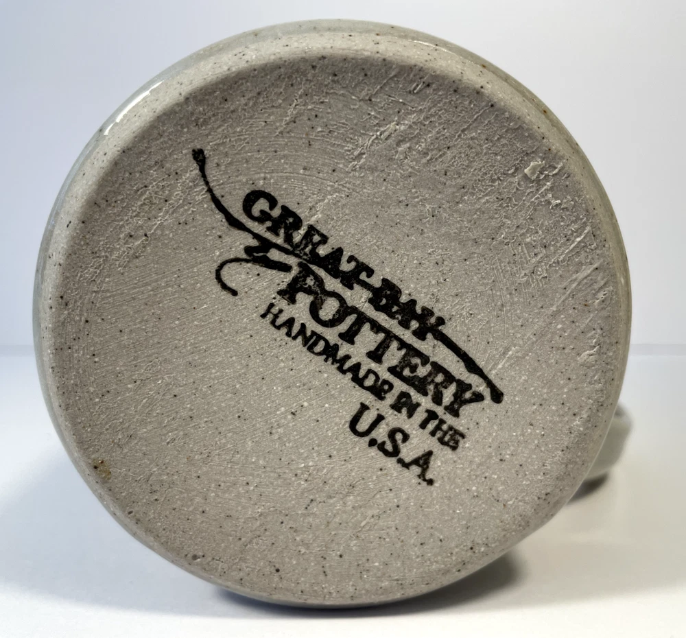 This Great Bay Pottery mug from North Hampton, NH is handmade from stoneware and features a round shape with a glossy finish. The mug is adorned with a heart theme, making it suitable for all occasions, including Valentine's Day. It has a printed back stamp and a 4-inch diameter, standing at 4.375 inches tall and weighing 13.5 oz. This original coffee cup is a piece of art pottery, showcasing the craftsmanship and creativity of the United States-made product.