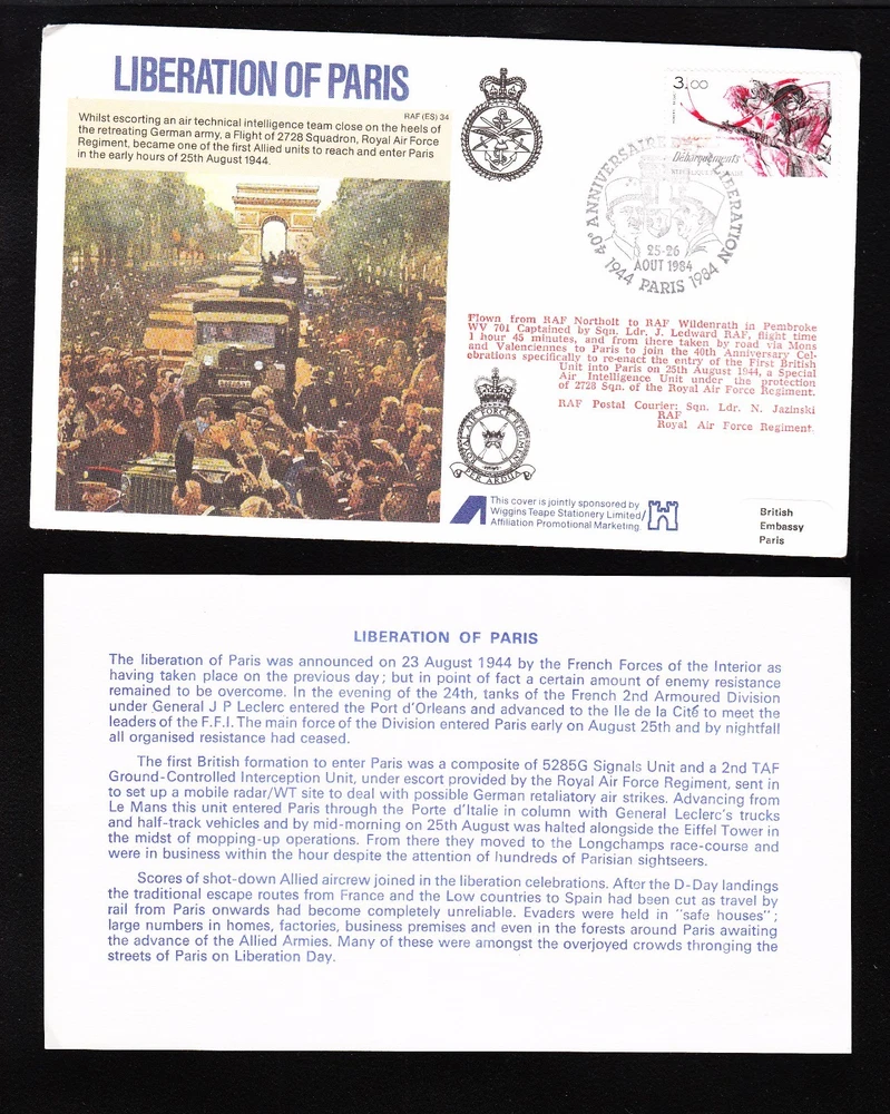 Click Here To Visit My eBay Store Who/What : . .. Great Britain Flown Cover WWII RAF LIberation of Paris France 1984 & Insert . . Backstamped. Note: Top corners have bends. Location Number: 020215 1. Thank you: We appreciate your business! Please do not hesitate to ask questions before purchase or placing a bid. 2. Please note: eBay USA and eBay.de have informed me (many different answers and interpretations of their rules ) that if you live in Germany, France, Austria you are not allowed to buy Third Reich stamps that depict Hitler although they are for sale in the thousands on your home country eBay sites. Additionally, you may not buy covers that are ANTI-Hitler. It is very confusing to me but in order to protect my account, I must exclude some countries from my shipping list. Please do not bid on these stamps or covers. Contact customer service if this is not a correct interpretation of eBay rules in your country or contact your government officials and petition them to allow stamps collectors to be stamp collectors without restrictions. 3. Satisfaction Guaranteed. All items are original unless specified otherwise. Important Foreign Shipping Note All foreign mailings must now use the USPS International First Class Small Parcel rate when applicable by size and weight instead of the cheaper USPS International First Class Letter rate that I have used for 10 years to save postage charges for international customers. This unfortunate action by the USPS has significantly increased the postage charges for foreign locations. I am sorry for this USPS decision that will now affect not only me but also so many of my foreign friends who have made purchases from me in the past by raising the cost of international business dealings. Postage cost refunds will be given when warranted but these refunds will only be a few dollars depending upon what part of the world the USPS service is covering.