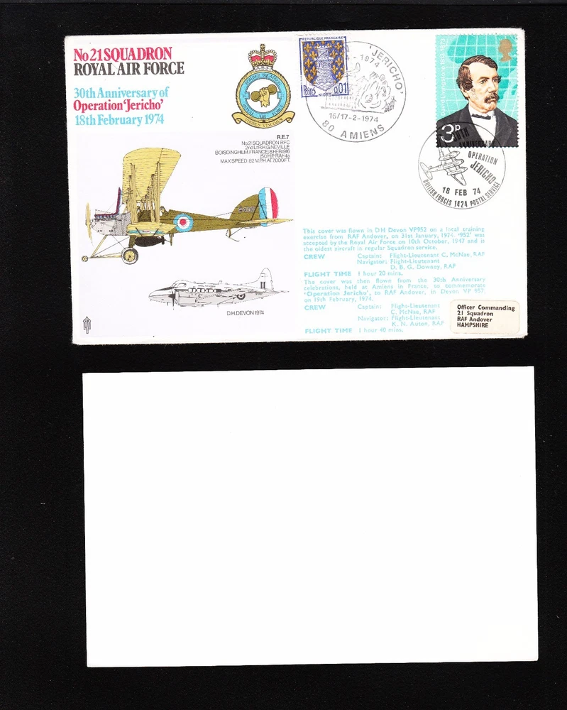 Click Here To Visit My eBay Store Who/What : . .. Great Britain & France Flown Cover RAF WWII Operation Jericho 1974 Insert Card . . Backstamped. Location Number: 020215 1. Thank you: We appreciate your business! Please do not hesitate to ask questions before purchase or placing a bid. 2. Please note: eBay USA and eBay.de have informed me (many different answers and interpretations of their rules ) that if you live in Germany, France, Austria you are not allowed to buy Third Reich stamps that depict Hitler although they are for sale in the thousands on your home country eBay sites. Additionally, you may not buy covers that are ANTI-Hitler. It is very confusing to me but in order to protect my account, I must exclude some countries from my shipping list. Please do not bid on these stamps or covers. Contact customer service if this is not a correct interpretation of eBay rules in your country or contact your government officials and petition them to allow stamps collectors to be stamp collectors without restrictions. 3. Satisfaction Guaranteed. All items are original unless specified otherwise. Important Foreign Shipping Note All foreign mailings must now use the USPS International First Class Small Parcel rate when applicable by size and weight instead of the cheaper USPS International First Class Letter rate that I have used for 10 years to save postage charges for international customers. This unfortunate action by the USPS has significantly increased the postage charges for foreign locations. I am sorry for this USPS decision that will now affect not only me but also so many of my foreign friends who have made purchases from me in the past by raising the cost of international business dealings. Postage cost refunds will be given when warranted but these refunds will only be a few dollars depending upon what part of the world the USPS service is covering.
