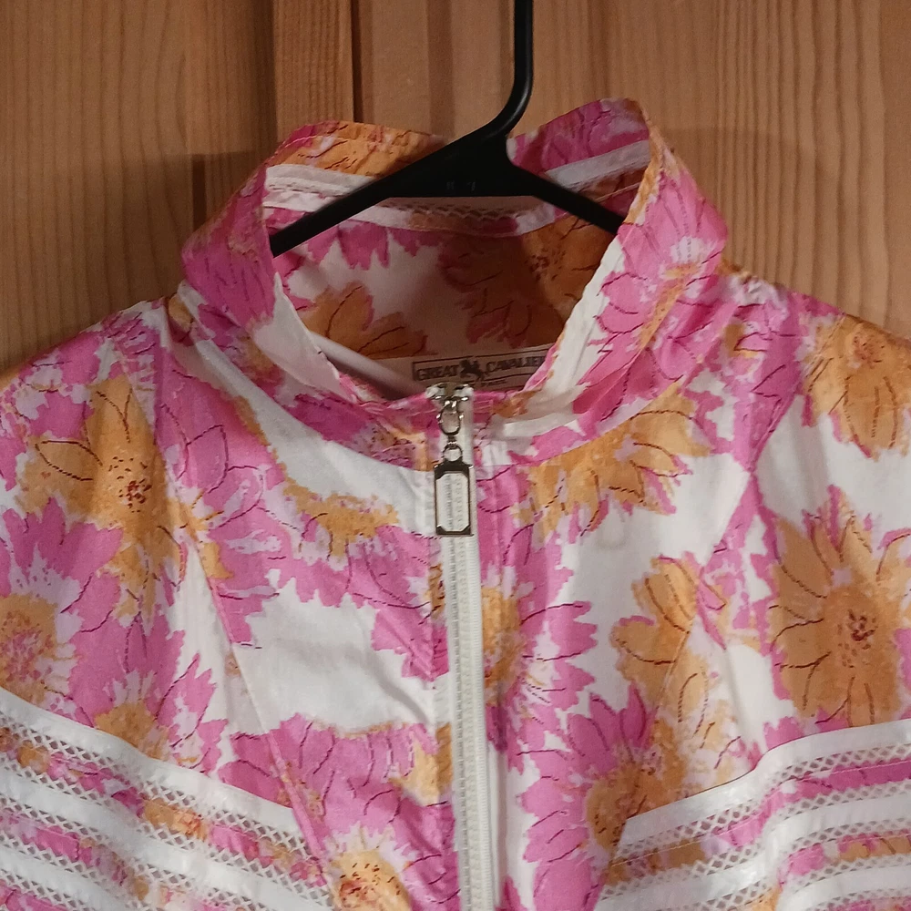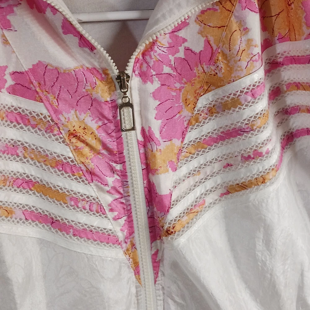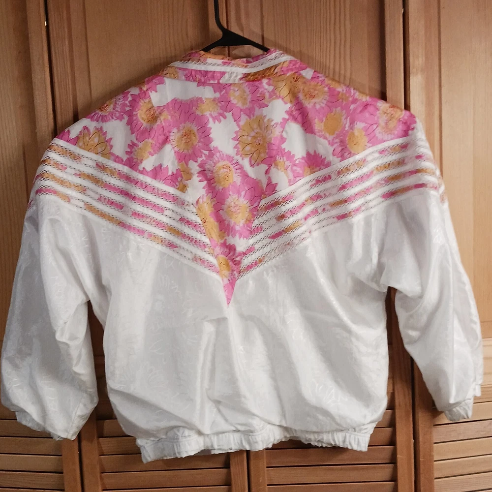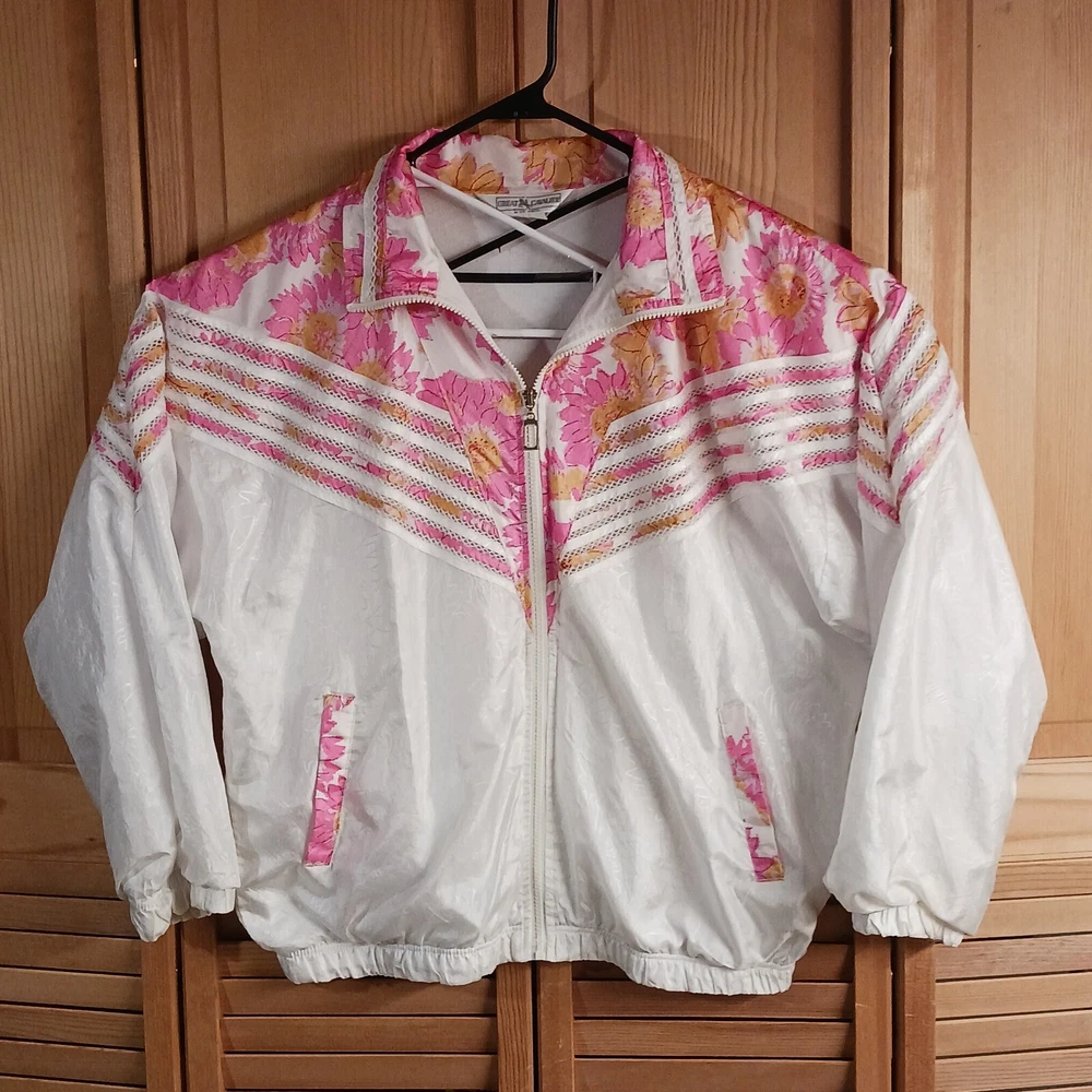 Size Type: Regular Theme: 80s, 90s, Retro Color: Pink Sleeve Length: Long Sleeve Department: Women Lining Material: Polyester Closure: Zip Style: Windbreaker Fabric Type: Softshell Pattern: Floral Accents: Zipper Season: Fall, Spring Jacket/Coat Length: Short Type: Jacket Features: Lightweight, Oversized, Pockets, Shoulder Pads Outer Shell Material: Nylon Brand: Great Cavalier Size: XL Vintage: Yes