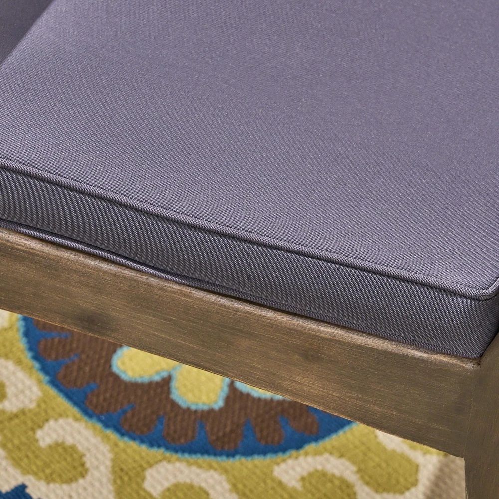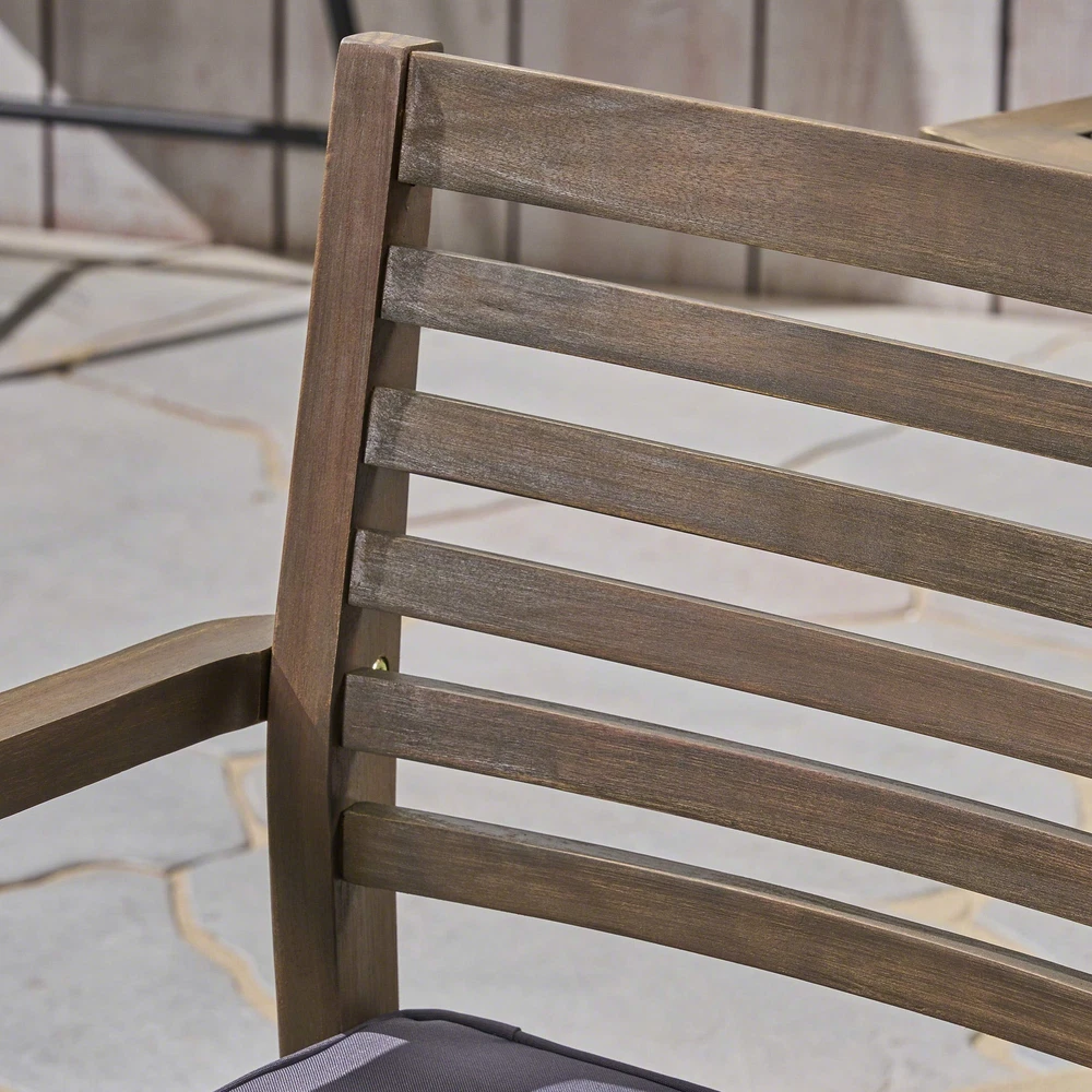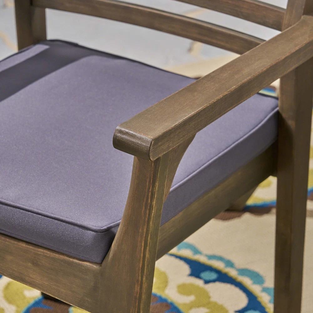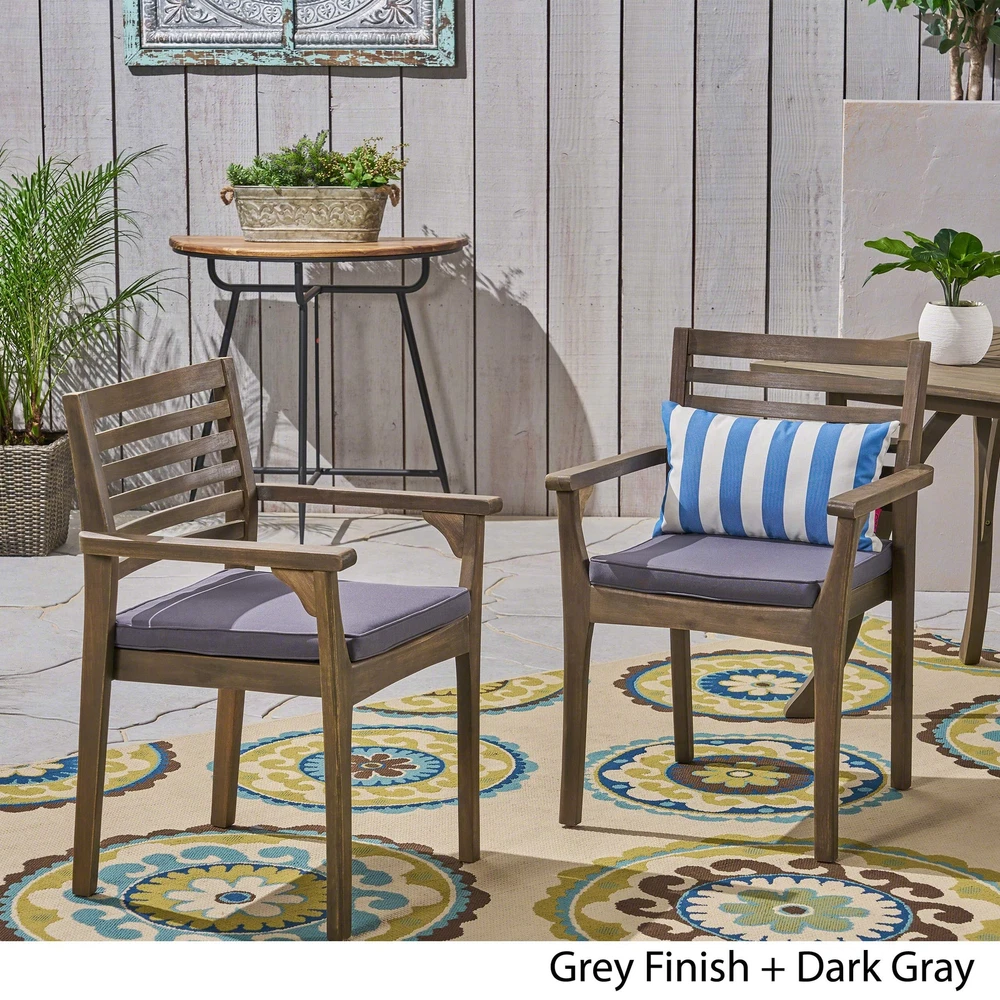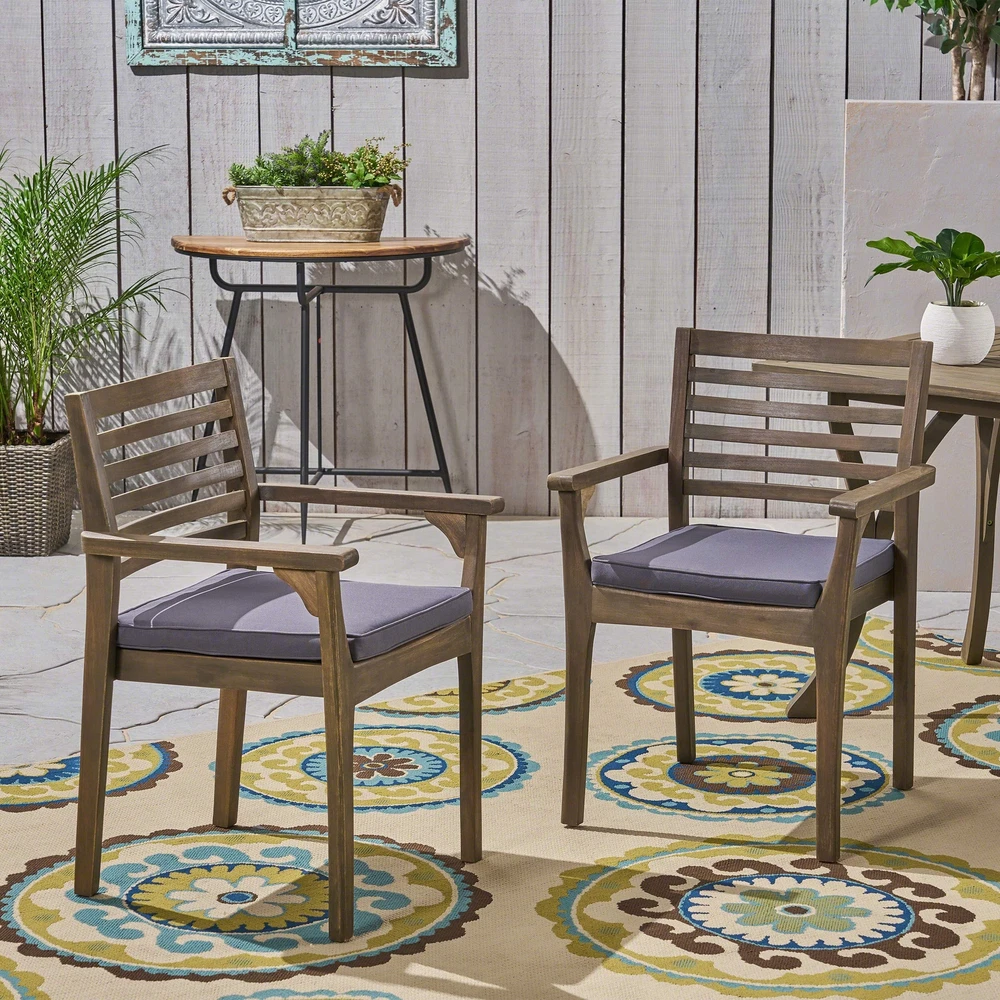 Treat your patio space to this elegant and classic dining chair set. With lovely curves complemented by straight edges, this dining chair is an ideal match for any rustic look. Including water-resistant cushions that have a built-in Velcro strap, these chairs are also a practical addition to any backyard space. Includes: (2) Dining Chairs Frame Material: Acacia Wood Cushion Material: Water-Resistant Fabric Fabric Composition: 100% Polyester Frame Finish: Gray Cushion Color: Dark Gray Hand-Crafted Details Some Assembly Required Product Dimensions: 22.75 inches deep x 22.75 inches wide x 33.25 inches high Seat Dimensions: 18.00 inches deep x 18.00 inches wide x 17.50 inches high Arm Height: 25.50 inches high. ACACIA WOOD - This frame consists of an acacia hardwood that accents the wicker seat. This material is washed with a complementing finish and maintains a sturdy foundation for the sofa that can withstand most weather conditions. WATER RESISTANT CUSHIONS: These padded cushions are made for your comfort with Velcro ties that prevent your cushions from sliding or blowing away in the wind. These water-resistant cushions bring enjoyment without the worry of dealing with spills or any other little accidents you might have. DURABLE AND STYLISH - Our sturdy acacia wood frames not only offers plenty of support and glamor to your patio space, but they will also complement any scheme of décor. Featuring a traditional wood slat look, this classic style takes on a modern upgrade with its straight, clean lines and curved accents. EASY TO MAINTAIN: This set is naturally weather resistant to most elements and its lifespan can be extended by covering or storing your cushions when not in use. Apply teak oil as needed to maintain appearance. ASSEMBLY REQUIRED: Some assembly is required for this chair. All of the instructions and tools needed for assembly are included.