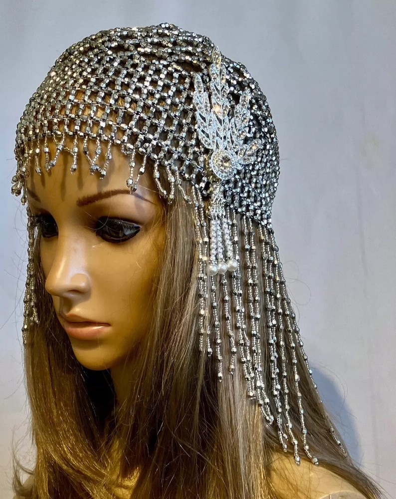 The Great Gatsby Art Deco Flapper 1920s Hat is a stylish and glamorous accessory for women who love the vintage elegance of the jazz era. This silver-colored bonnet-style hat has a classic and sophisticated look. One size fits all, making it a versatile piece that can complement a variety of outfits, perfect for adding a touch of sparkle to any ensemble. Ideal for women who appreciate the glamour and flair of the 1920s, this cloche hat exudes charm and elegance.